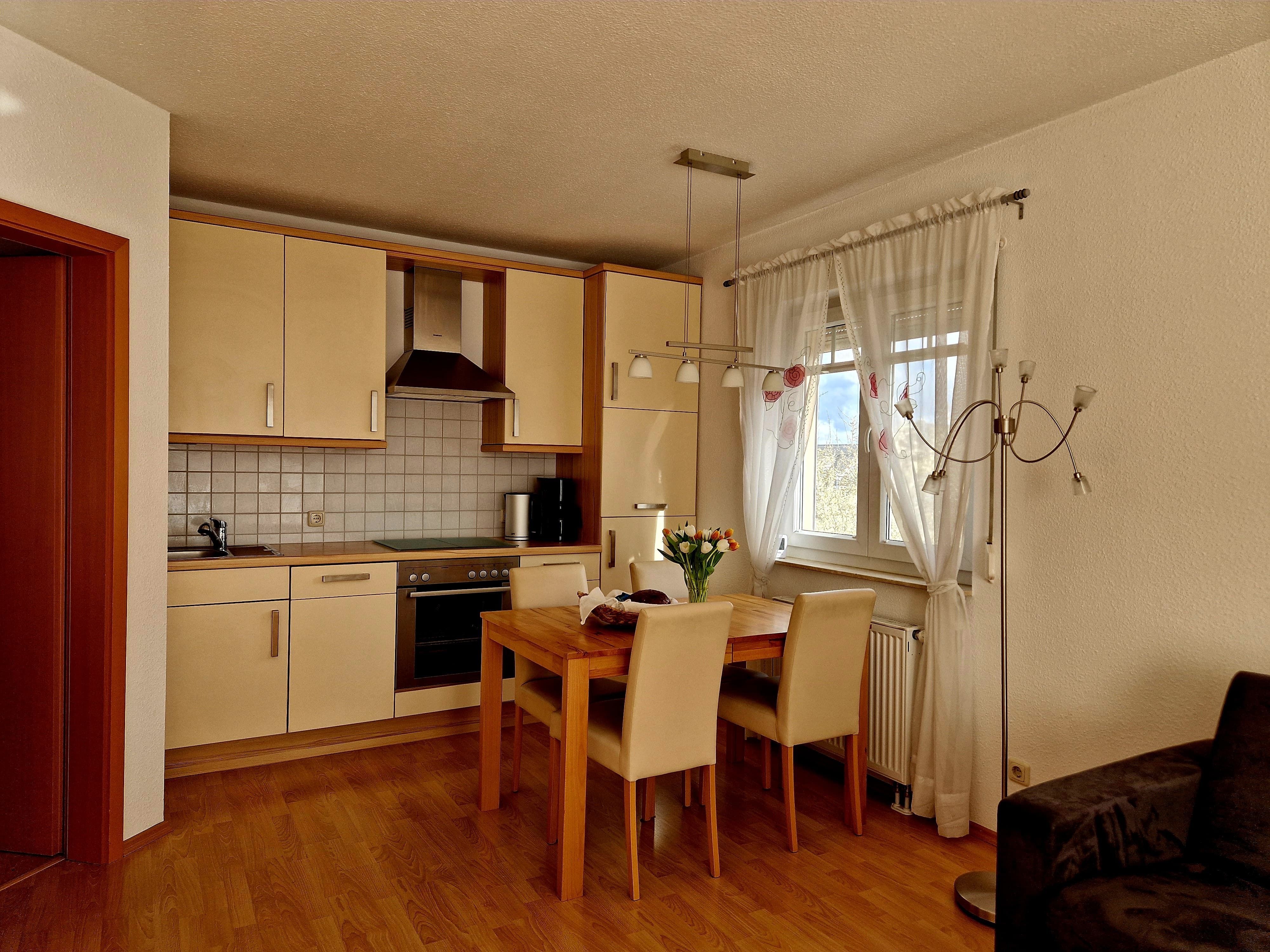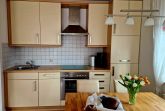 • Küche: offene Wohnküche und Essbereich für 4 Personen, komplett eingerichtete Einbauküche mit Backofen, Cerankochfeld, Geschirrspüler, Kühlschrank mit Gefrierfach, Mikrowelle, Wasserkocher, Kaffeemaschine, Toaster