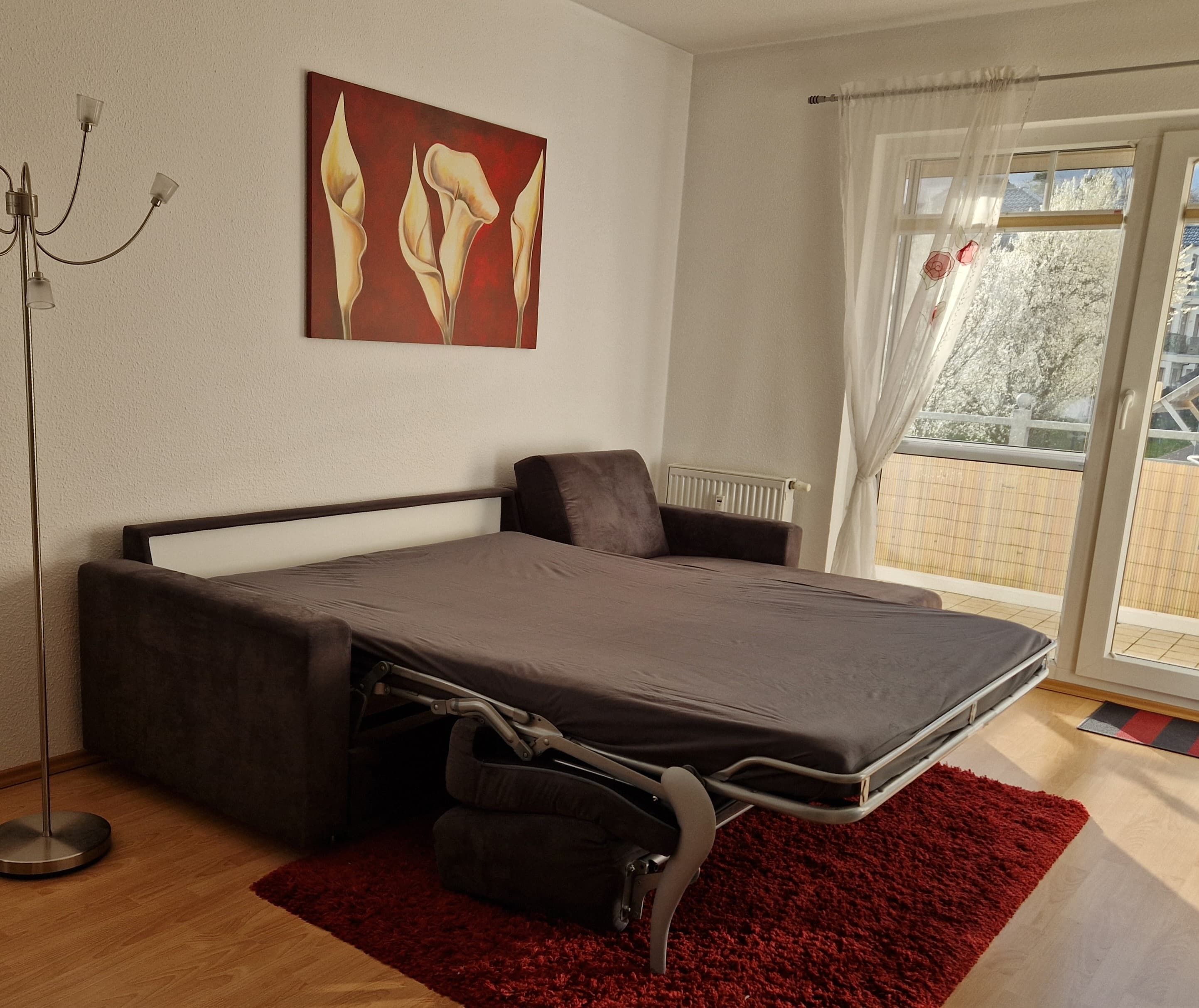 • Wohnzimmer: Gemütliche Schlafcouch aus Textil mit einer Fläche von 140x200 cm, Tisch, Sideboard, TV, DVD-Player, CD-Radio, Leselampe