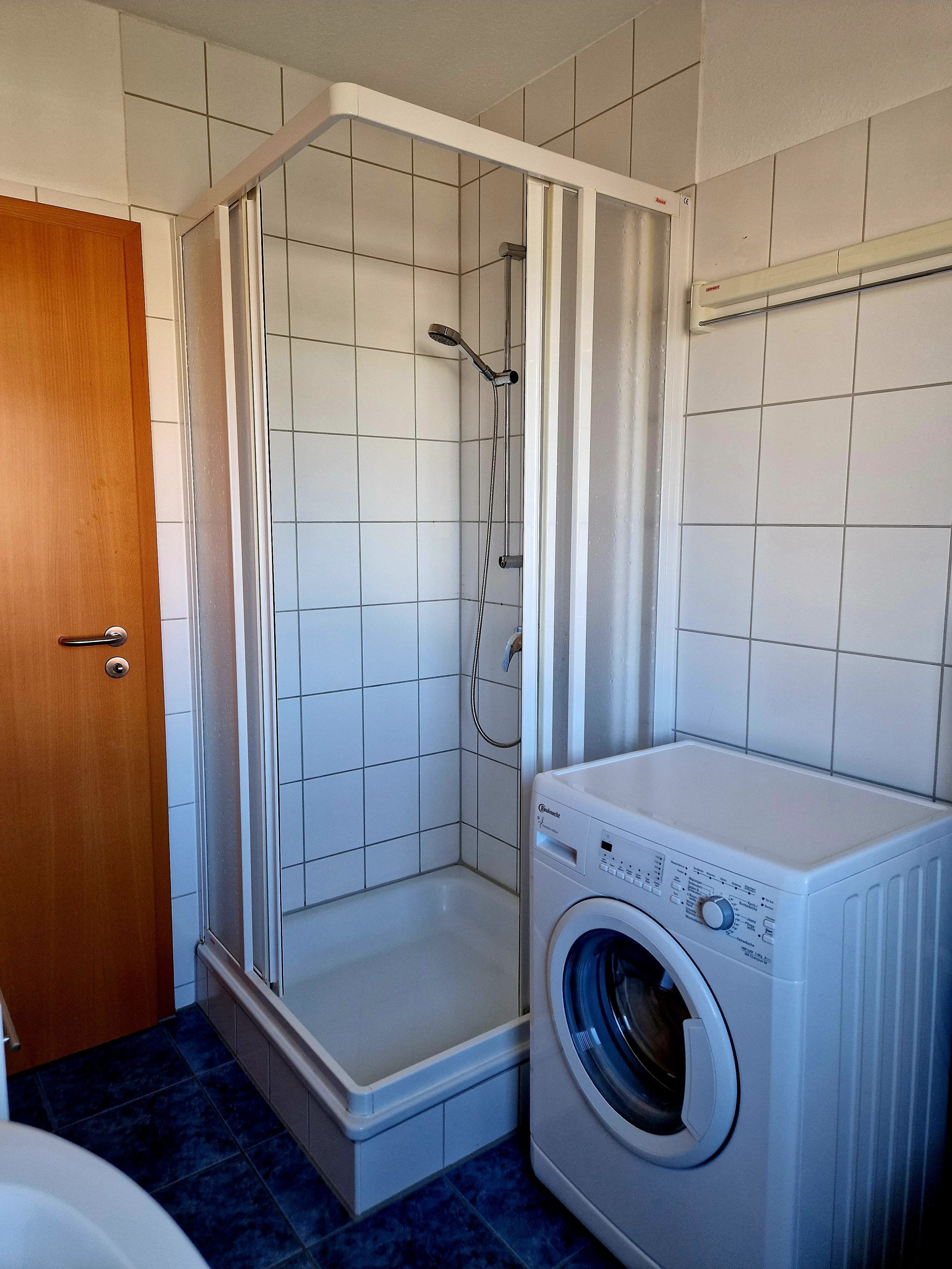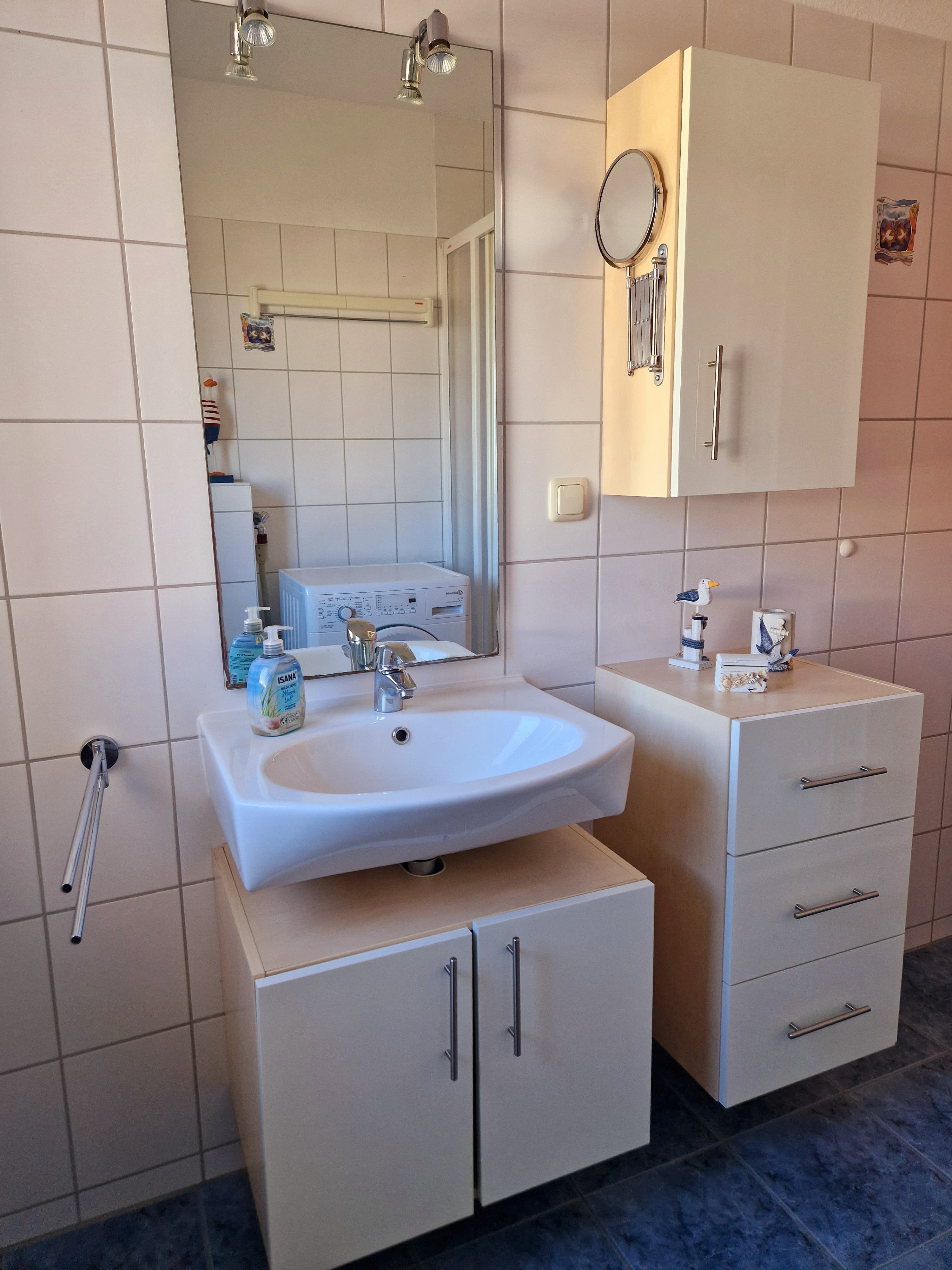 • Bad: mit Fenster, Dusche, Waschbecken, Toilette, Schränke, Handtuchhalter, Waschmaschine
