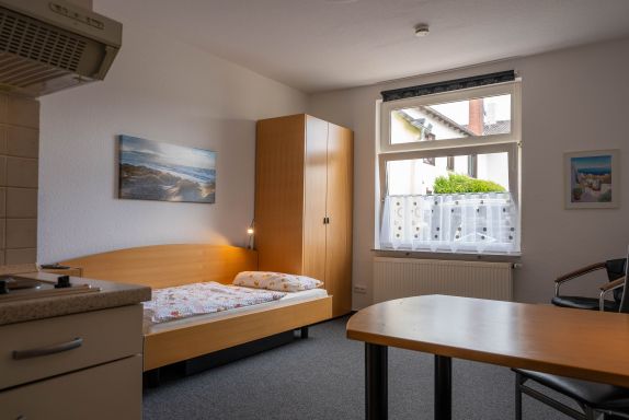 Die ca. 30 m² große Wohnung ist für 1 Person geeignet. Die Wohnung ist zentral gelegen und befindet sich im Erdgeschoß eines Mehrfamilienhauses. Schnell sind Sie in Wilhelmshavens Innenstadt sowie am Jadebusen. Ein Bad mit Dusche sowie eine Küchezeile und selbstverständlich WLAN runden das Angebot dieser kleinen Wohnung ab. Sie ist ideal für eine Einzelperson sei es als Urlauber oder Geschäftsreisender. Draußen im Hof bietet das Ferienhaus Renken mit seinen 4 Wohnungen drei PKW-Stellplätze an.