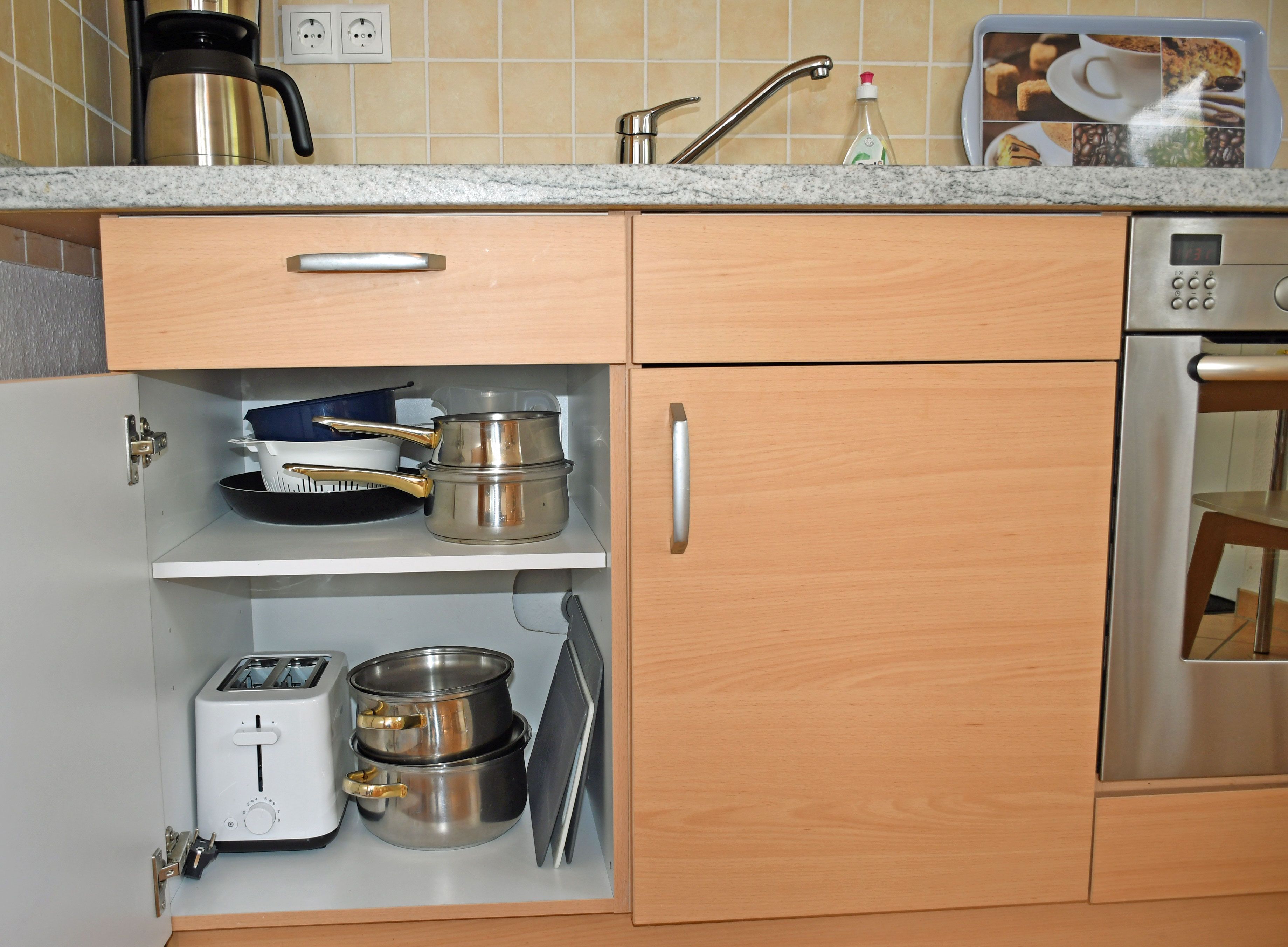 o   einen Wohnbereich mit heller Wohnküche und Esstisch für 2, Ofen, Kochfeld, Kühlschrank mit Gefrierfach, Kaffeemaschine, Wasserkocher, Toaster, SAT-TV