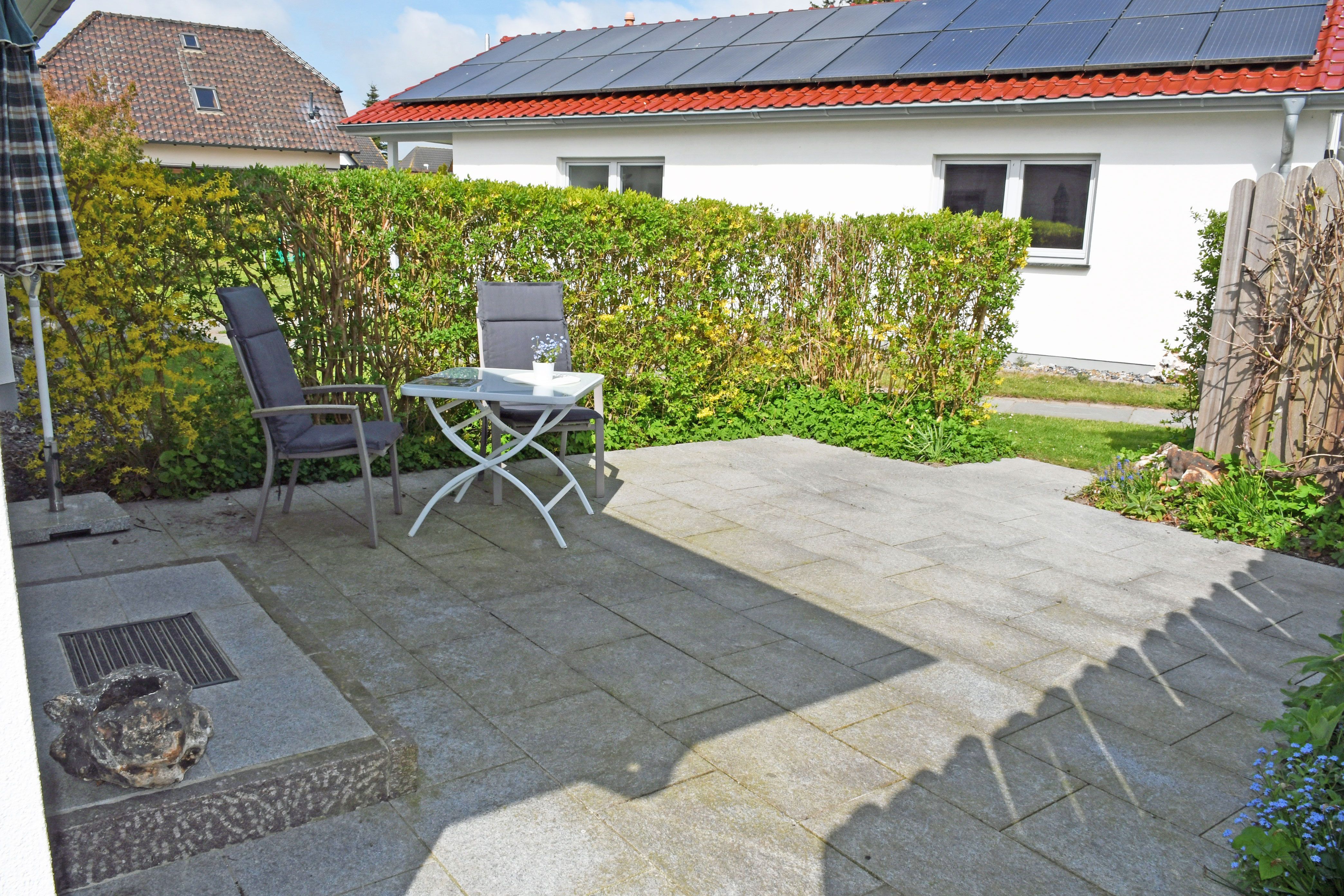 o   eine gemütliche Terrasse im Grünen mit Tisch und bequemen Stühlen mit Sitzpolstern