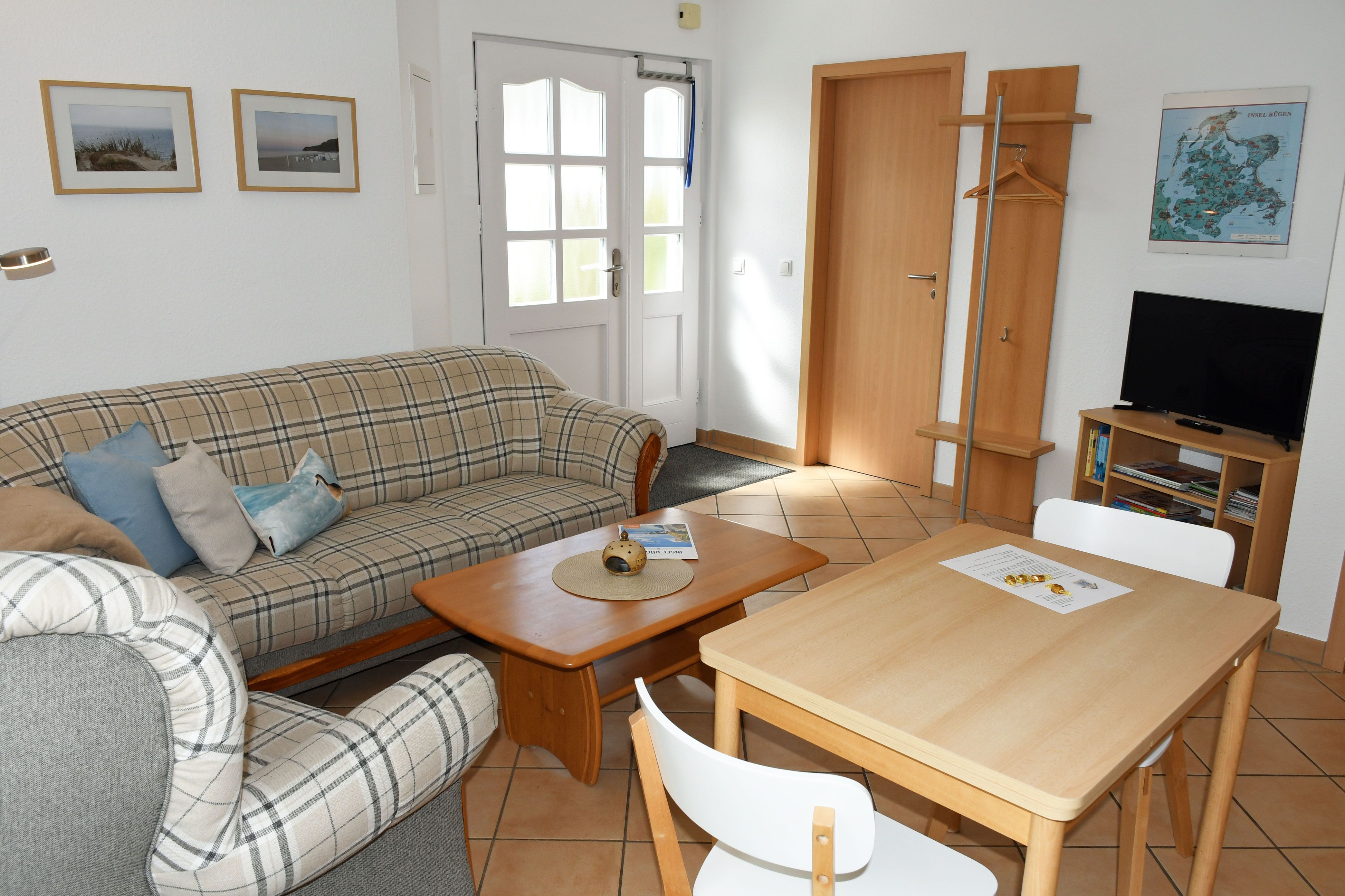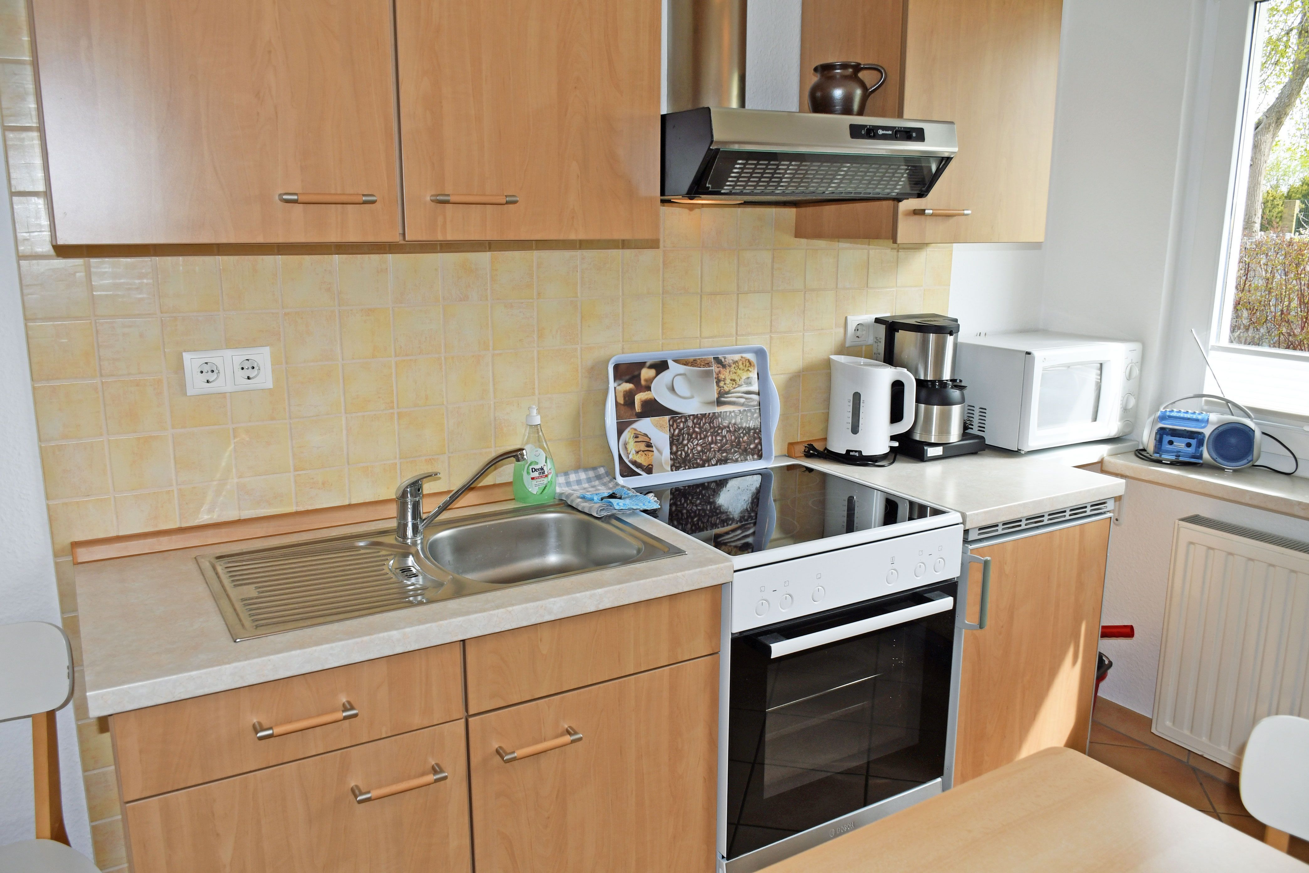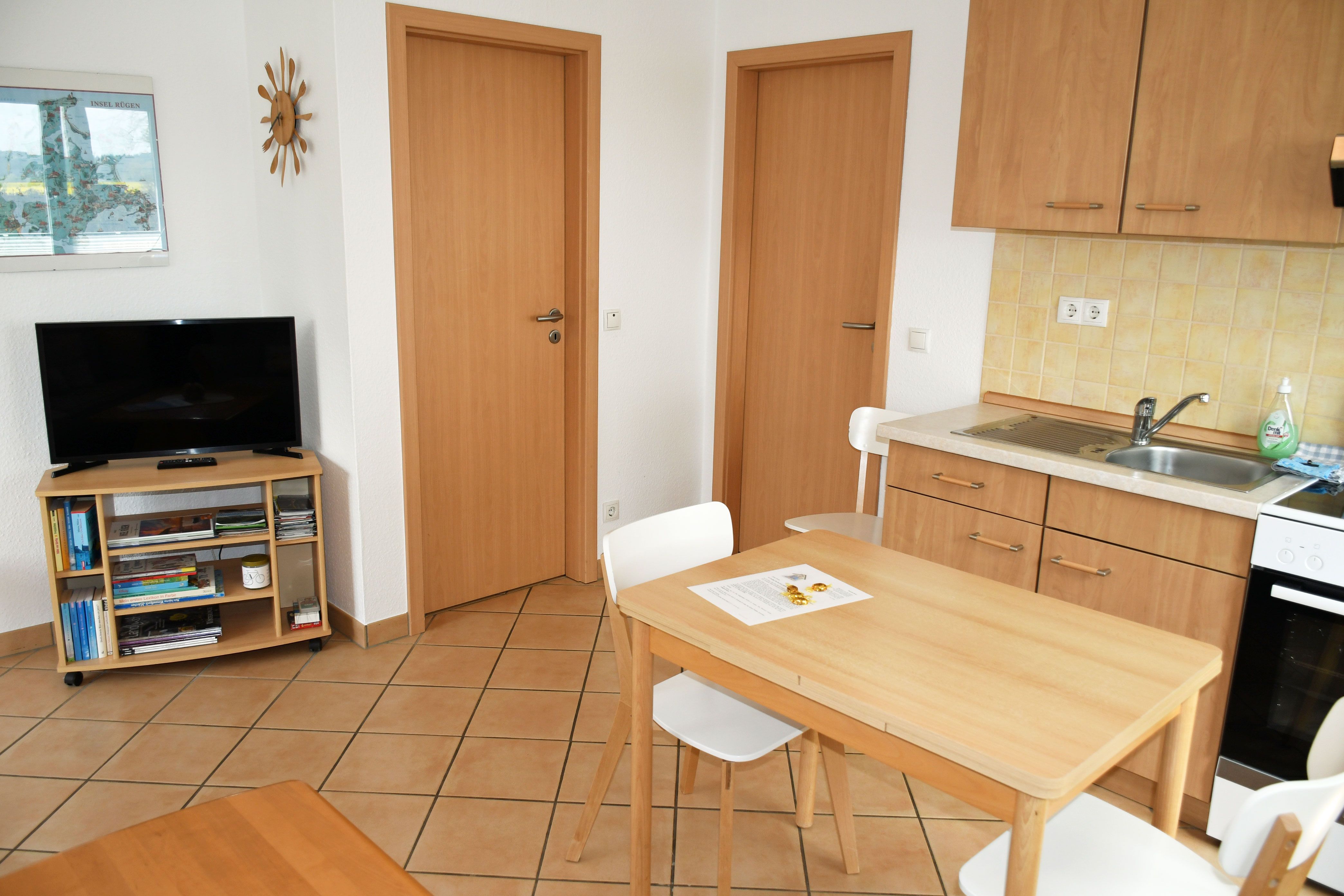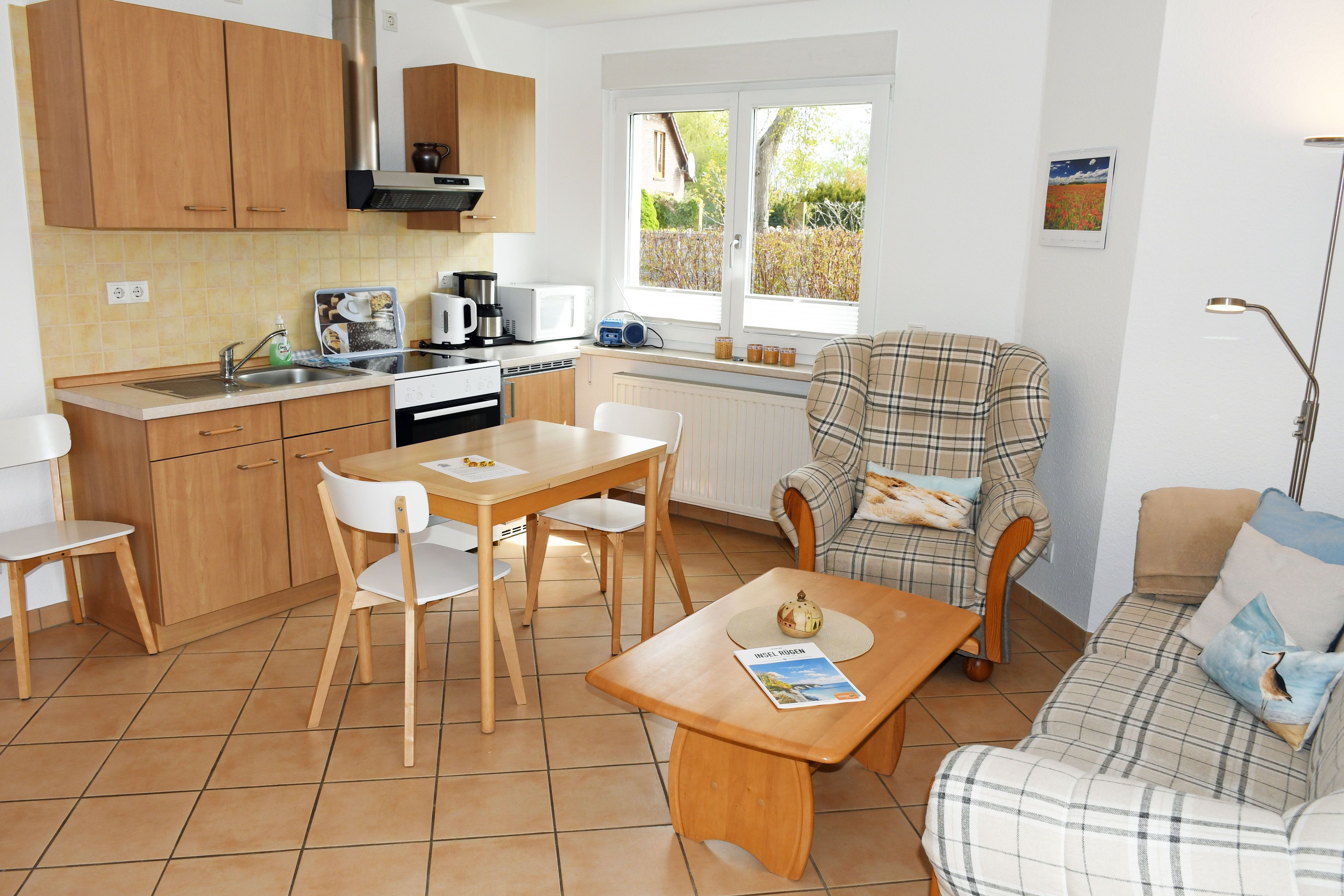 o einen Wohnbereich mit heller Wohnküche und Esstisch für 4 Personen, Ofen, Kochfeld, Kühlschrank mit Gefrierfach, Mikrowelle, Kaffeemaschine, Wasserkocher, Toaster, SAT-TV