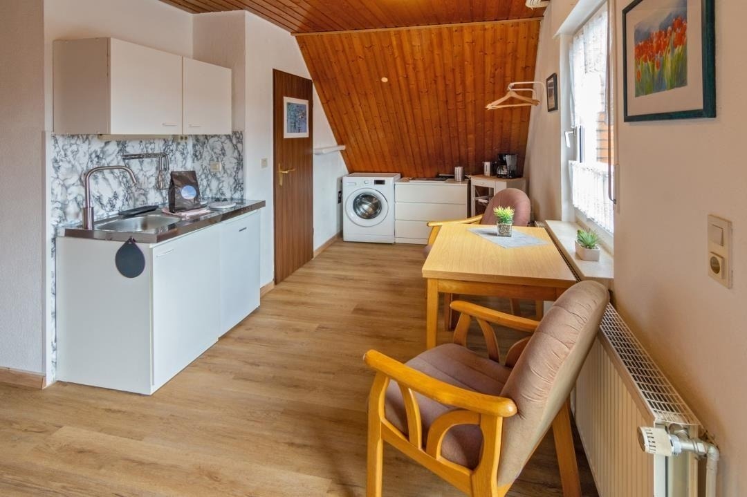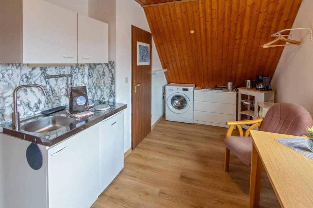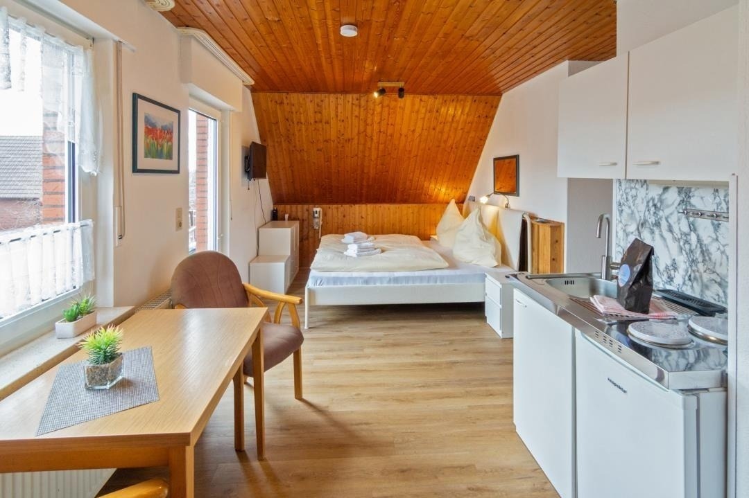 Die Ferienwohnung ist ein gemütliches Einraum-Apartment mit einem großen Balkon. Der Wohnbereich umfasst ein Bett, eine kleine Küchenzeile und einen Esstisch. Ein Fenster sorgt für natürliches Licht und eine einladende Atmosphäre.