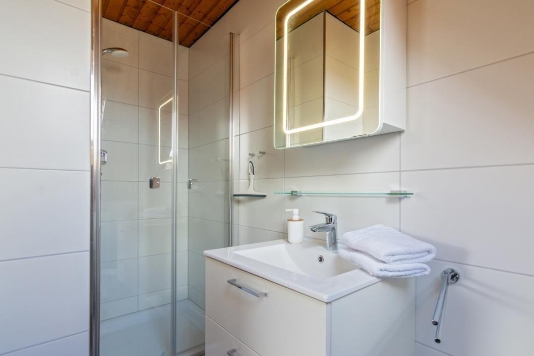 Das Badezimmer ist modern gestaltet und verfügt über ein Waschbecken, einen Spiegel und einen Heizkörper. Die schräge Decke und das Dachfenster verleihen dem Raum eine besondere Note.