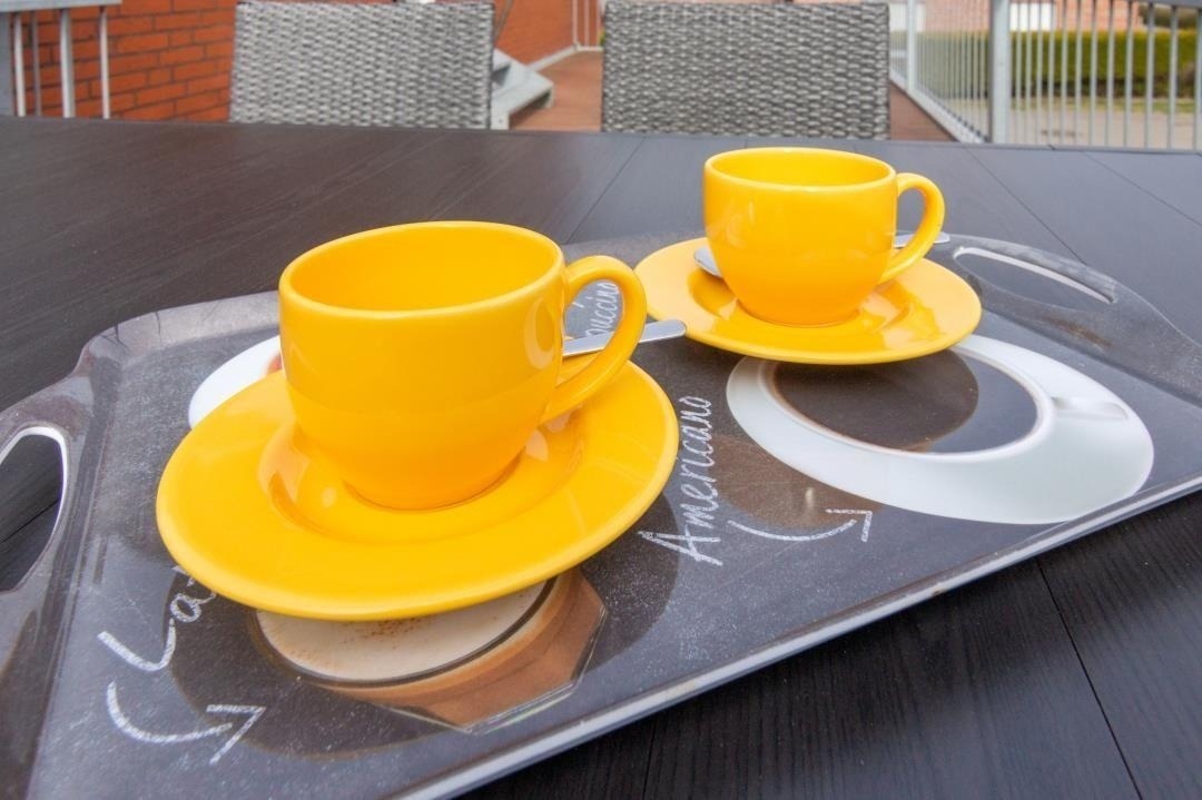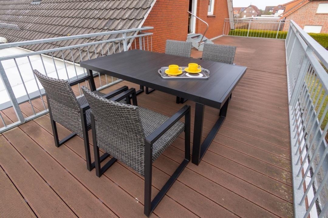 Der große Balkon ist ein Highlight der Ferienwohnung. Er bietet einen schönen Außenbereich mit einer Holzterrasse, die ideal für entspannte Stunden im Freien ist. Ein schwarzer rechteckiger Tisch mit vier Korbstühlen lädt zum Verweilen ein. Auf dem Tisch steht ein silbernes Tablett mit zwei gelben Tassen und Untertassen, was eine einladende Atmosphäre schafft. Die Terrasse ist von Metallgeländern umgeben, die Sicherheit bieten, ohne die Aussicht zu beeinträchtigen. Im Hintergrund sind Dächer und Teile von Backsteingebäuden zu sehen, was dem Balkon einen charmanten, urbanen Charakter verleiht.