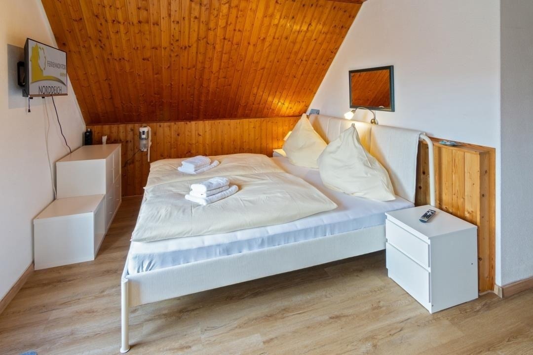 Das Schlafzimmer ist ebenfalls gemütlich und hat eine schräge Decke. Ein Doppelbett und ein Nachttisch bieten Komfort, während ein Flachbildfernseher für Unterhaltung sorgt.