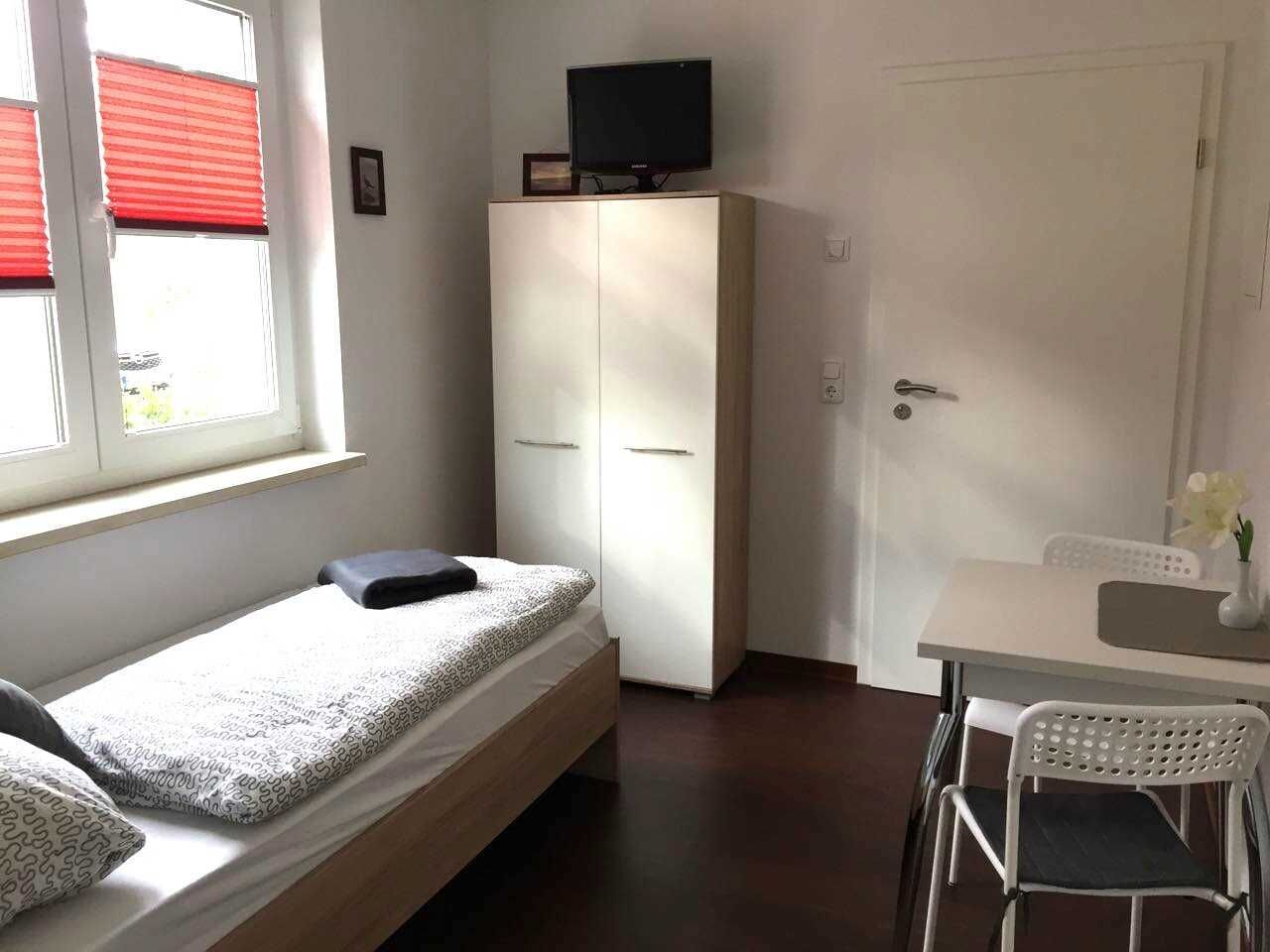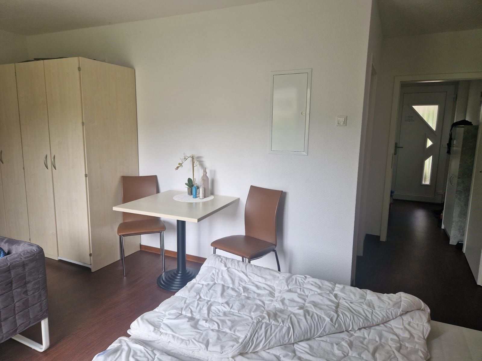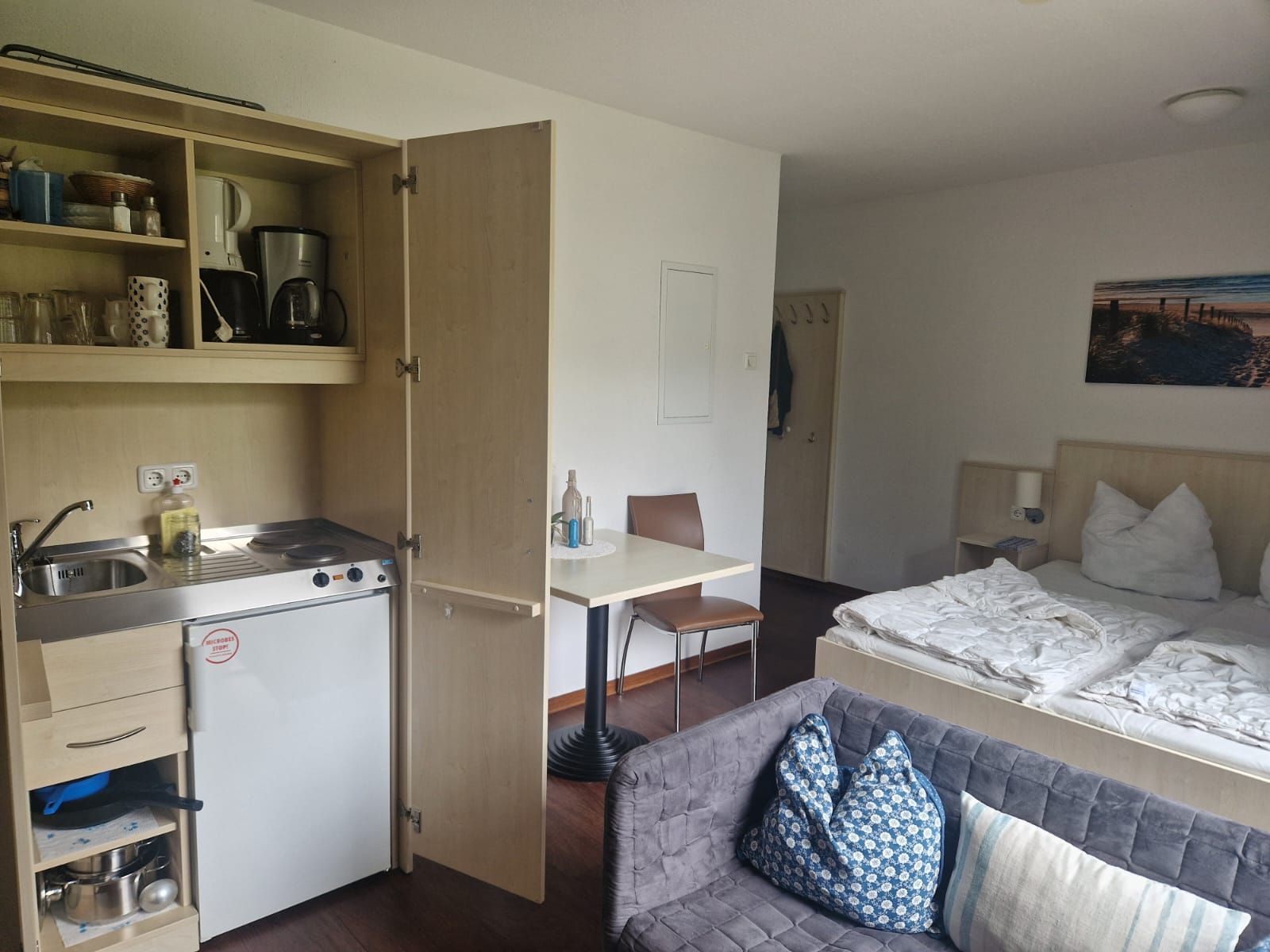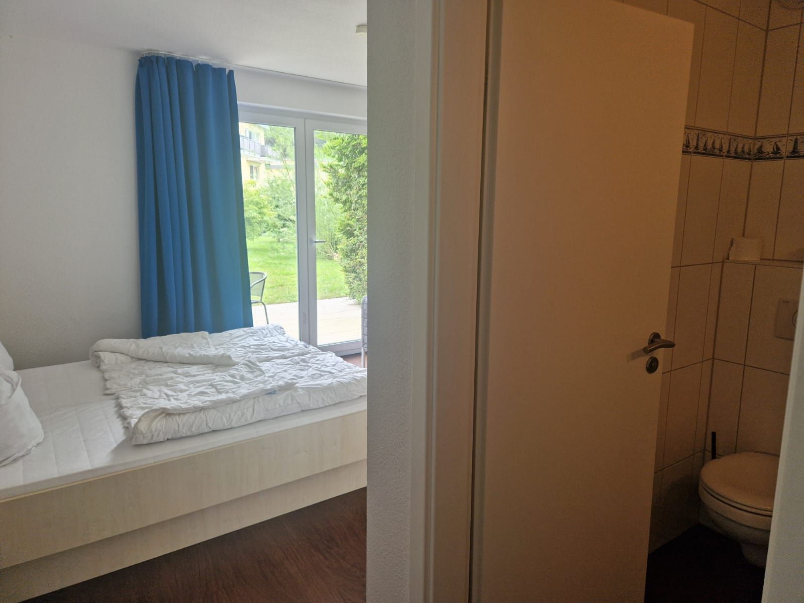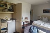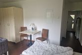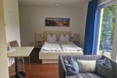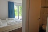 - Das größere Zimmer (ca. 22m²) ist mit einem Doppelbett (180x200) ausgestattet und hat eine integrierte Mini-Küche, von diesem Zimmer gelangt man auf die Terrasse mit angrenzender Grünfläche.