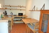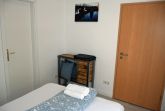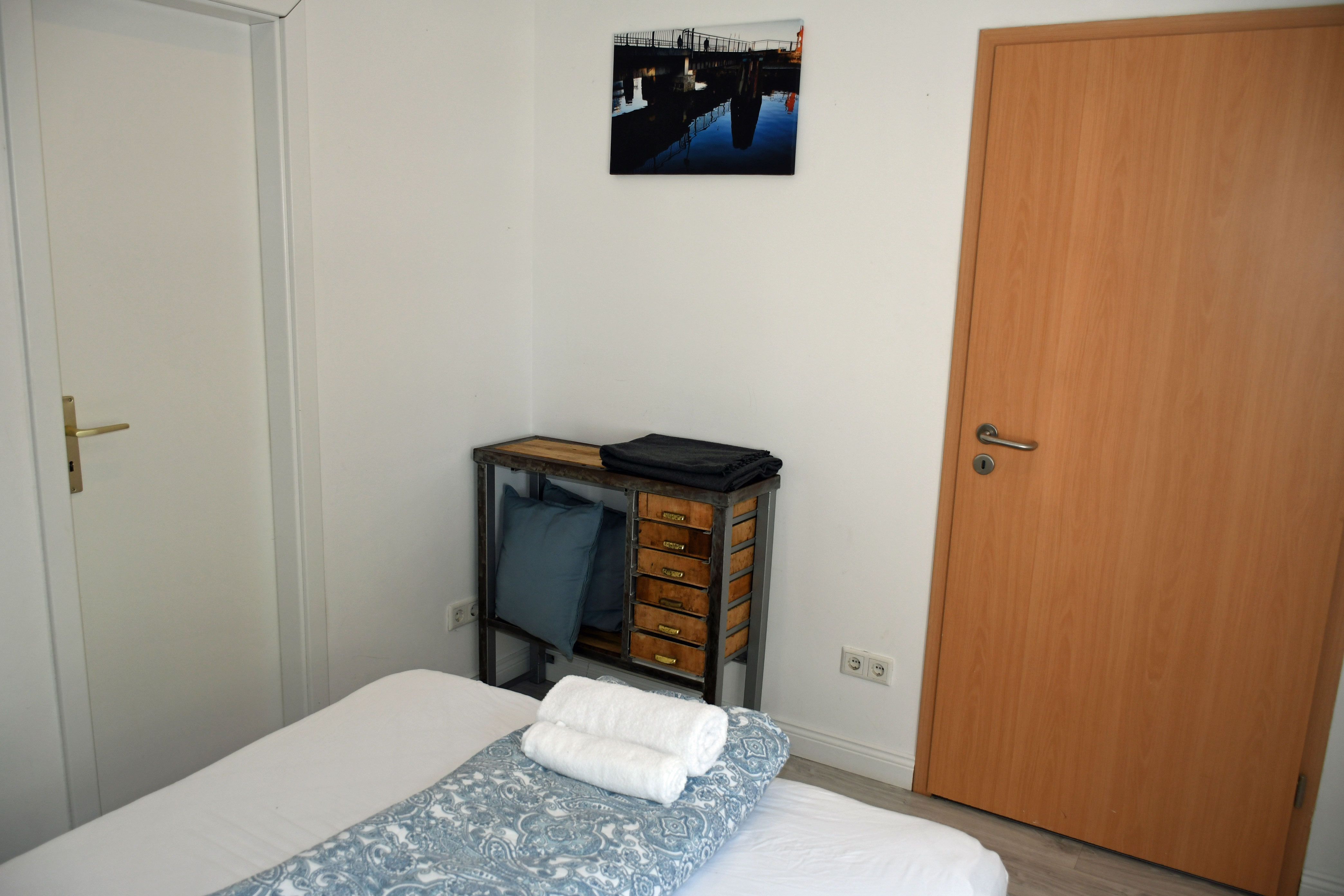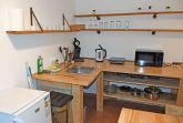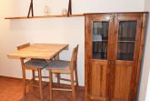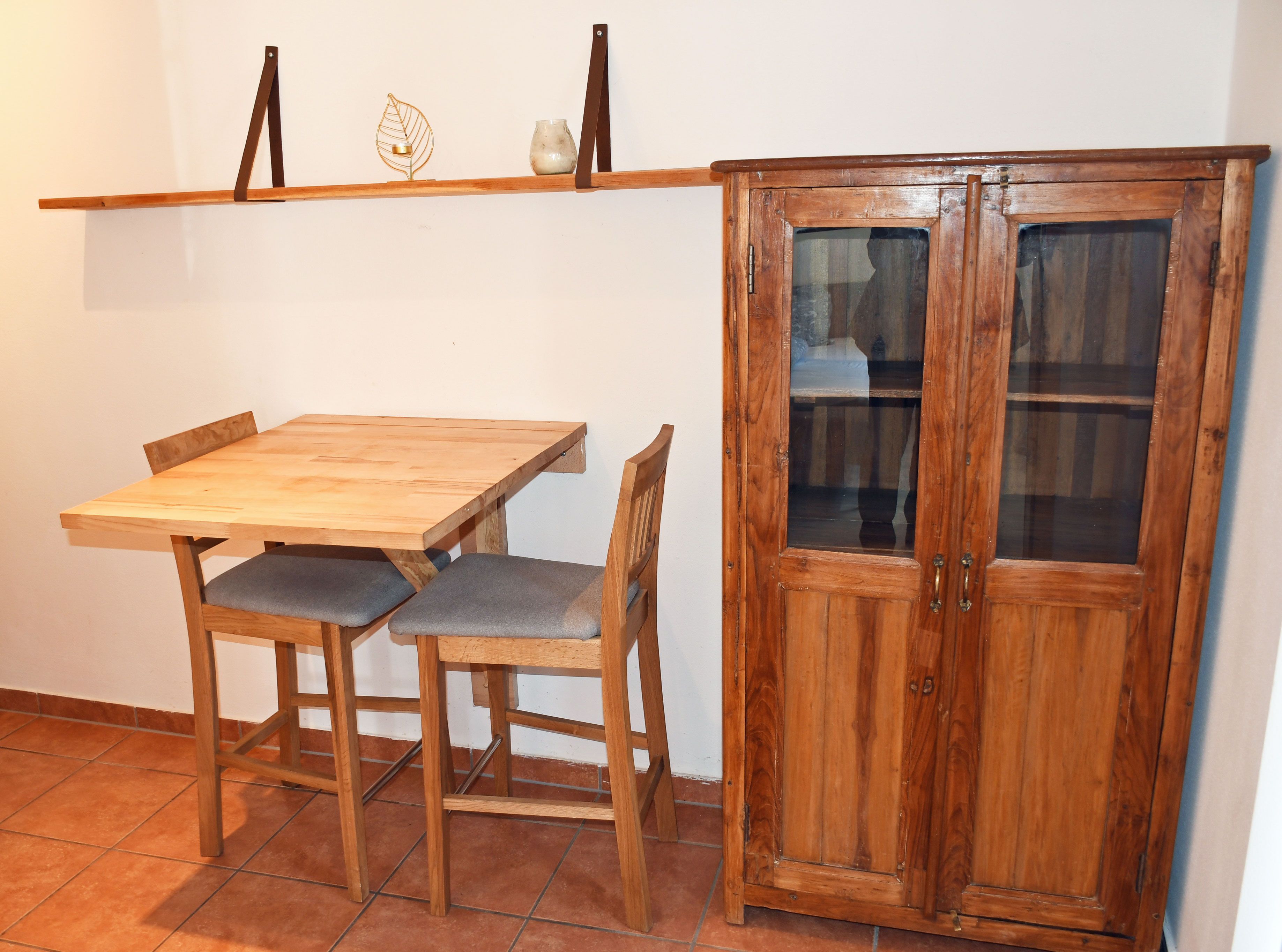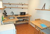 Die Wohnung befindet sich im Erdgeschoss. Über einen kleinen Flur gelangt man in den Wohn-Schlafraum mit Kommode. In der nebenan befindlichen Küche stehen ein Esstisch und Stühle.