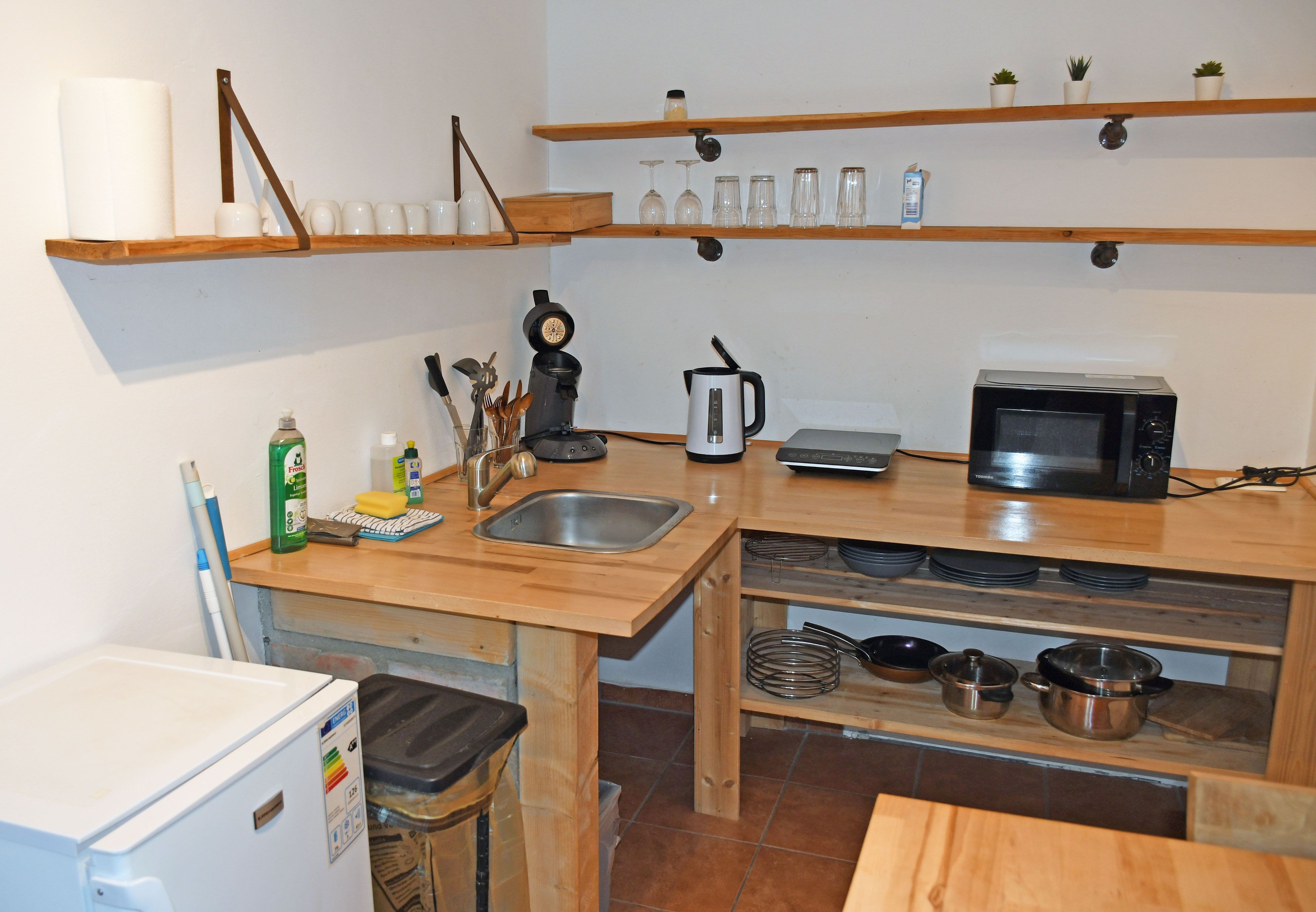 Die Küchenausstattung beinhaltet u.a.: Mikrowelle, einen großen Herd, Kaffeemaschine, Wasserkocher. Kostenfrei können ein Raclette, ein Waffeleisen und einen Pürierstab ausgeliehen werden.