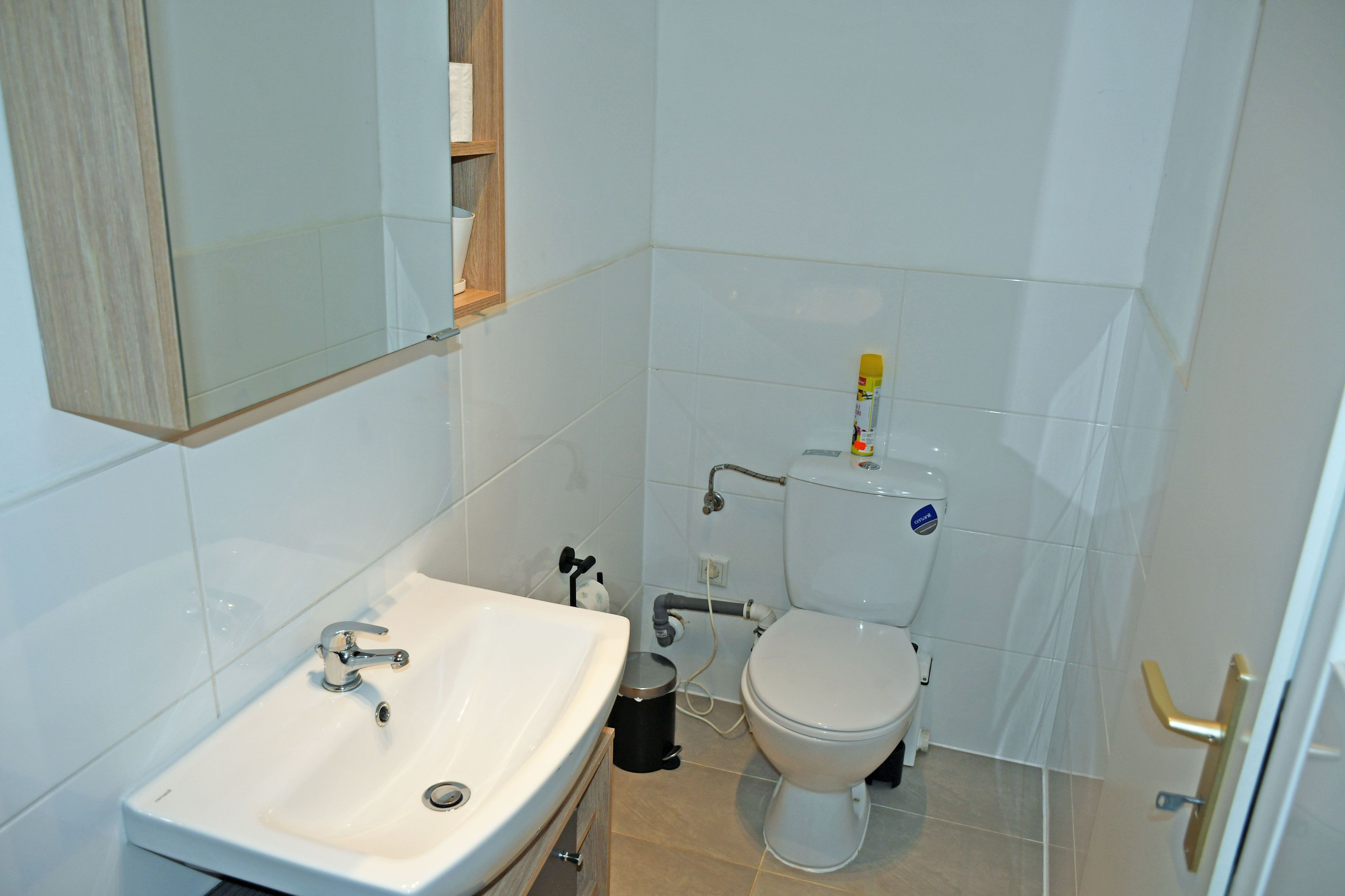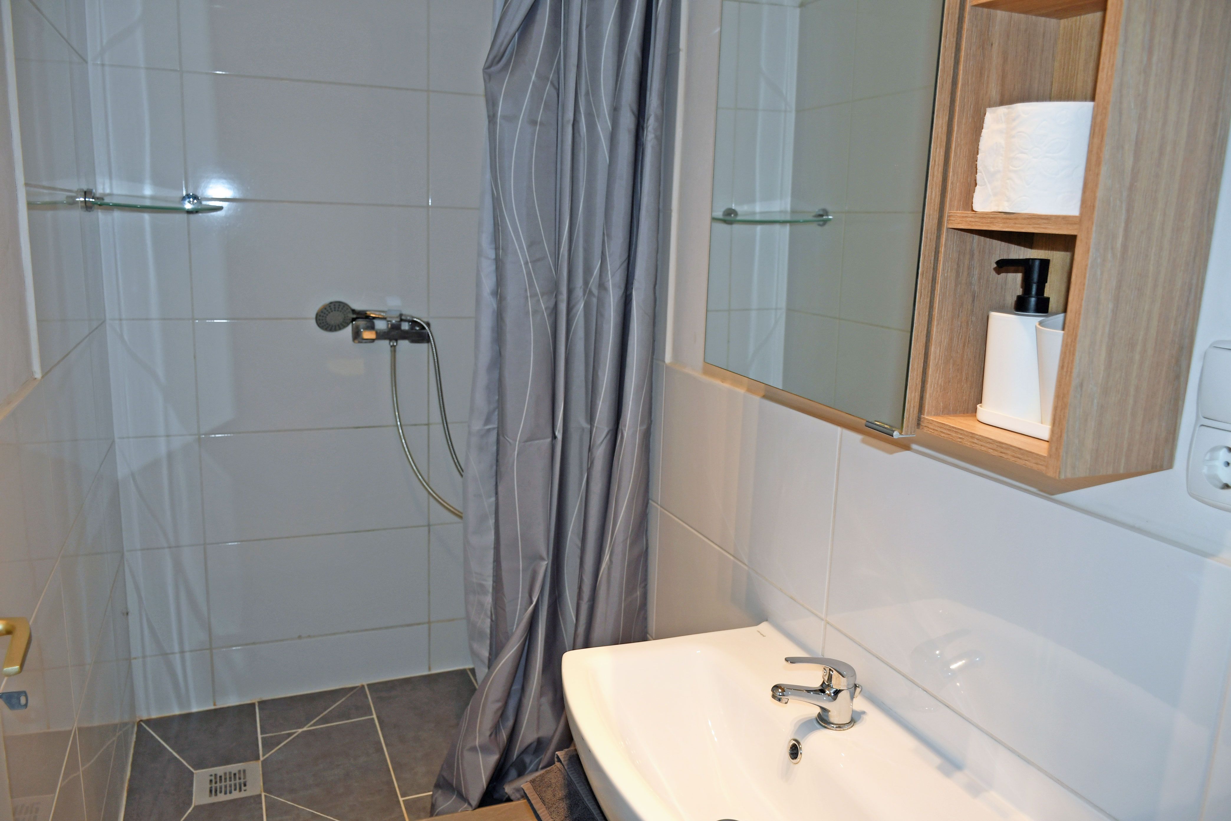 Das Bad ist mit Dusche, WC und Waschtisch ausgestattet.