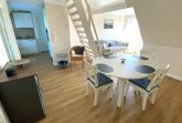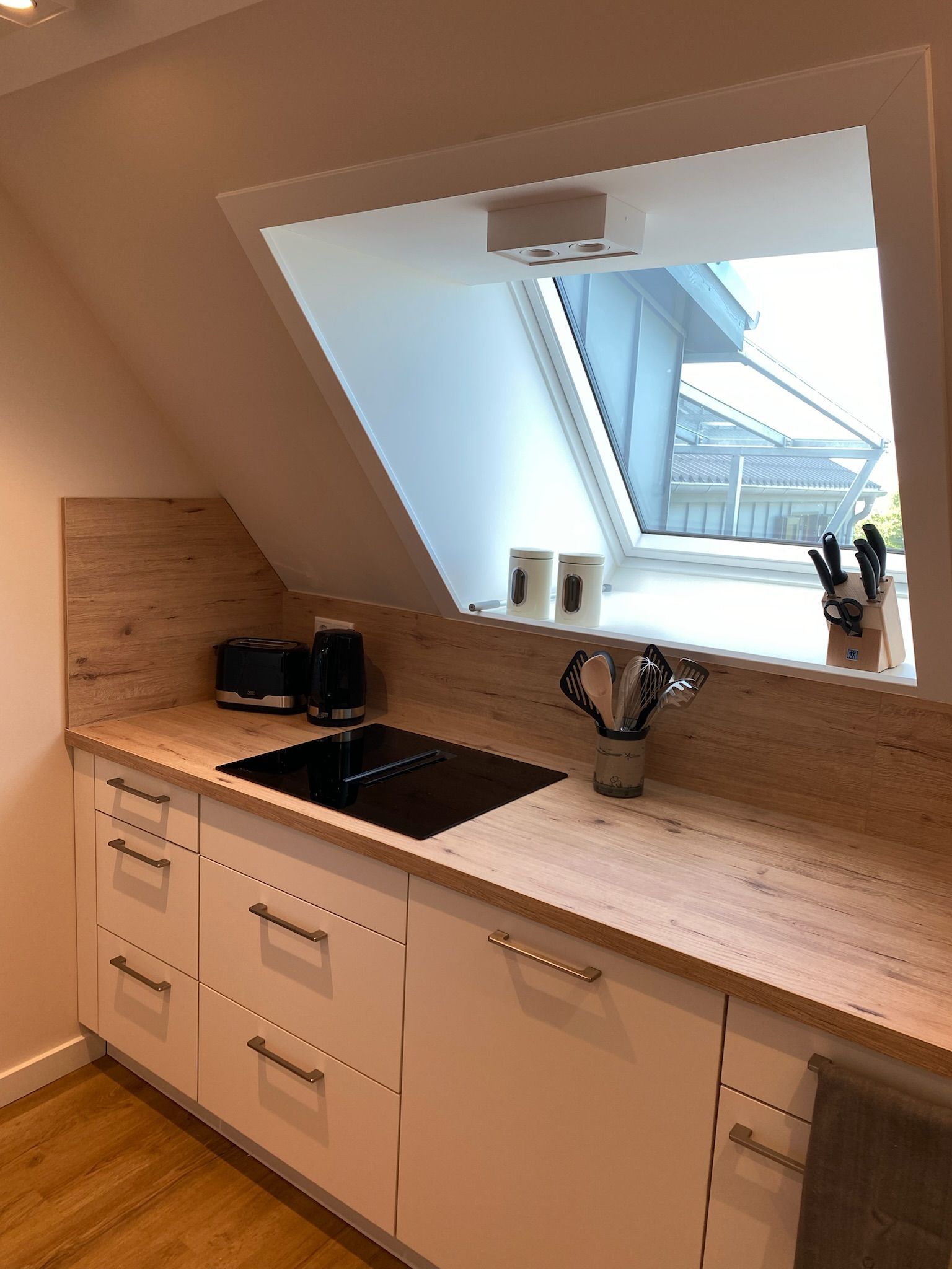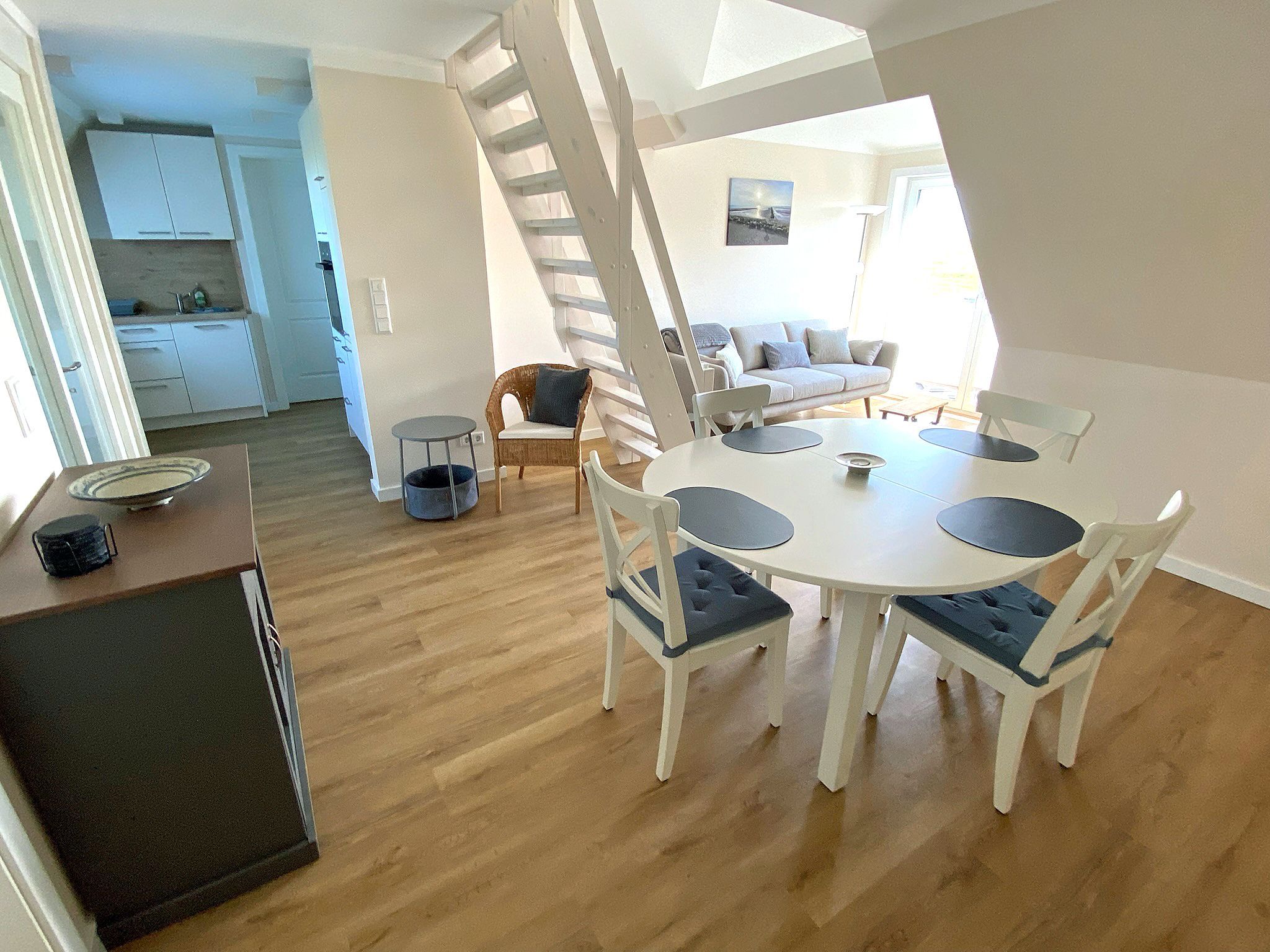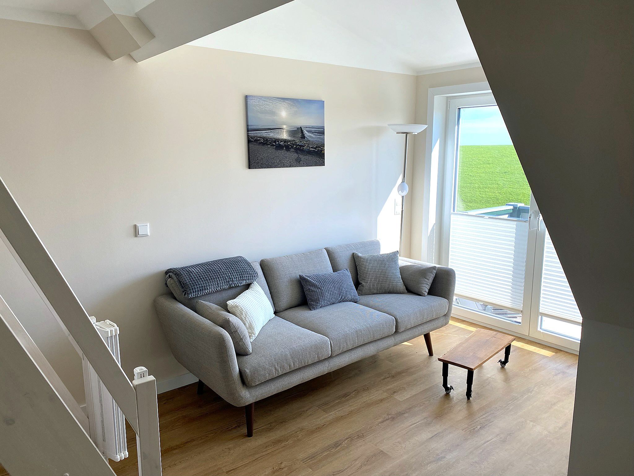 Der große Wohnraum, mit offener voll ausgestatteter Küche, wartet mit gemütlicher Couch, Smart-TV und Esstisch auf. Von dort aus geht es auch auf den Balkon mit Deichblick.