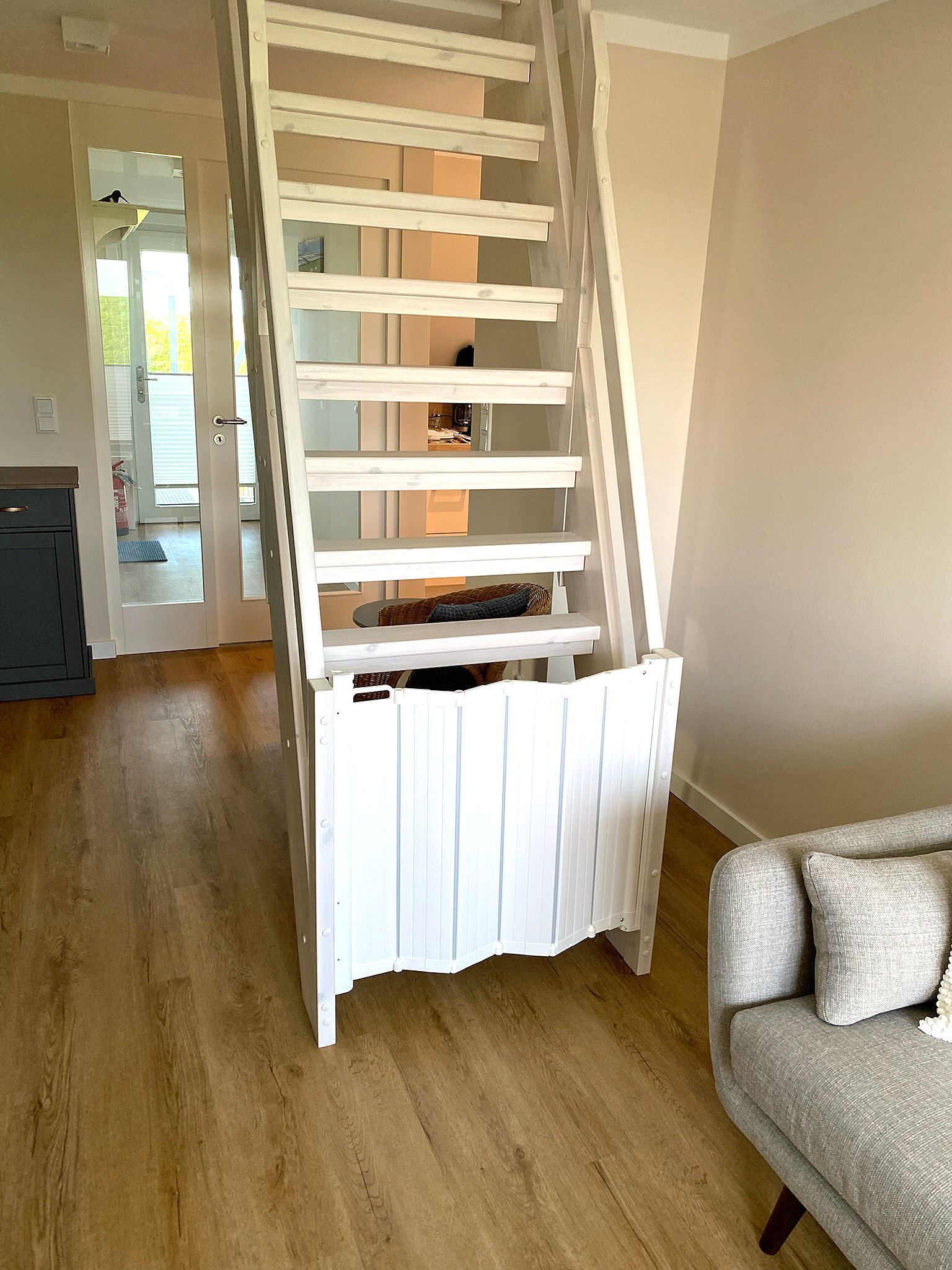 Über eine Außentreppe betreten Sie die Wohnung Austernfischer. Sie bietet Platz für bis zu 4 Erwachsene und 3 Kinder.