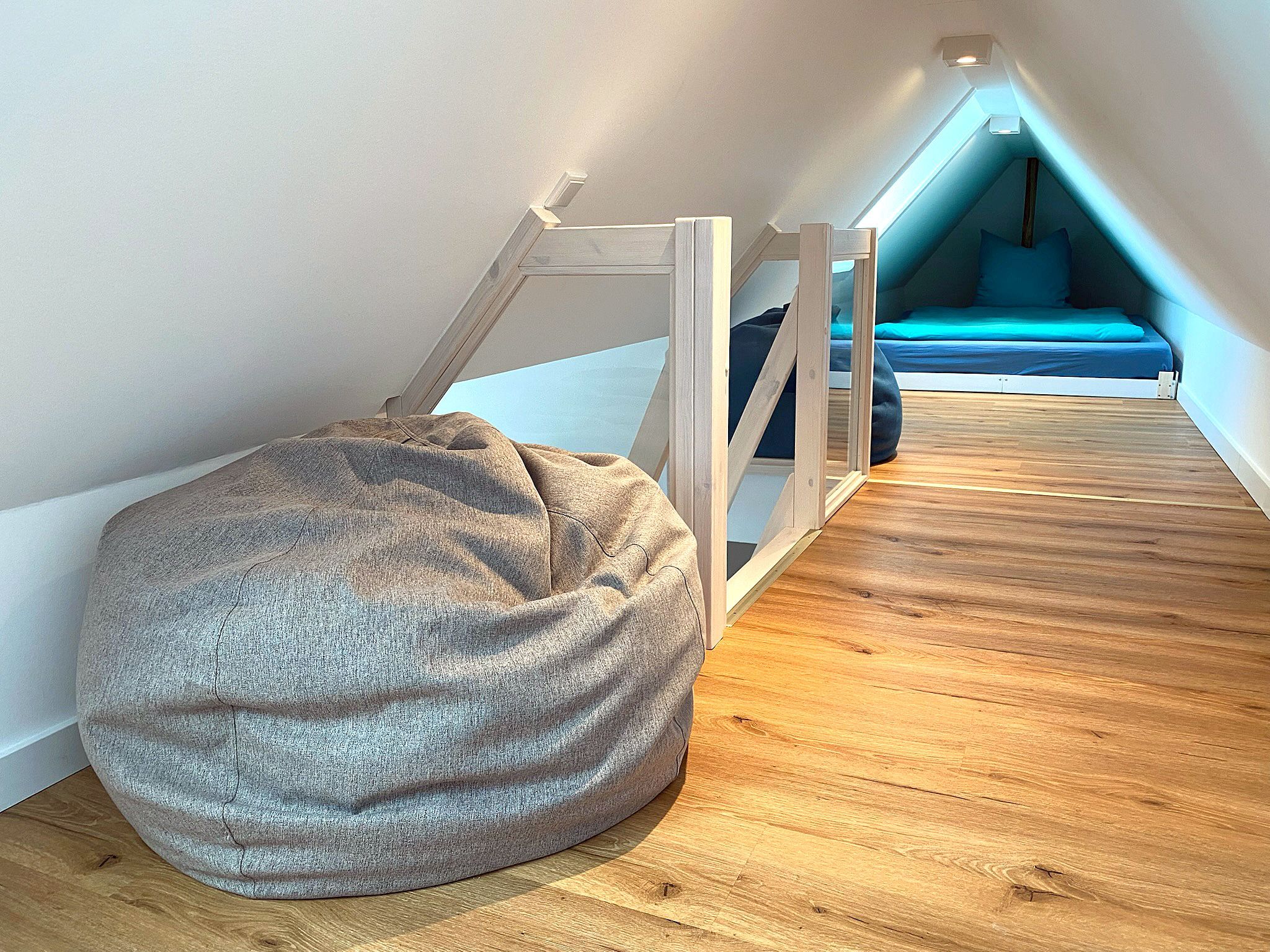 Für Jugendliche und/oder geübte Kletterer gibt es eine Schlafkoje direkt unter dem Dach mit 2 Futon-Betten.
