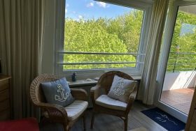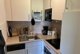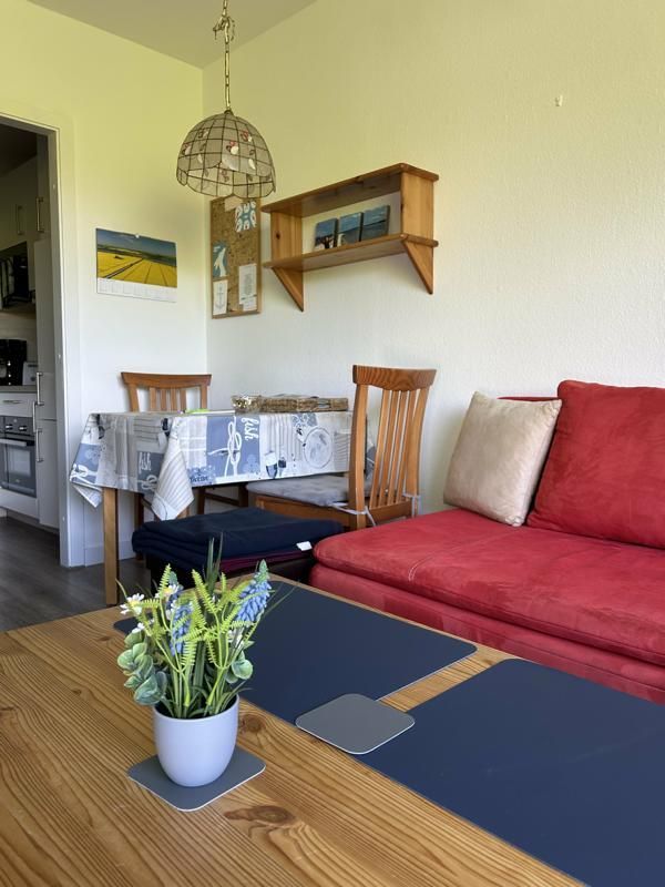 Das 43 qm große Ferienappartement erreicht man über einen Aufzug (7. Etage). Das Schlafzimmer hat ein bequemes Doppelbett und zwei Schränke mit viel Stauraum. Eine weitere Schlafmöglichkeit für eine Person gibt es im Wohnzimmer auf dem Schlafsofa. Der Wohnraum ist gemütlich eingerichtet mit Couchtisch, Esstisch (ausziehbar), Schlafsofa, modernem TV (Kabel), DVD-Spieler und Stereoanlage (Radio, CD, Kassetten). Die kleine, offen zum Wohnzimmer ausgerichtete Küche ist sehr gut ausgestattet: Geschirrspülmaschine, Mikrowelle, Backofen, Cerankochfeld, Toaster, Wasserkocher, Kaffeemaschine, Kühlschrank, separate Tiefkühleinheit und vieles mehr.