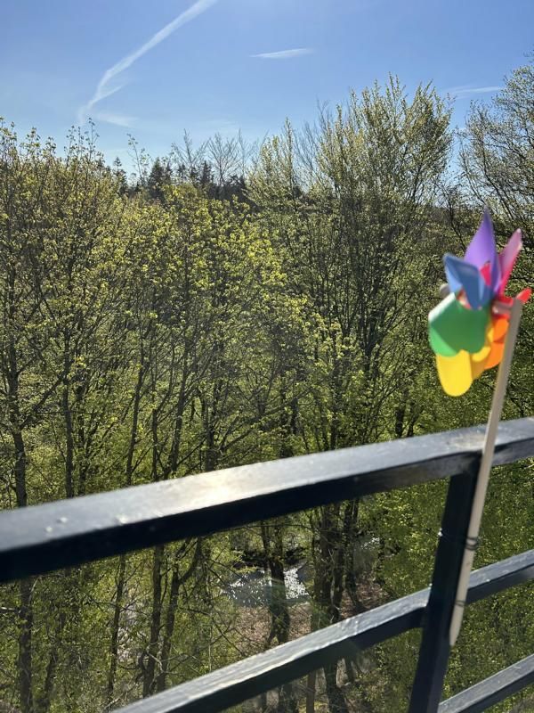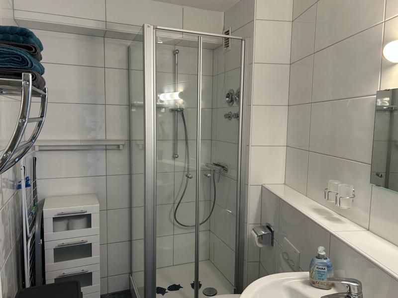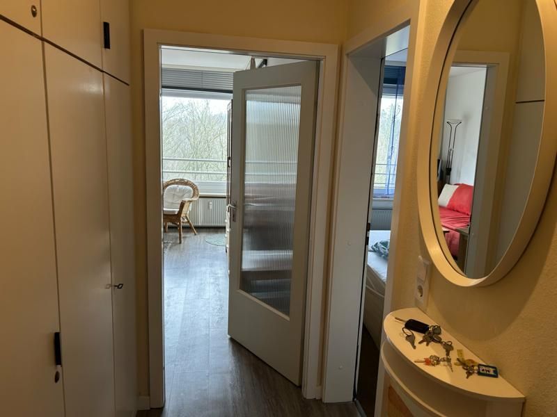 Das Bad mit Dusche und ein kleiner Flur mit Garderobe und Einbauschrank sowie ein windgeschützter Balkon mit tollem Waldblick runden die gemütliche Wohnung ab.