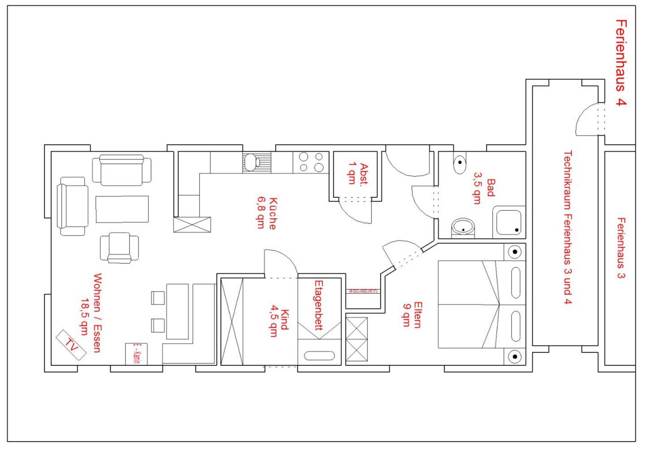 Ferienhaus 4, rechtes Doppelhaus, alles ebenerdig, 1 Stufe vor Haus-,Terrassen- und Schwimmbadtür.