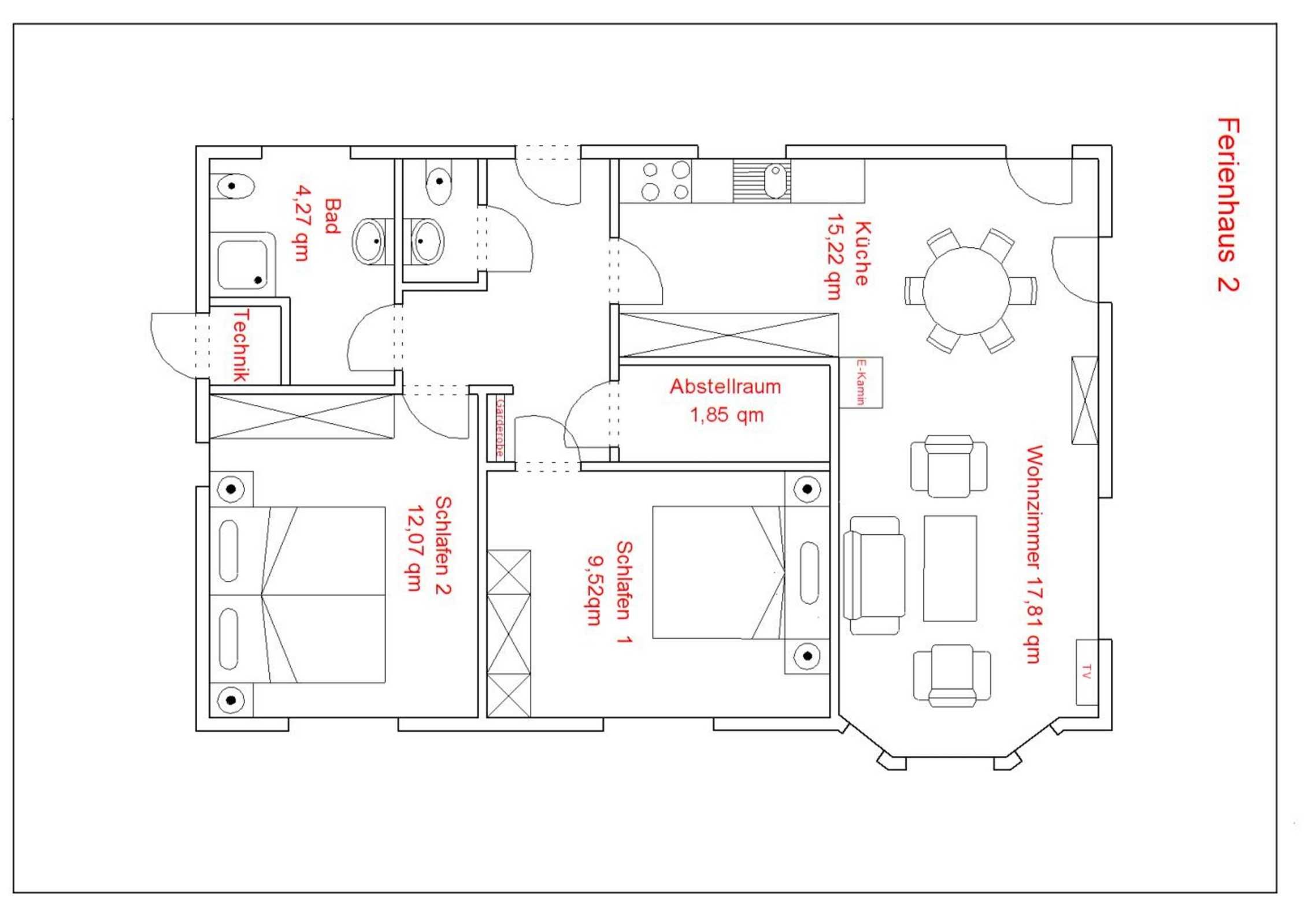 Bad mit Dusche und WC. Separates WC. Schlafzimmer mit Ehebett ,großem Kleiderschrank. Schlafzimmer mit einem 140 cm breitem Bett, Kleiderschrank. Wohnzimmer mit Doppelschlafsofa und 2 Fernsehsesseln. Babybett auf Anfrage. Offene Küche mit Geschirrspüler und Gefrierbox. Esstisch. Großer Abstellraum. Fliegengitter. Bettwäsche, Handtücher, Endreinigung inkl. Terrasse mit Möbeln, Grill und abschließbarer Hütte für Fahrräder etc. E-Rad-Lademöglichkeit.. 1 Parkplatz mit E-Ladestation direkt an Haustür.