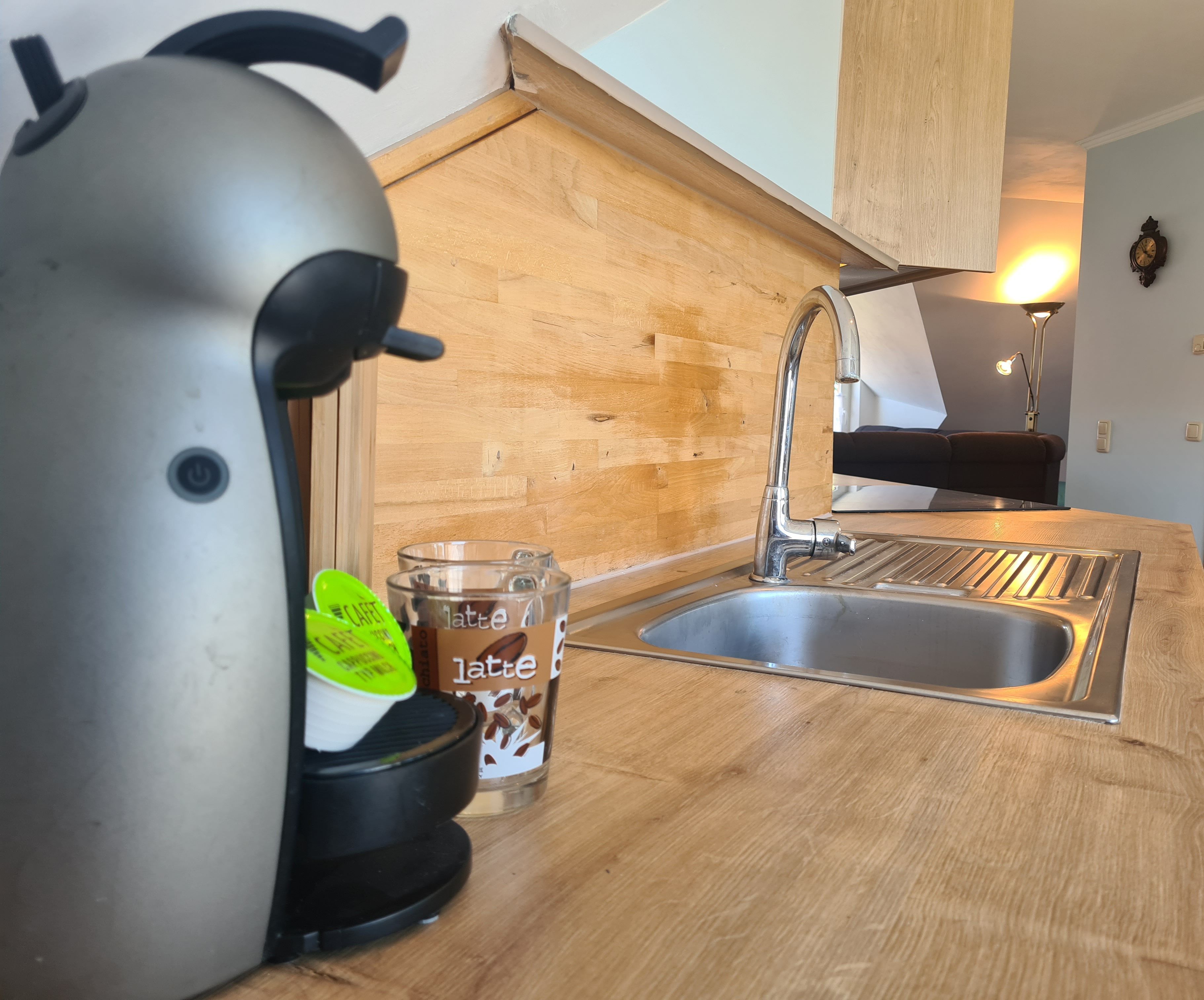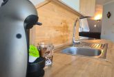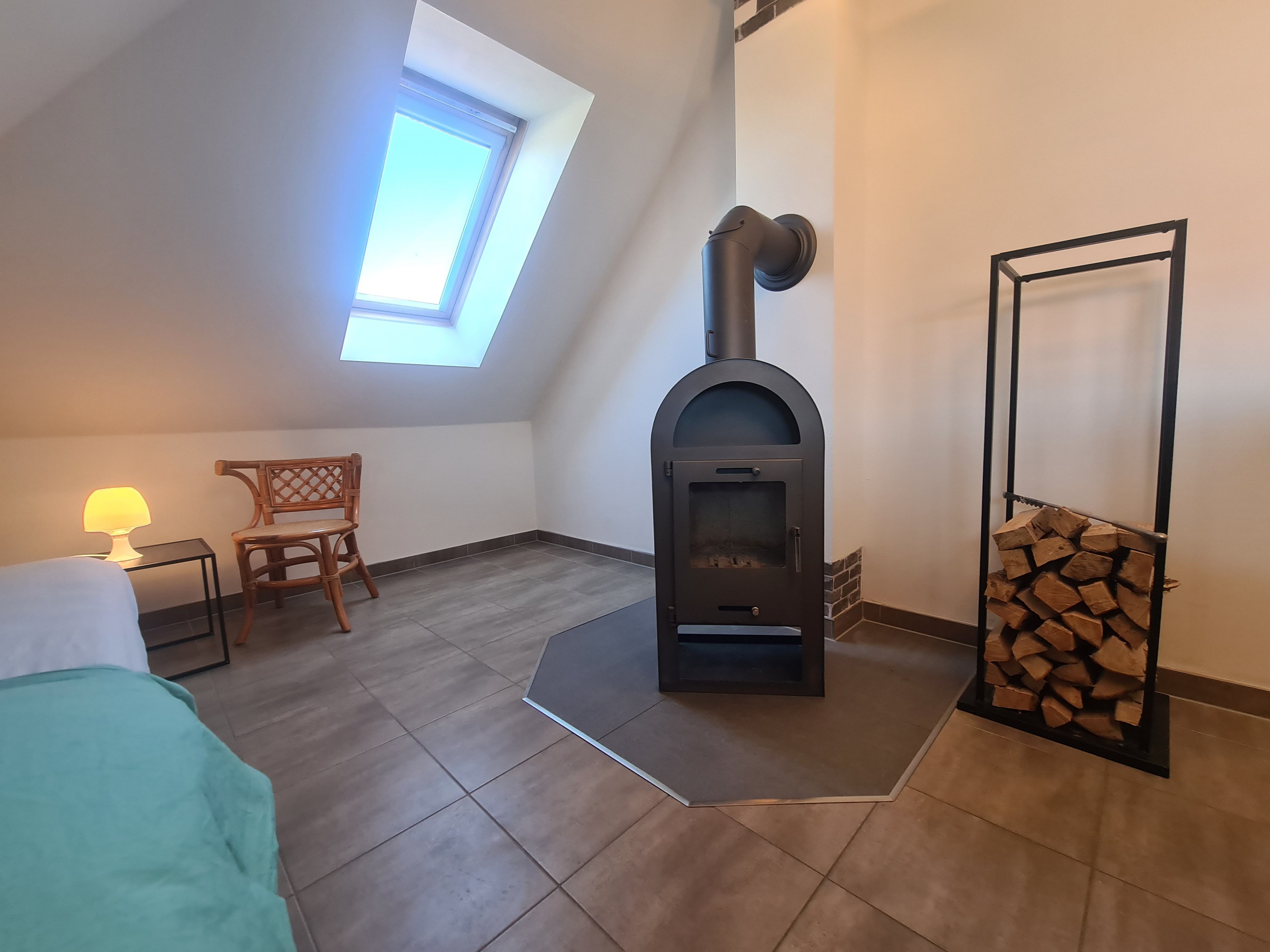 Helle, offene Wohnküche mit Kamin: Esstisch für 4 Personen und Küchenzeile (Ceran-Herd, Backofen, Kaffeemaschine, Toaster, Wasserkocher, Kühl/Gefrierfach). Große Eckcouch und Schlafnische mit 1 Einzelbett (0.90x2m).