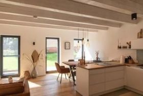 Alle Wohnungen sind Maisonette und zeichnen sich durch moderne, Grundrisse aus. Durch die Einbeziehung des historischen Ständerfachwerks in die Wohnraumgestaltung erhalten die Einheiten zudem eine besondere, unverwechselbare Note. Fußbodenheizung, Echtholz-Parkettböden sowie Armaturen und Keramik namhafter Hersteller versprechen einen hohen Wohnkomfort. Zu jeder Wohnung gehört eine großzügige Terrasse sowie ein PKW-Stellplatz mit Abstellschuppen. Die Außenanlagen des rund 4000 qm großen Grundstücks zeichnen sich besonders an der Südseite und Ostseite durch großzügige Grünflächen aus, die mit Sträuchern und Hecken geschmackvoll angelegt wurden. Ein alter Baumbestand rundet das Gesamtbild ab.