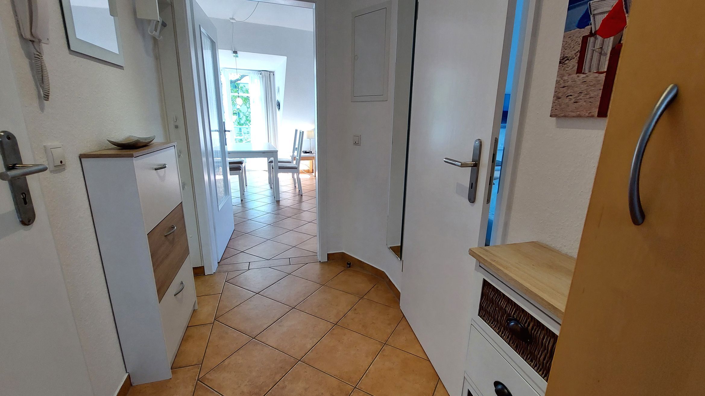 Der Flurbereich, samt Schuhschrank und Garderobe, bietet Zugang zum Wohnbereich, zum Schlafzimmer und den Bädern.