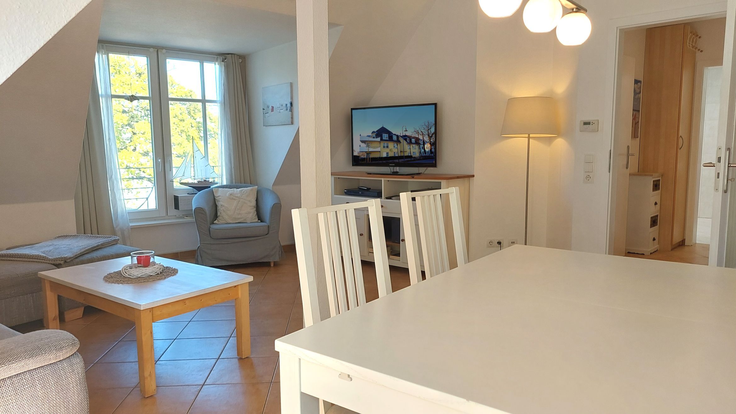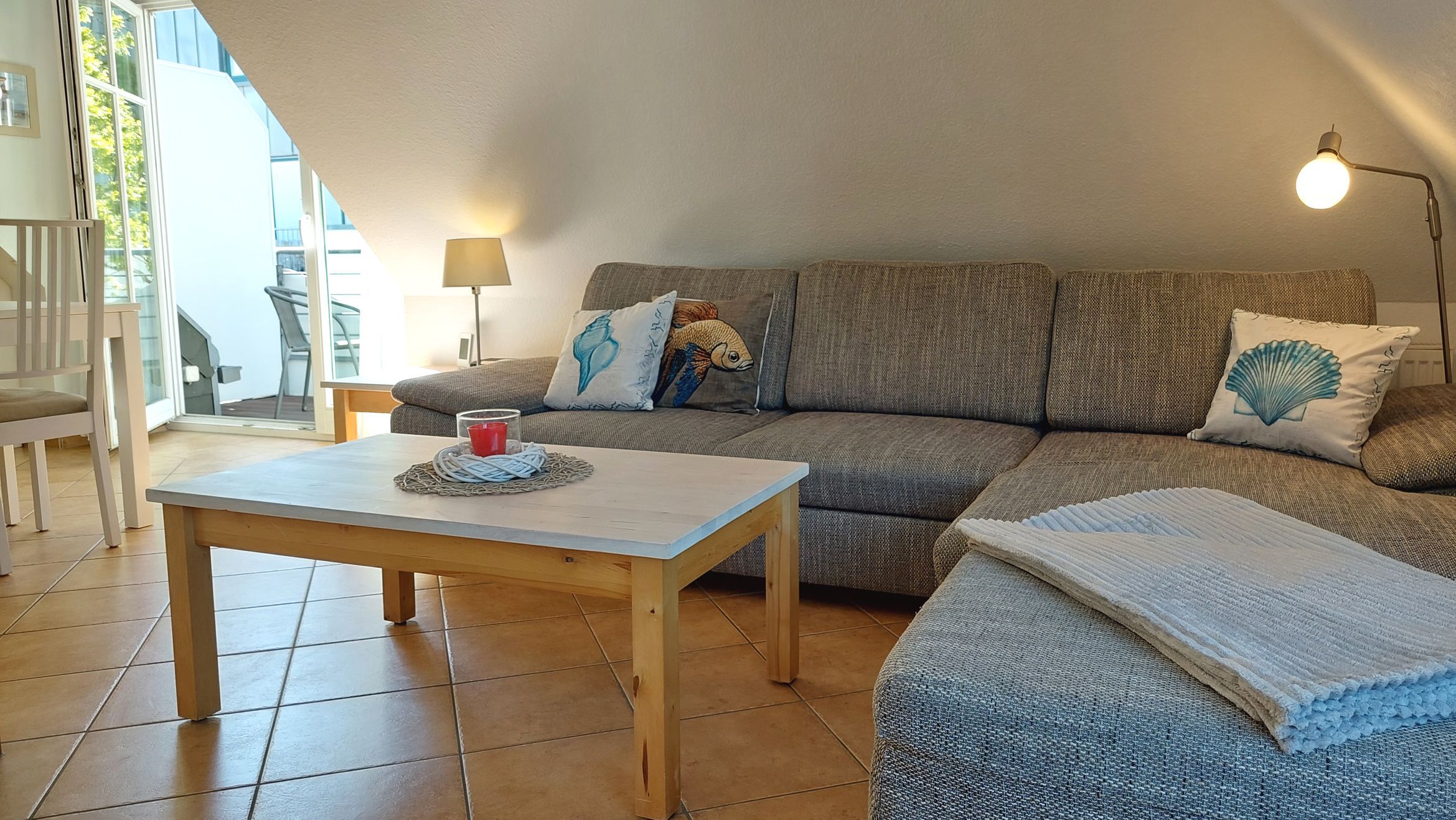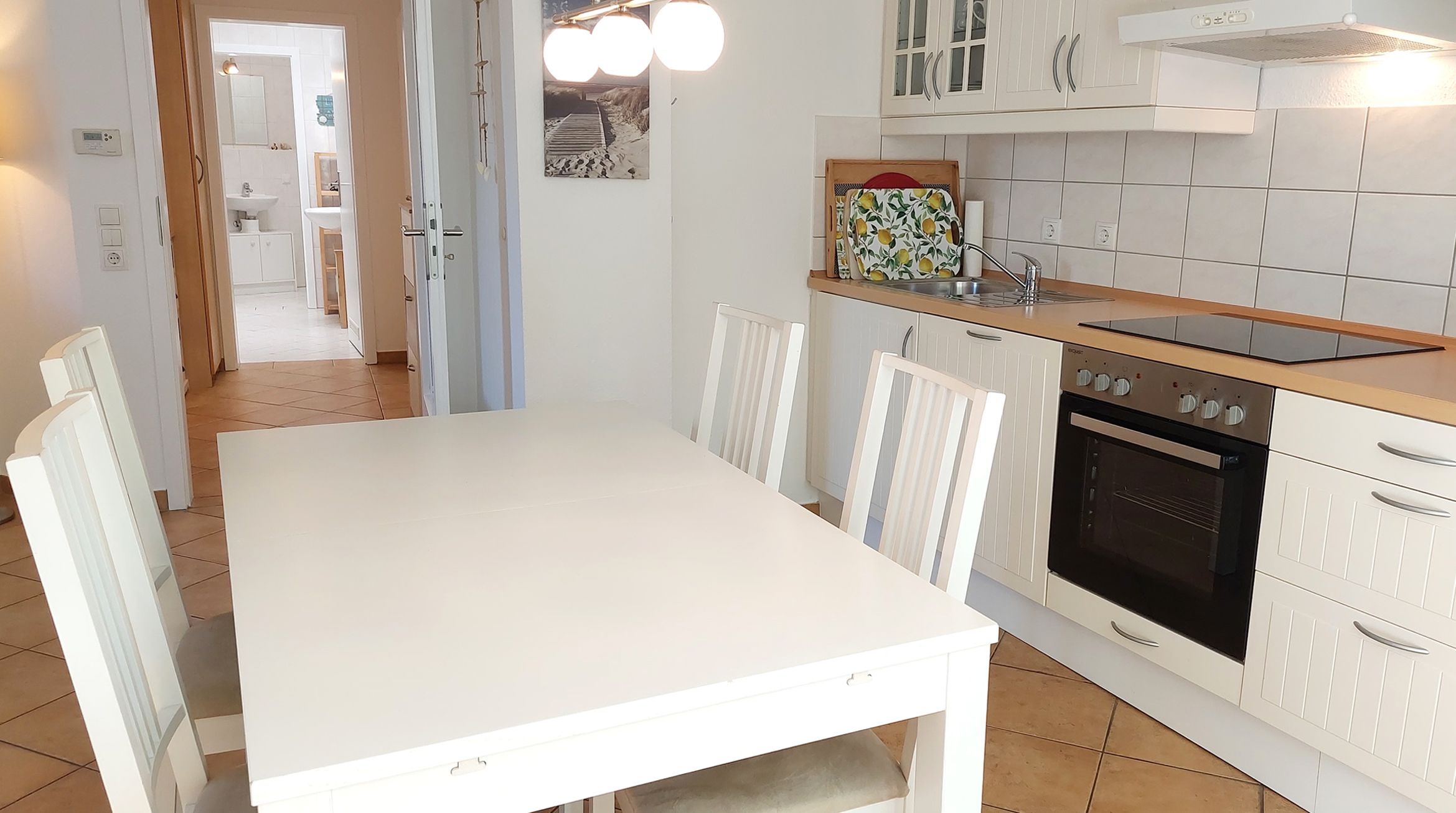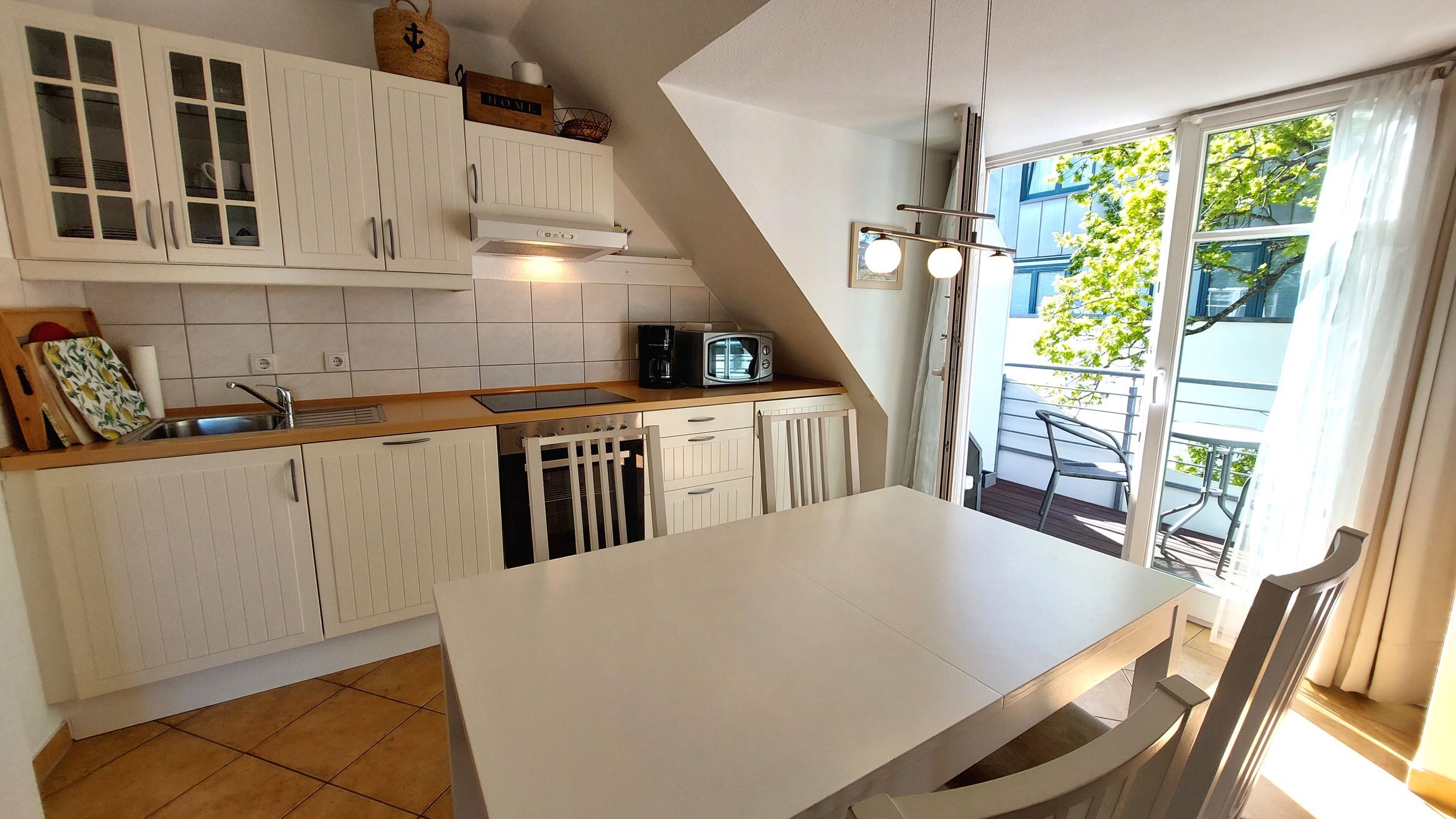 Der kombinierte Wohn-, Ess- und Kochbereich ist geräumig und modern eingerichtet. Die Küchenzeile verfügt über ein Cerankochfeld, Mikrowelle, Geschirrspüler, Kühlschrank mit Gefrierfach, Backofen, Nespresso-Maschine und weitere Küchenhelfer, um sich bequem selbst zu versorgen. Der Essbereich bietet Sitzgelegenheiten für bis zu 4 Personen. Von dort aus gibt es den Zugang zum möblierten Balkon in westlicher Richtung.