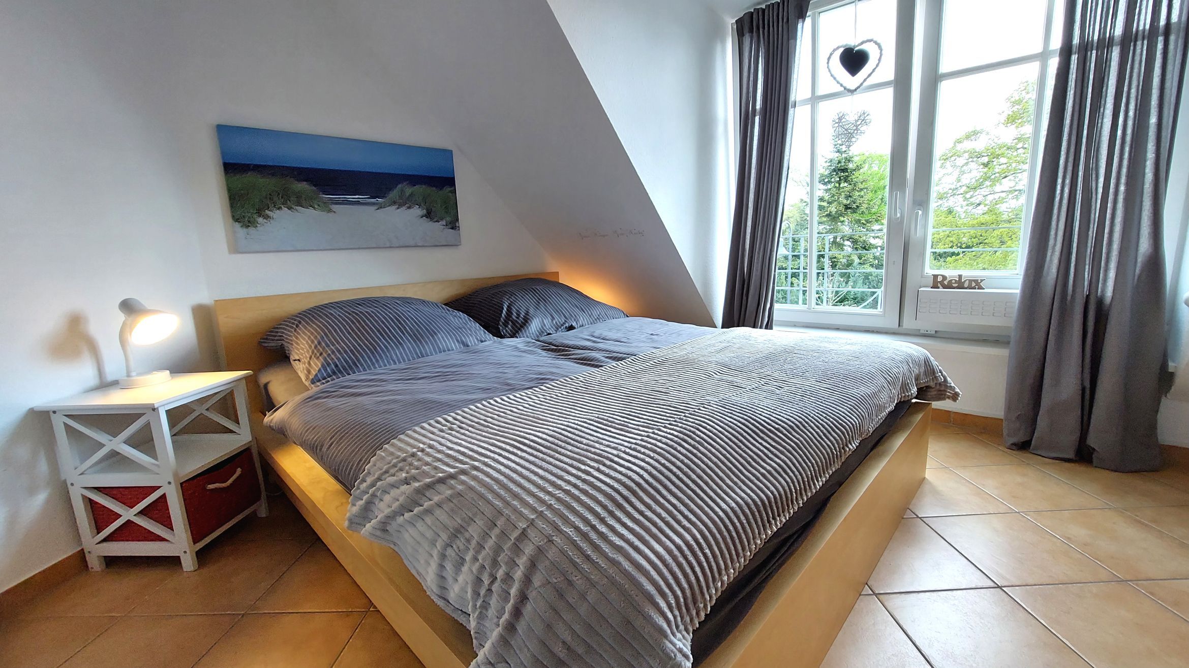 Im Schlafzimmer gibt es ein Doppelbett, Nachttische, einen Kleiderschrank und einen Fernseher.