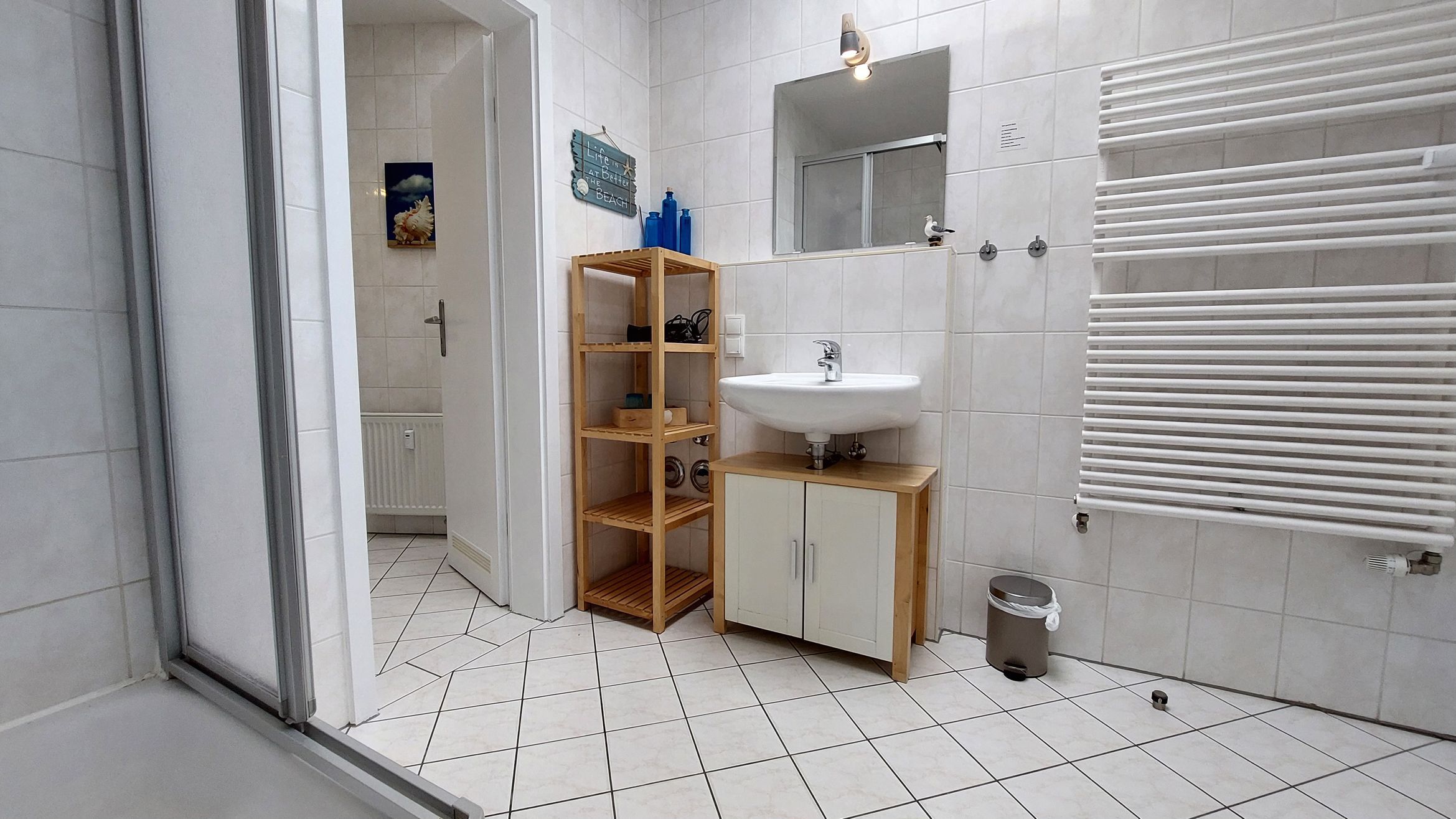 Das Hauptbad verfügt über Dusche, Waschbecken und Fön. Angrenzend gibt es ein separates WC samt eigenem Waschbecken. Beide Nassbereiche sind durch große Dachfenster lichtdurchflutet.