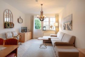 Die Ferienwohnung Salzwiesenglück im Erdgeschoss ist optimal für Familien oder kleine Gruppen geeignet. Der lichtdurchflutete Wohnbereich verfügt über ein gemütliches Ecksofa mit Hocker sowie einen TV und bietet direkten Zugang zur eigenen Terrasse. Die separate, voll ausgestattete Küche beinhaltet Herd, Backofen, Kühlschrank, Geschirrspüler, Mikrowelle, Kaffeemaschine, Wasserkocher und Toaster, ideal für gemeinsame Kochabende.