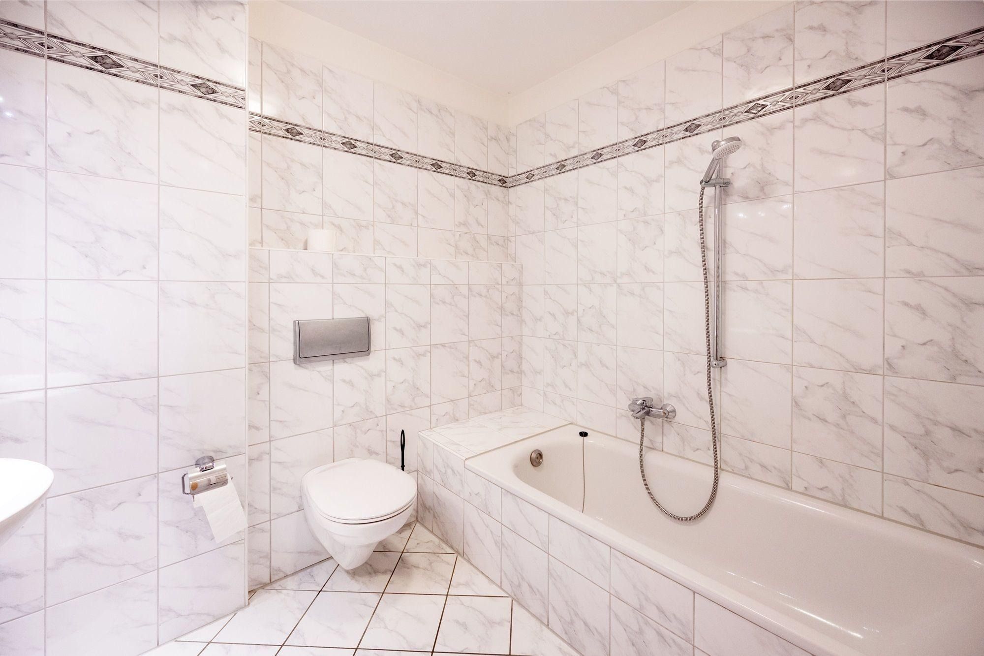 Das Badezimmer beinhaltet eine Dusch-Badewanne, ein Waschbecken, WC und einen Föhn.