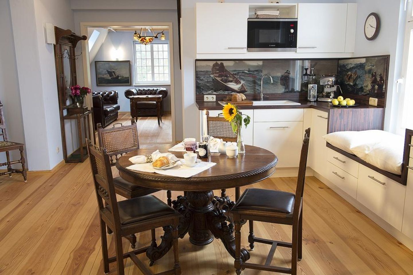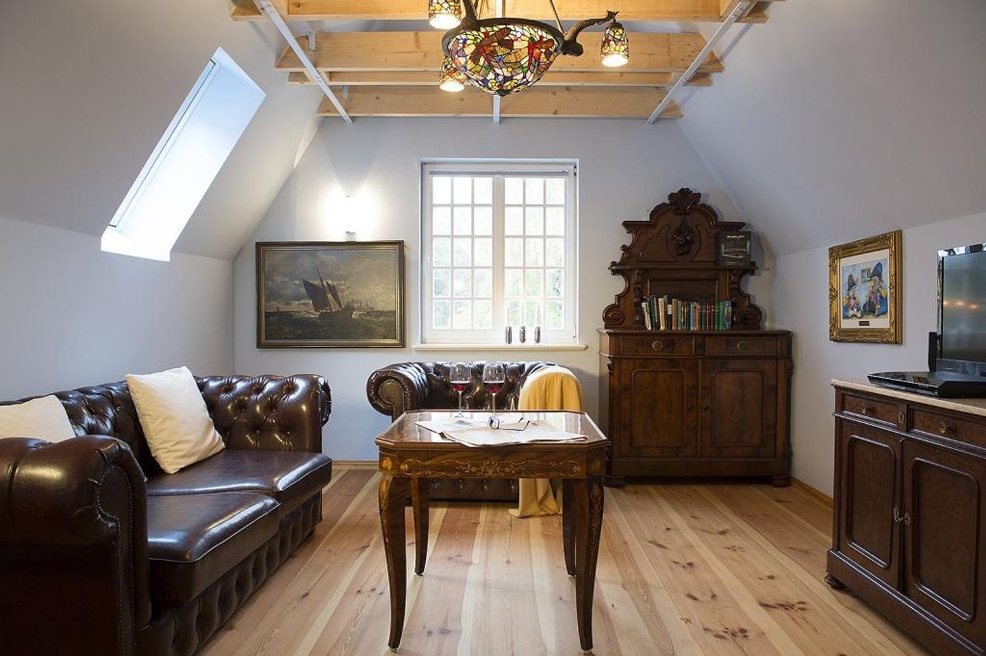 Appartement Nr. 46 Admiralssuite im historischen Westflügel von Schloss Stolpe, Süd-West Haffseite.1-3 Personen Appartement im 2. OG (Dachgeschoss) mit Blick aus dem Wohnzimmer zum Haff.