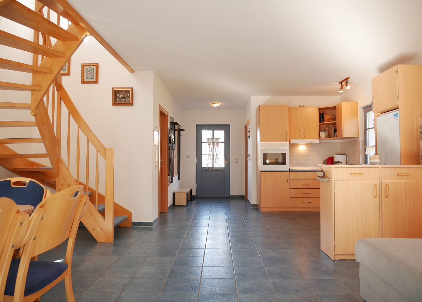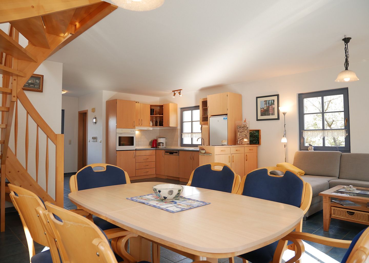 Die integrierte Küche ist mit allen notwendigen technischen Geräten, wie Kühlschrank mit Gefrierfach, Herd mit Backofen, Geschirrspülmaschine, Kaffeemaschine und diverse andere Utensilien ausgestattet und bietet Ihnen gute Möglichkeiten, sich bei Bedarf selbst zu versorgen.
