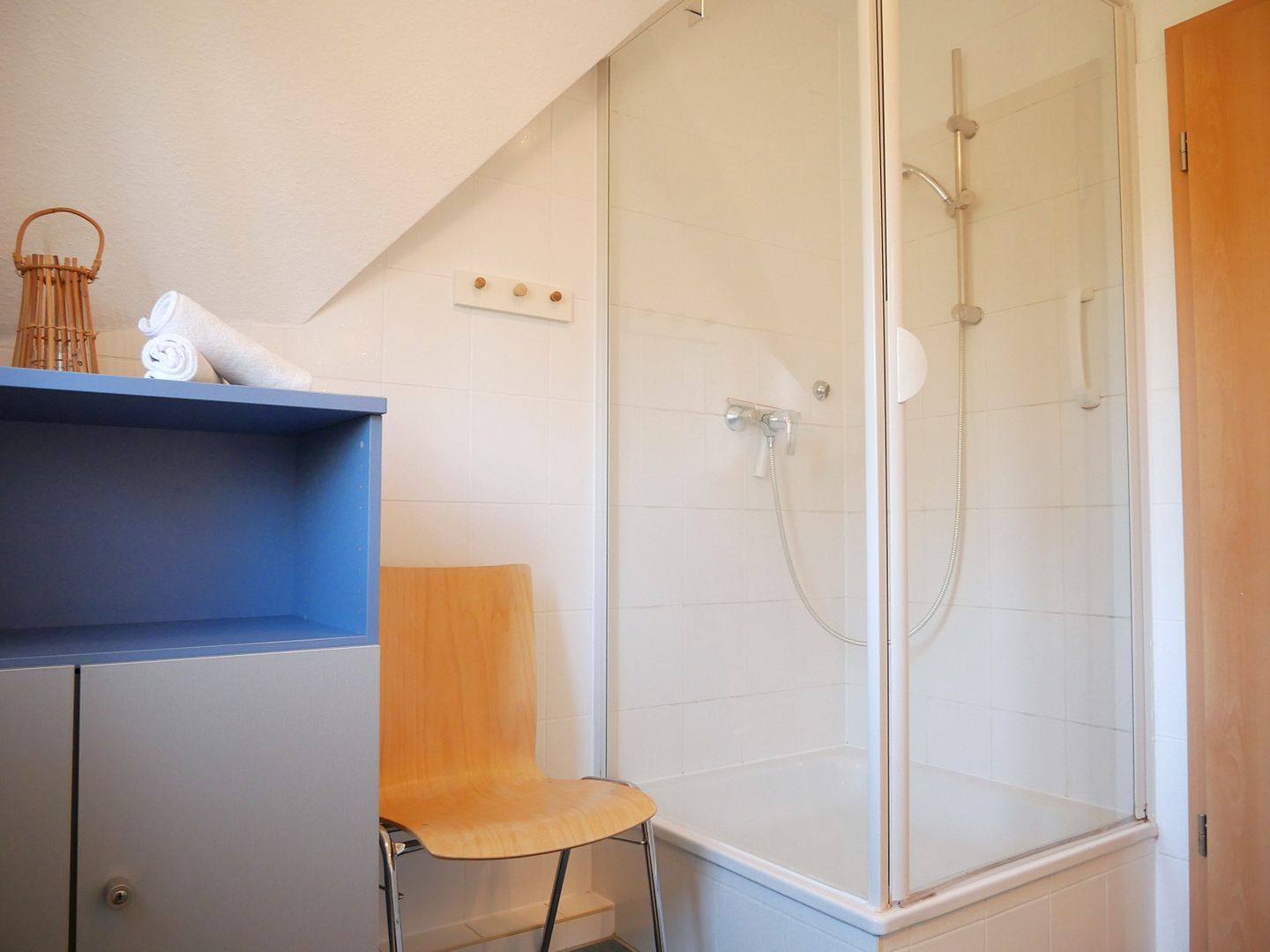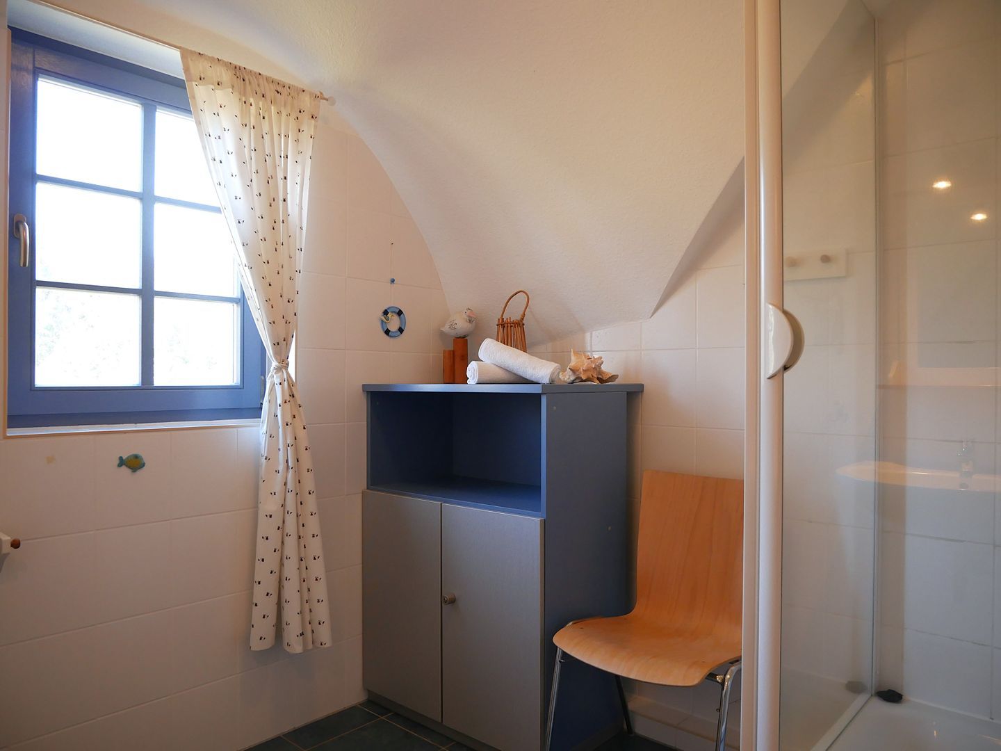 Weiterhin hält das Obergeschoss ein Tageslichtbadezimmer mit Dusche, Waschtisch und WC für Sie bereit. Ein zusätzliches Gäste-WC mit Fenster befindet sich in der unteren Etage.