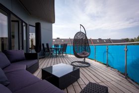 Im Wasserturm stehen Ihnen zahlreiche Möglichkeiten zur Entspannung und Aktivitäten im Freien zur Verfügung. Die Balkone laden dazu ein, die Sonne zu jeder Tageszeit zu genießen. Schaukeln Sie im Hängekorb und genießen Sie den Blick auf den umliegenden Wald oder lehnen Sie sich zurück und lassen Sie Ihren Blick über die weitläufige Wiese schweifen. An kühleren Tagen sorgt der Kamin für eine gemütliche Atmosphäre, während Sie im Sommer auf den Balkonen entspannte Grillabende verbringen können. Für zusätzliche Entspannung steht Ihnen im Erdgeschoss sogar eine Sauna zur Verfügung. Im Garten finden Sie eine überdachte Sitzecke und eine große Liegewiese, auf der Sie verschiedene Ballspiele oder Federball spielen können.