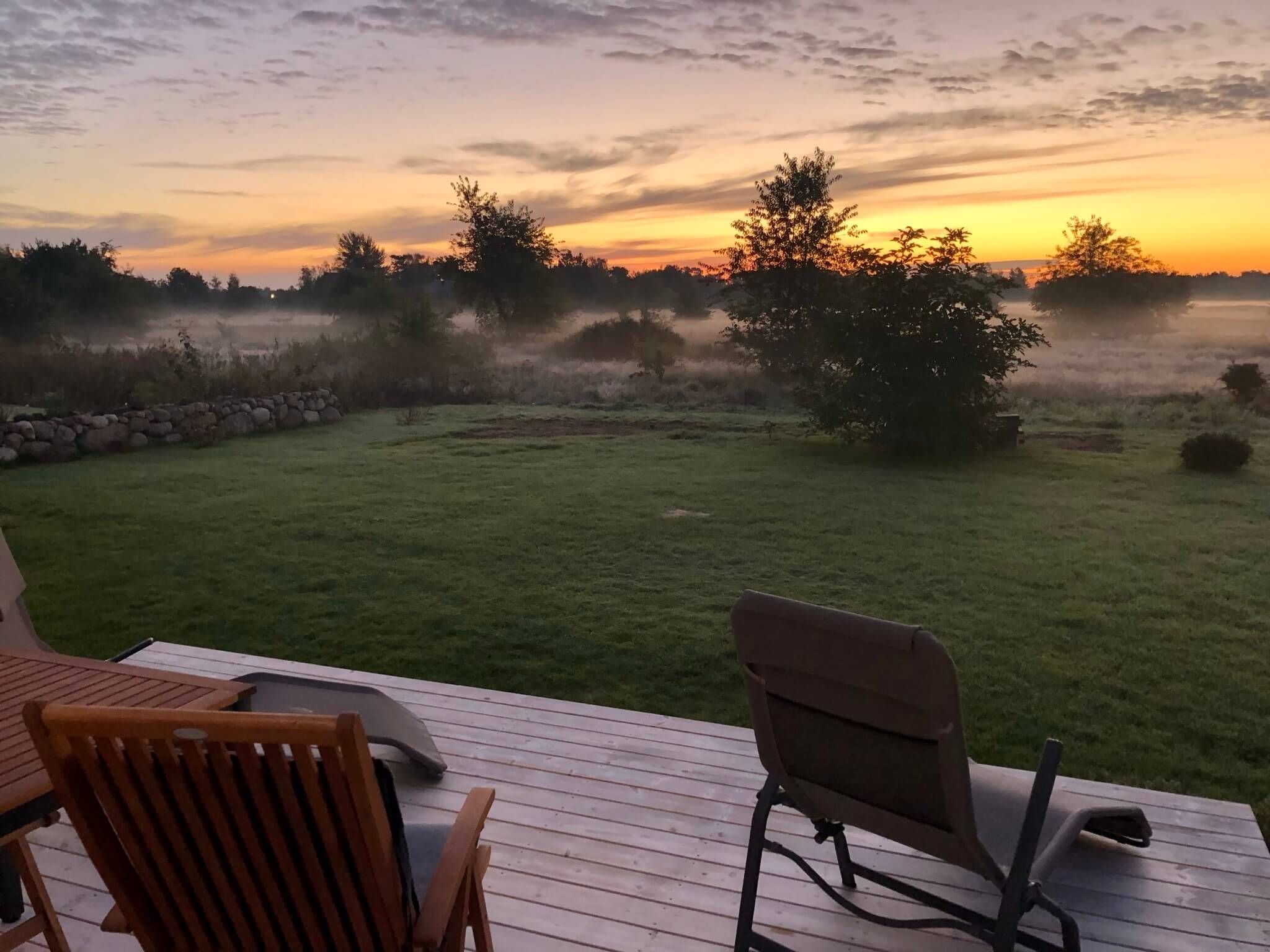 Über eine Holzterrasse gelangen Sie in den Garten, der sich zur üppigen und naturbelassenen Wildwiese öffnet und jederzeit einen sich im Wechsel der Jahreszeiten verändernden wunderschönen und reizvollen Ausblick bietet. Mit etwas Glück können Sie hier auch Wildtiere wie Rehe oder Seeadler beobachten. Der Bodden mit einer kleinen Badestelle und Liegewiese ist fußläufig entfernt und bietet eine willkommene Erfrischung an heißen Sommertagen.