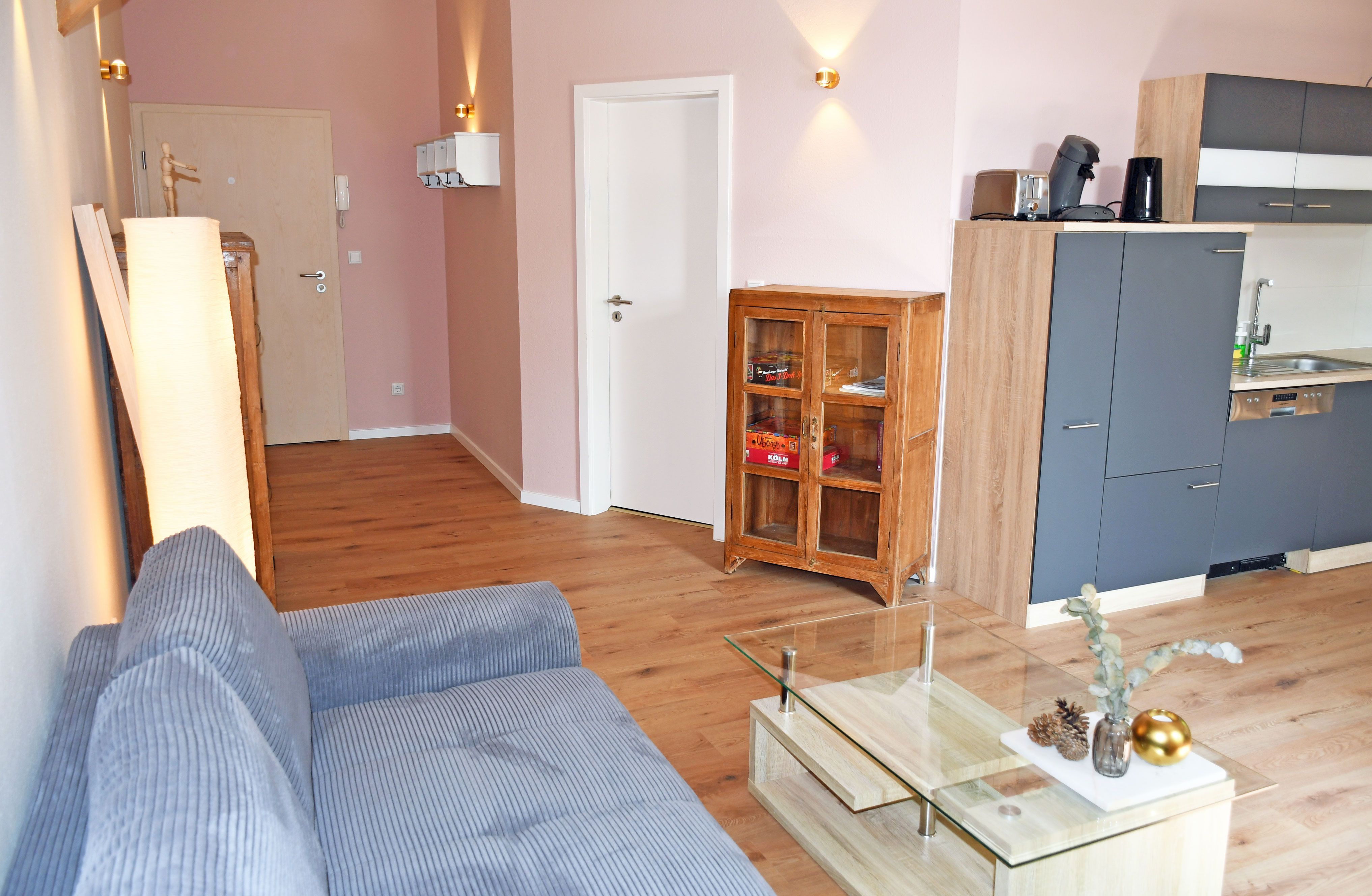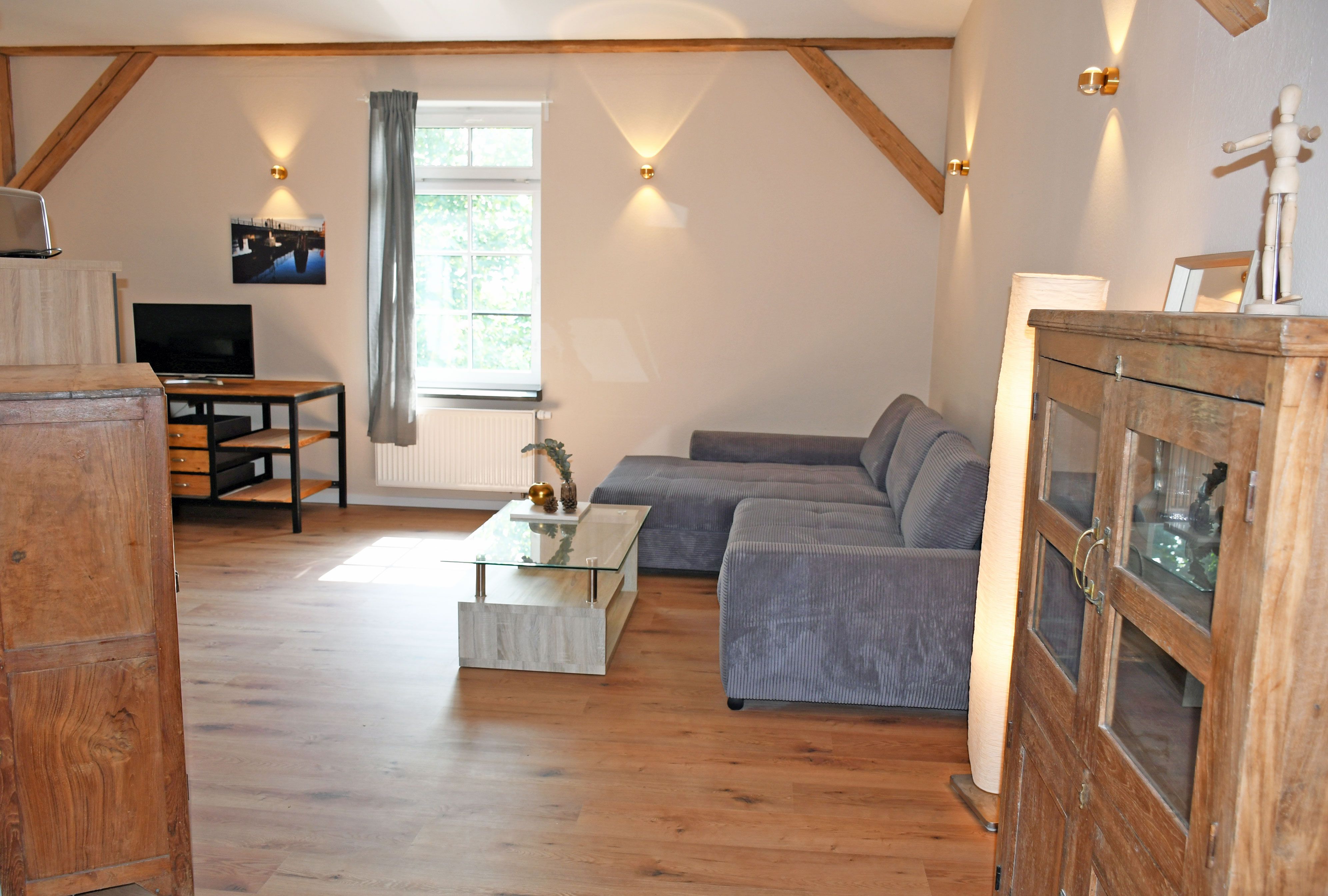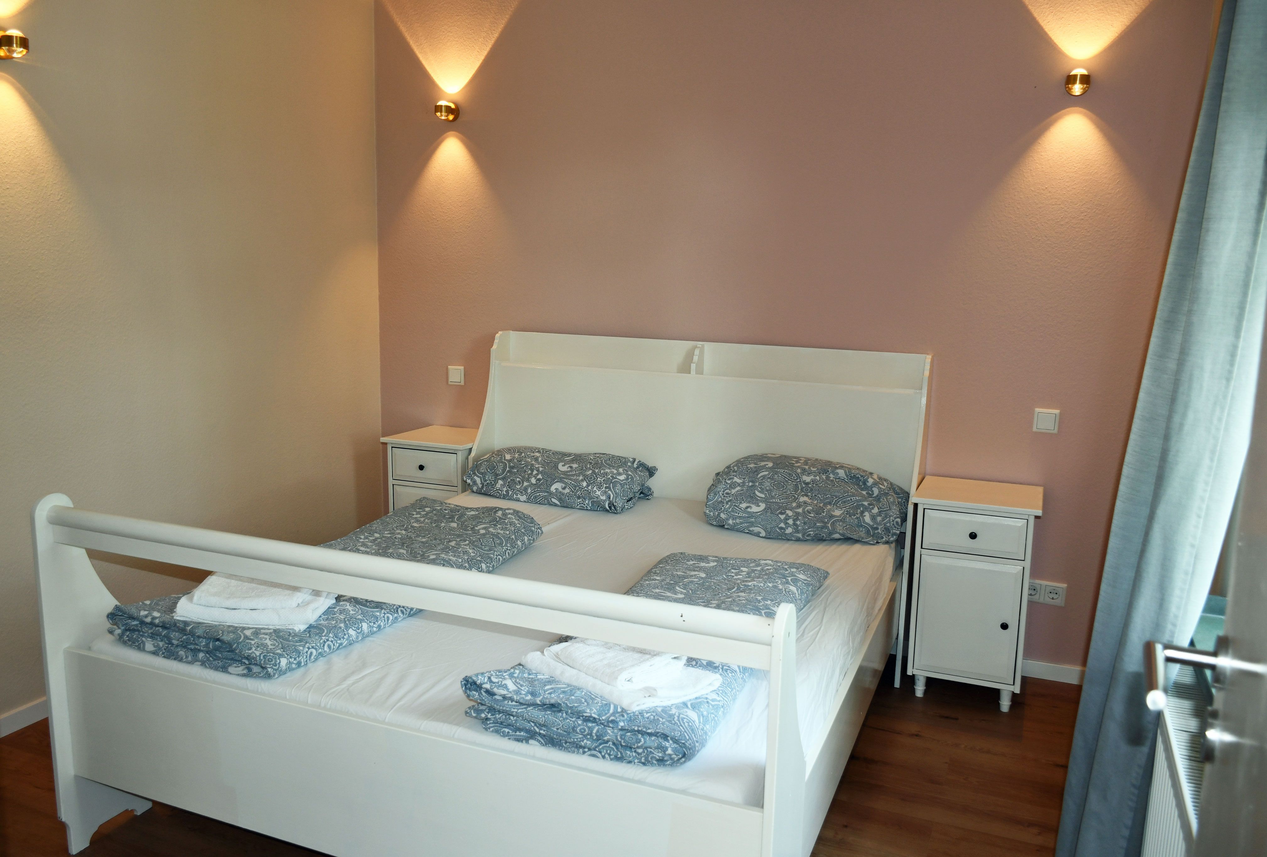 Unsere 50qm große Ferienwohnung bietet Ihnen ein komfortables Zuhause auf Zeit. Sie verfügt über ein separates Schlafzimmer mit Doppelbett, ein großes Wohnzimmer mit Schlafsofa und eine voll ausgestattete Küche. Die große Ferienwohnung liegt in der 1. Etage.