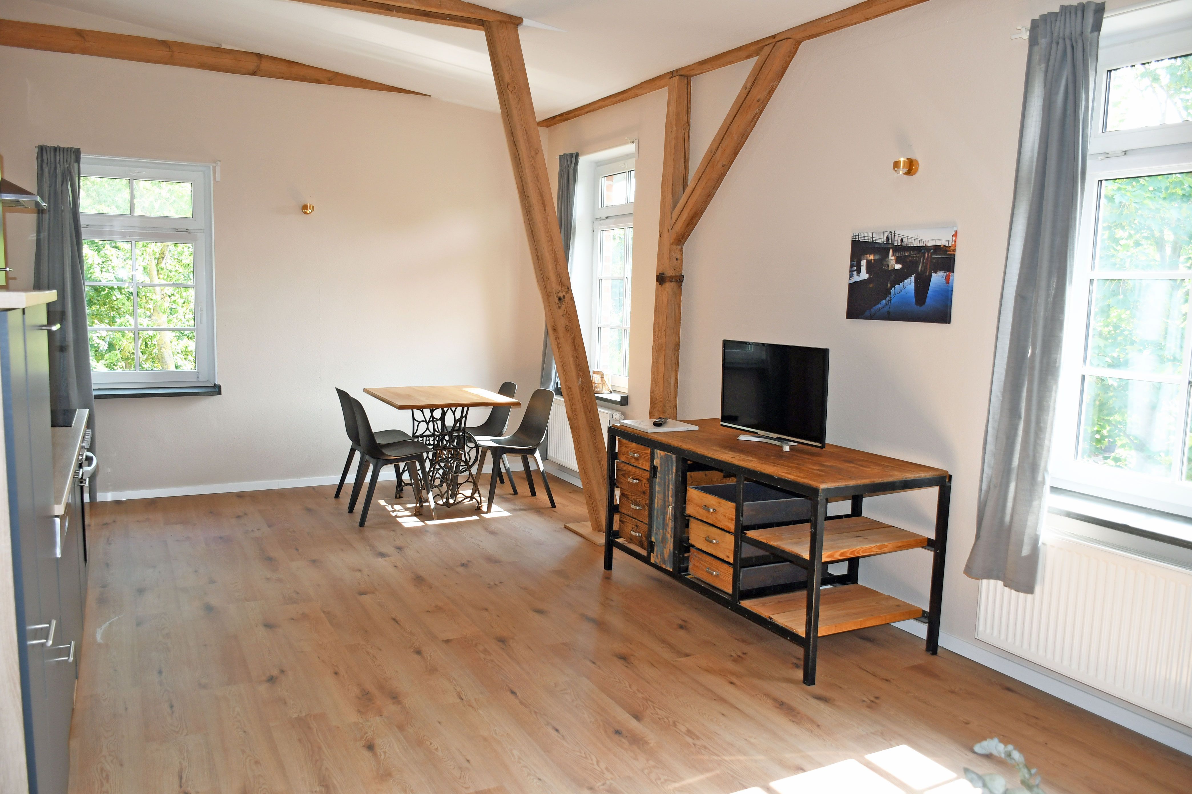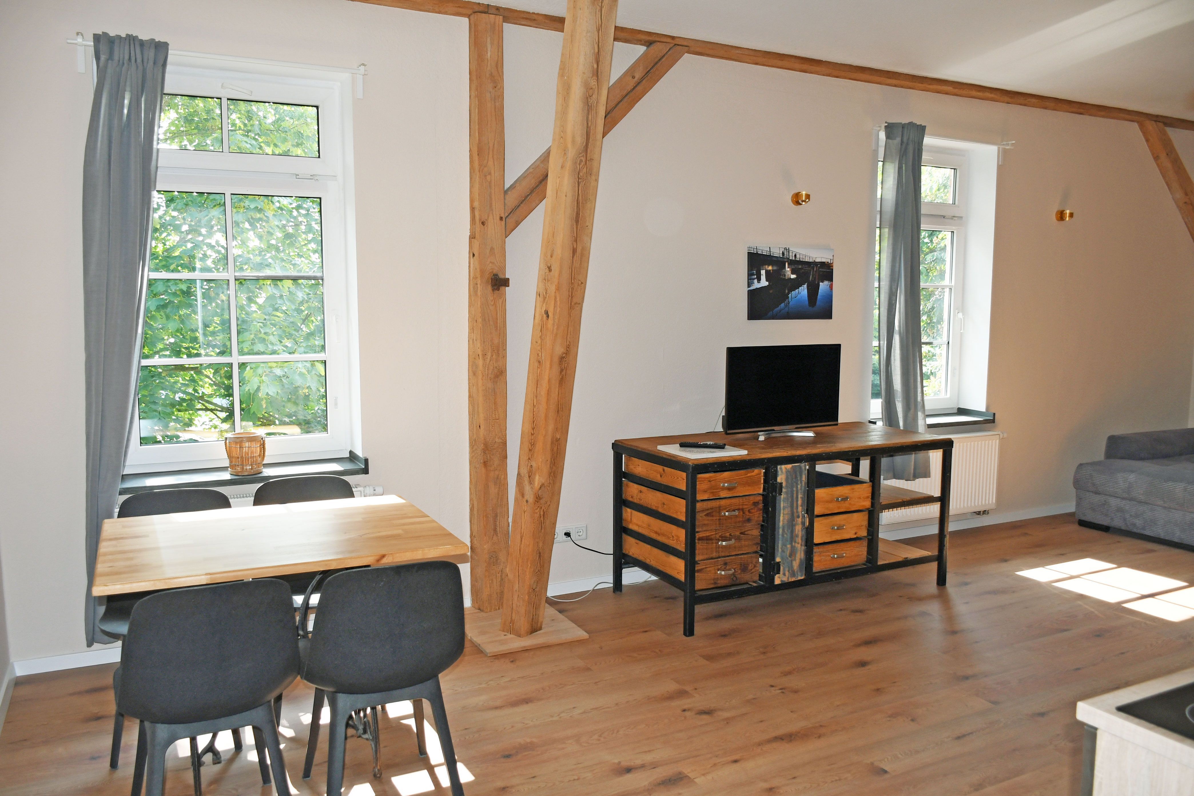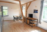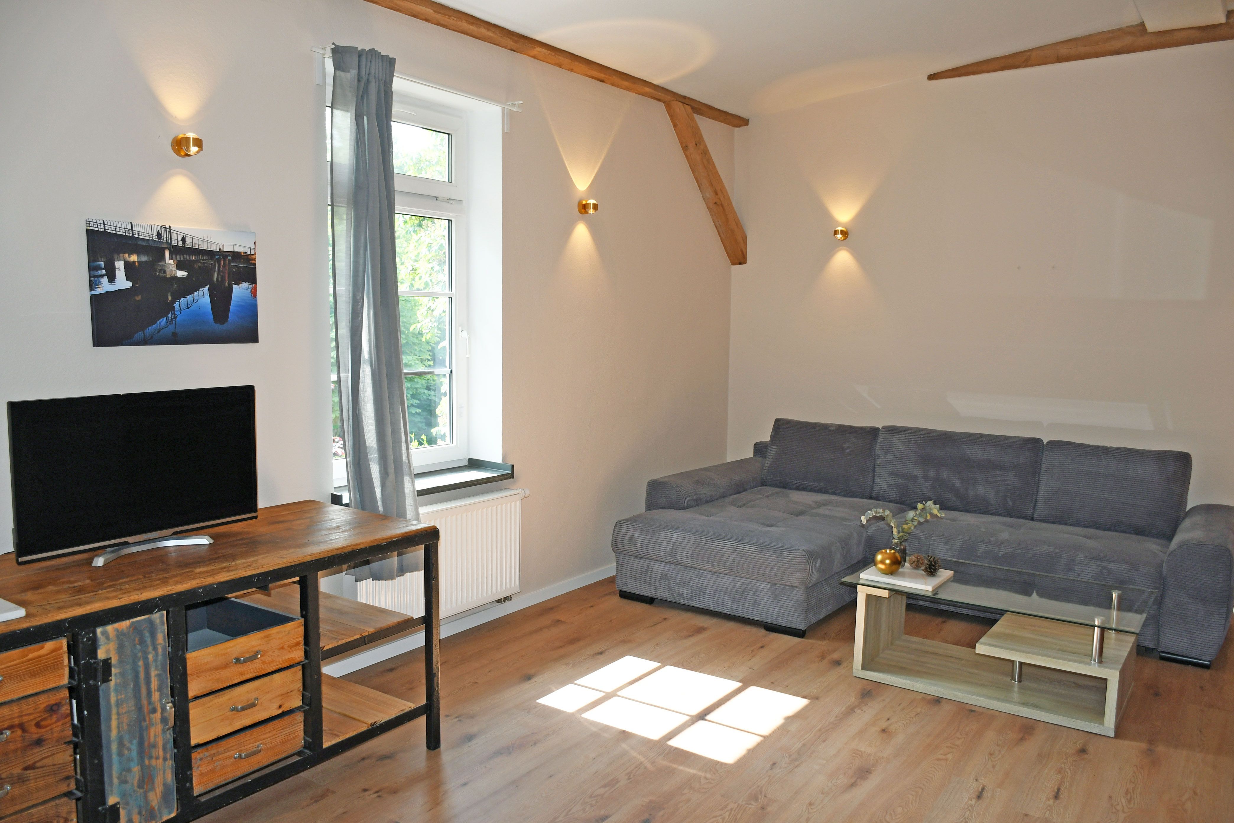 Unsere 50qm große Ferienwohnung bietet Ihnen ein komfortables Zuhause auf Zeit. Sie verfügt über ein separates Schlafzimmer mit Doppelbett, ein großes Wohnzimmer mit Schlafsofa und eine voll ausgestattete Küche. Die große Ferienwohnung liegt in der 1. Etage.