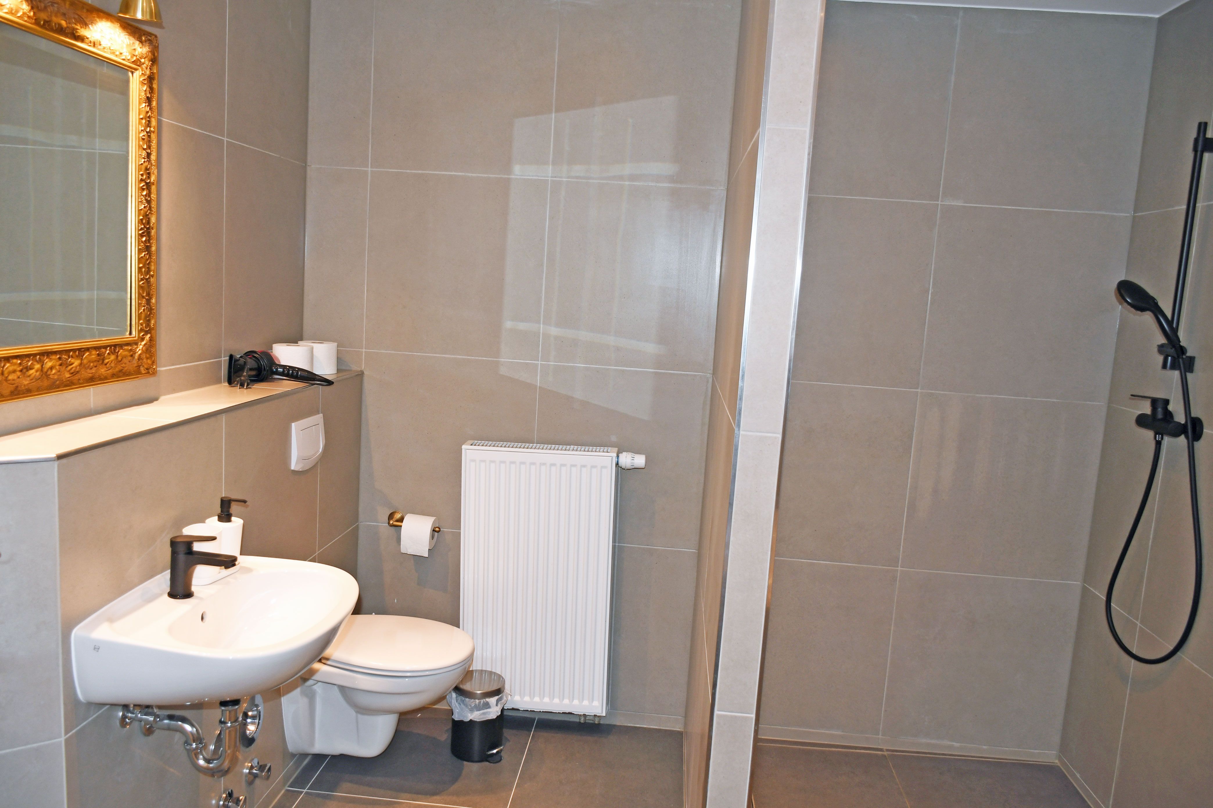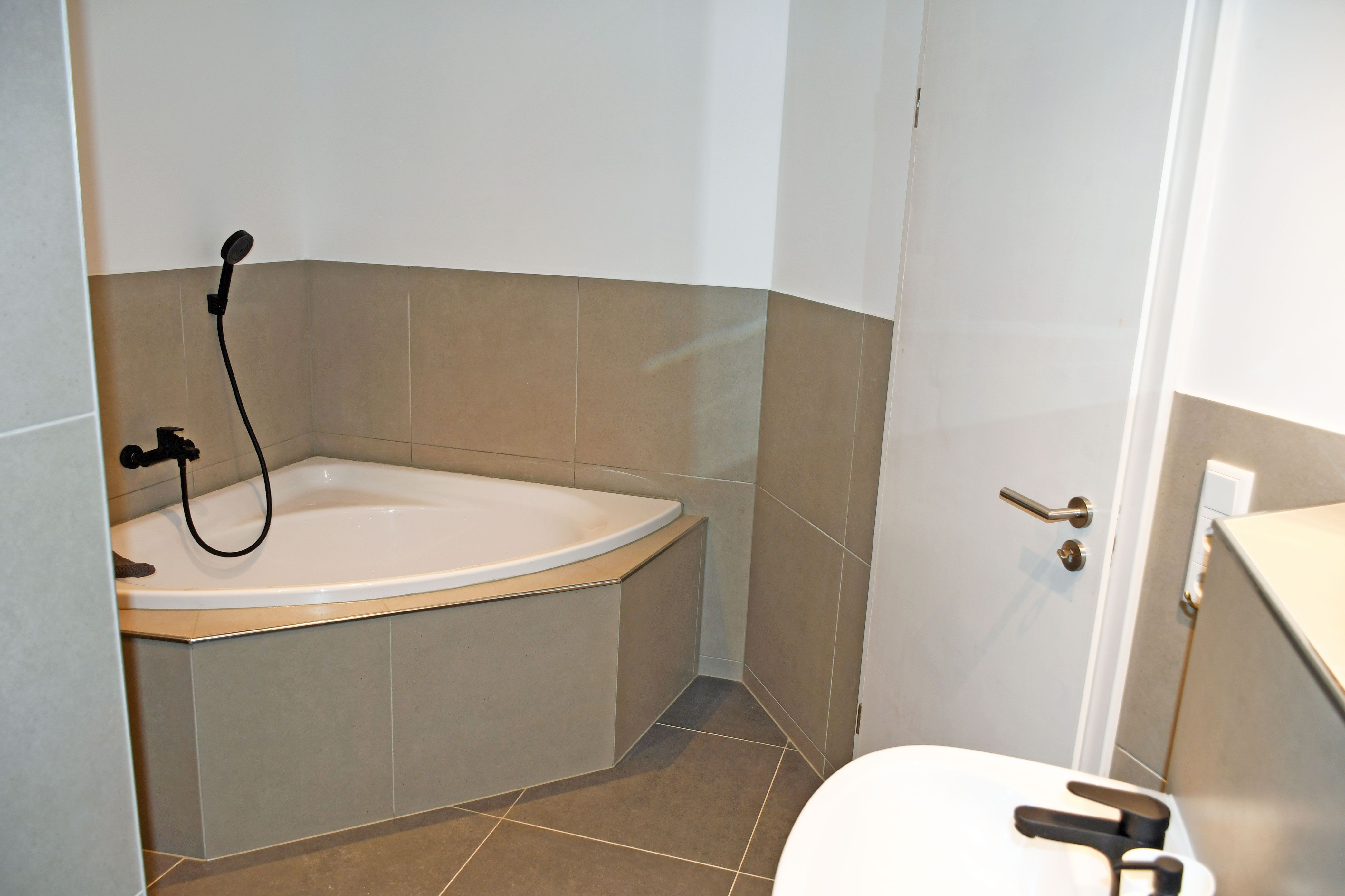 Das Bad ist mit Dusche, Eckbadewanne, WC und Waschtisch ausgestattet und verfügt über Tageslicht.