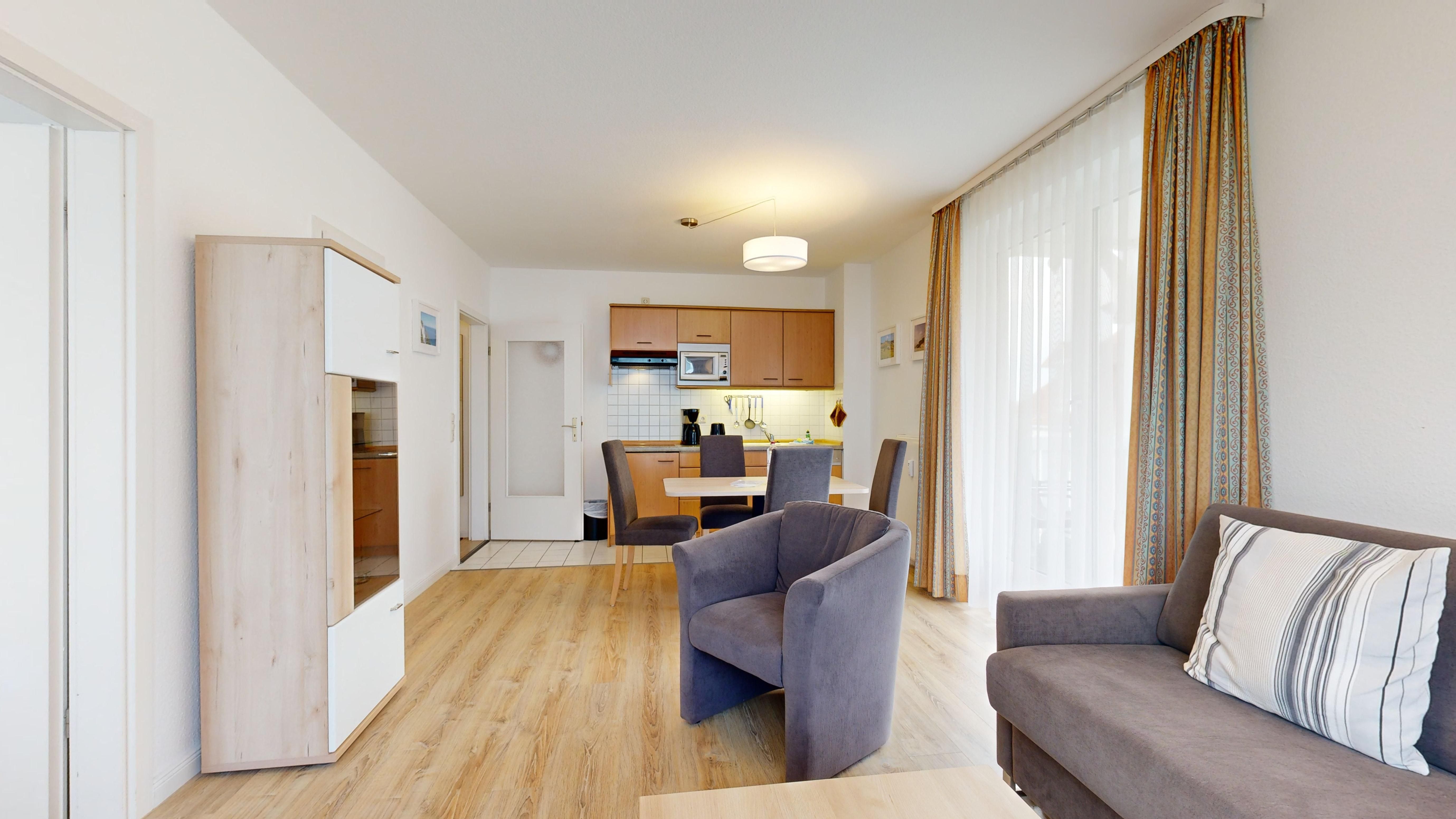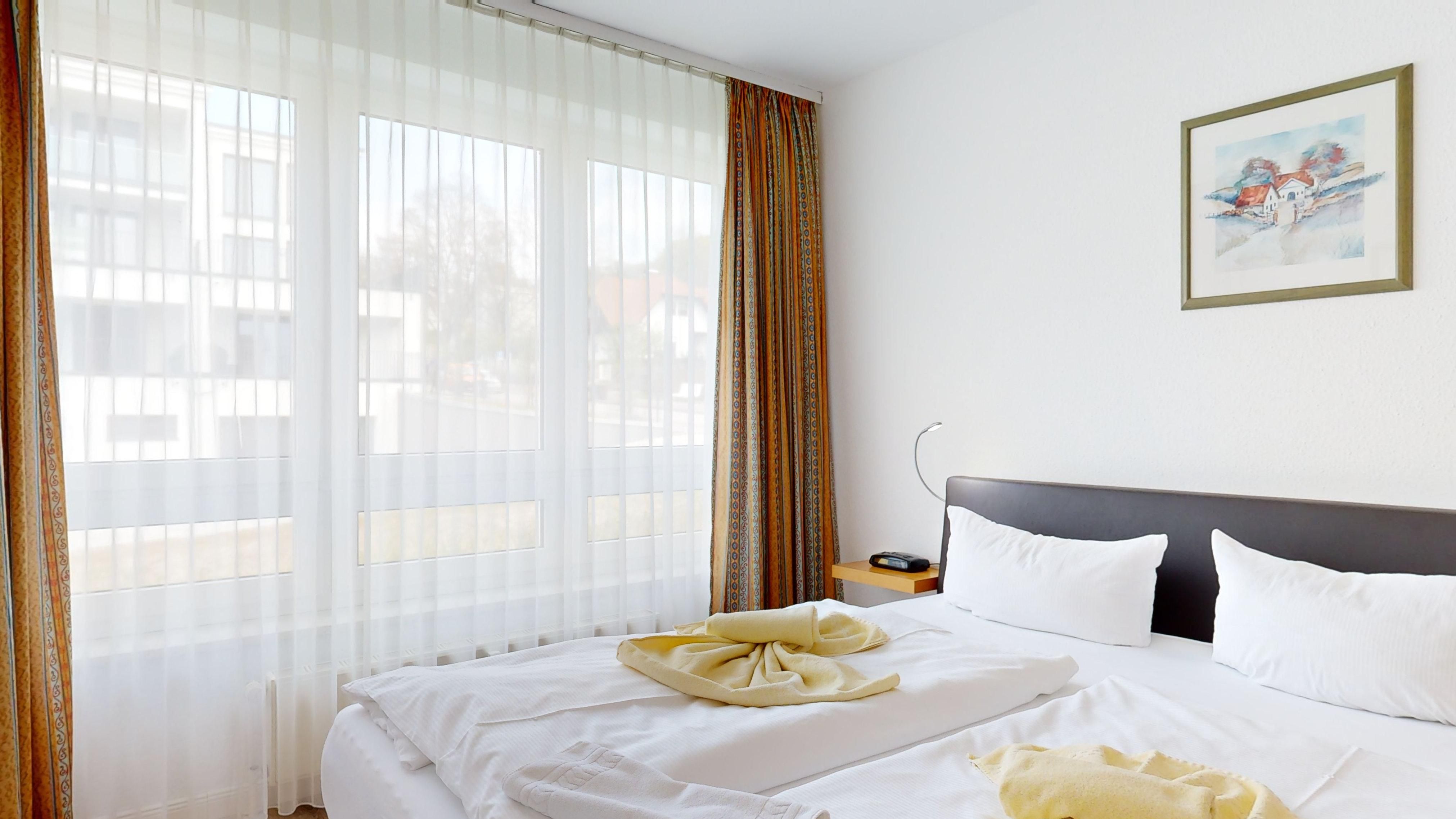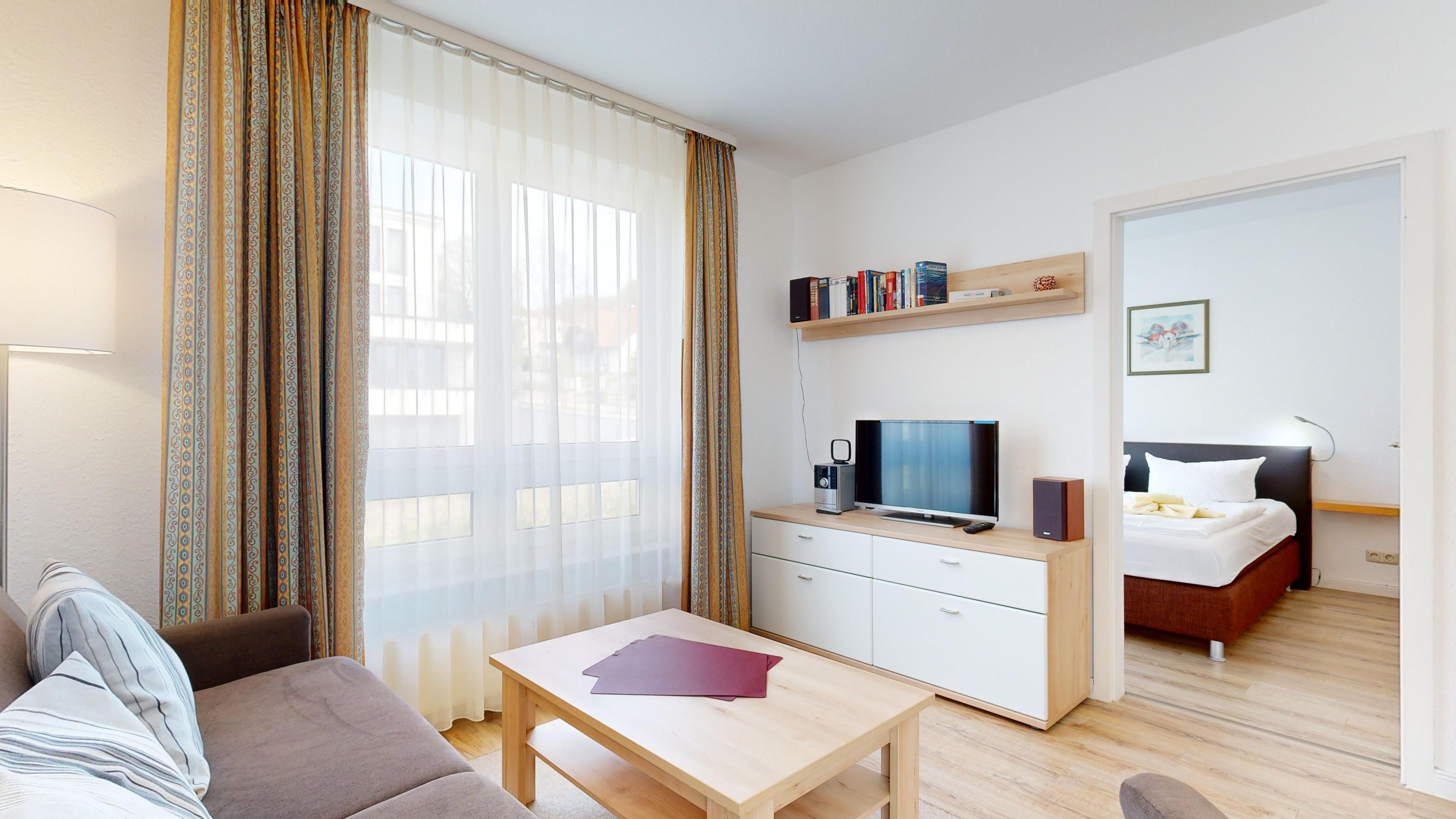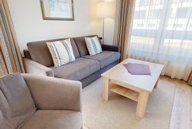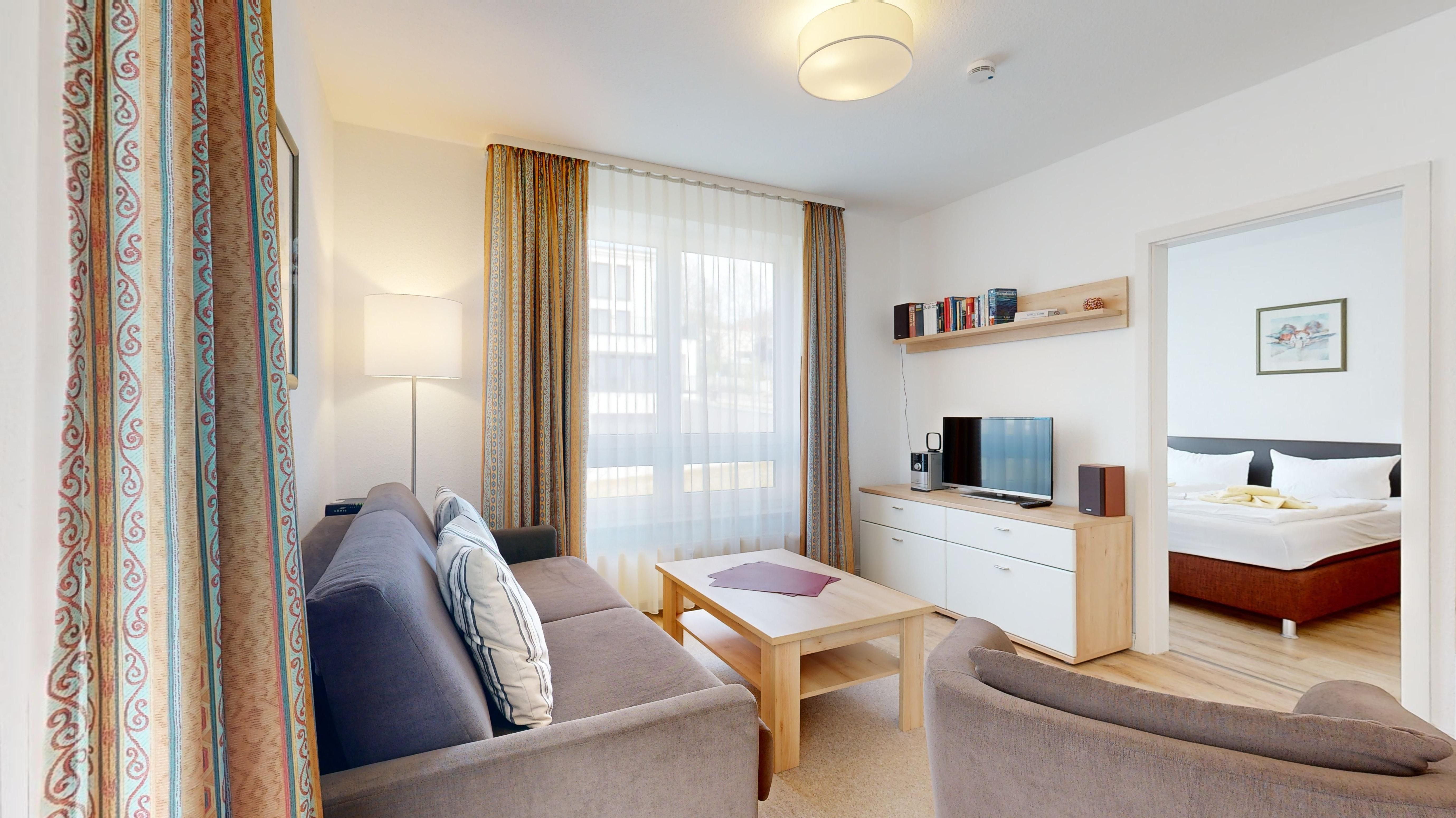 Ferienwohnung Binzer Sterne 15 für bis zu 4 Personen im 1. Obergeschoss (2 Zimmer / 45 m²) des Appartementhauses Binzer Sterne, 1 Schlafzimmer, Parkplatz (gegen Gebühr) und freies WLAN.