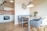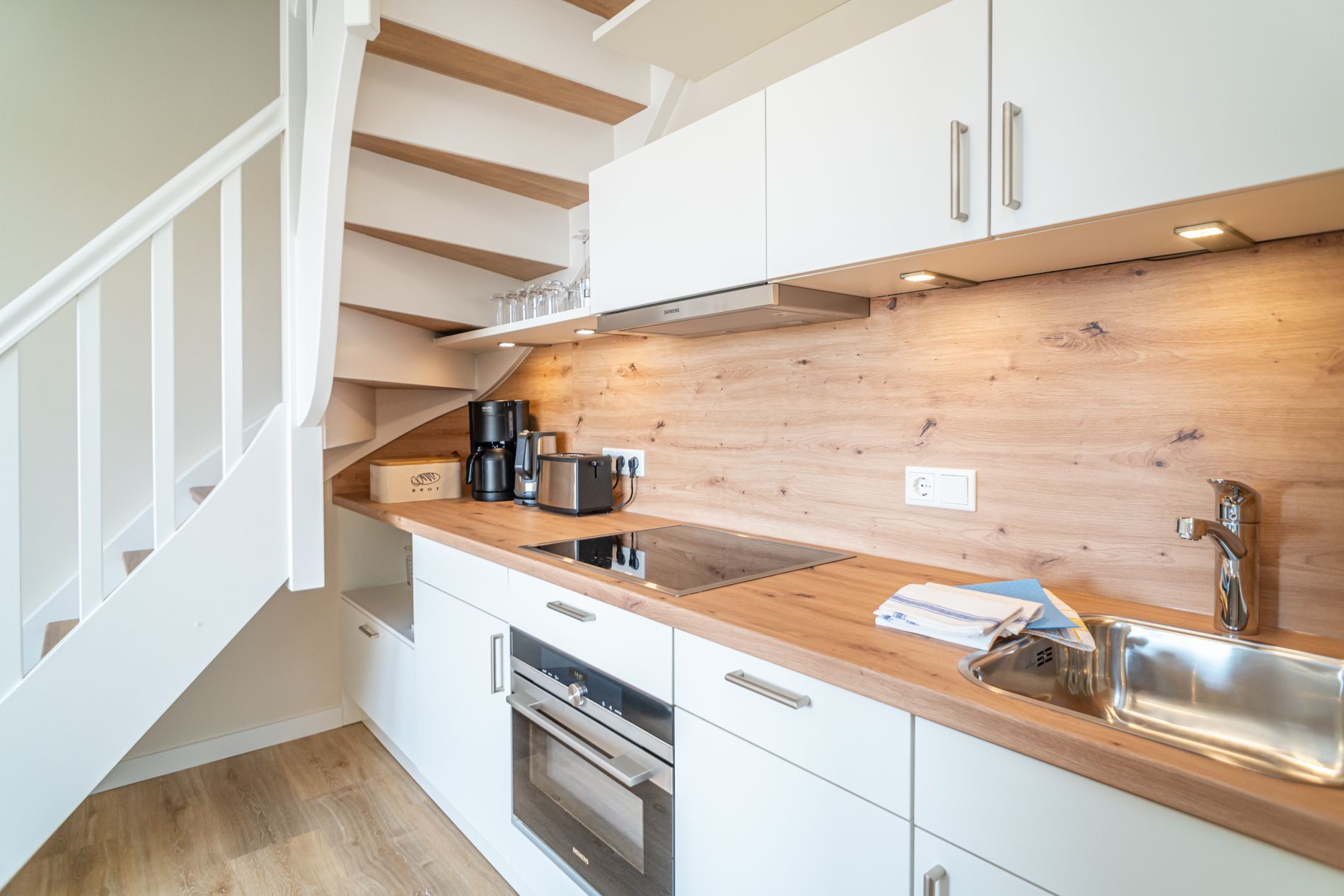 Die offene Küche ist voll ausgestattet mit einem Geschirrspüler, einem Kombi-Backofen mit Mikrowellenfunktion, einem Ceranfeld mit 4 Kochfeldern und einem Kühlschrank mit 3-Sterne-Gefrierfach. Zur Grundausstattung zählen außerdem Kaffeemaschine, Wasserkocher und Toaster.