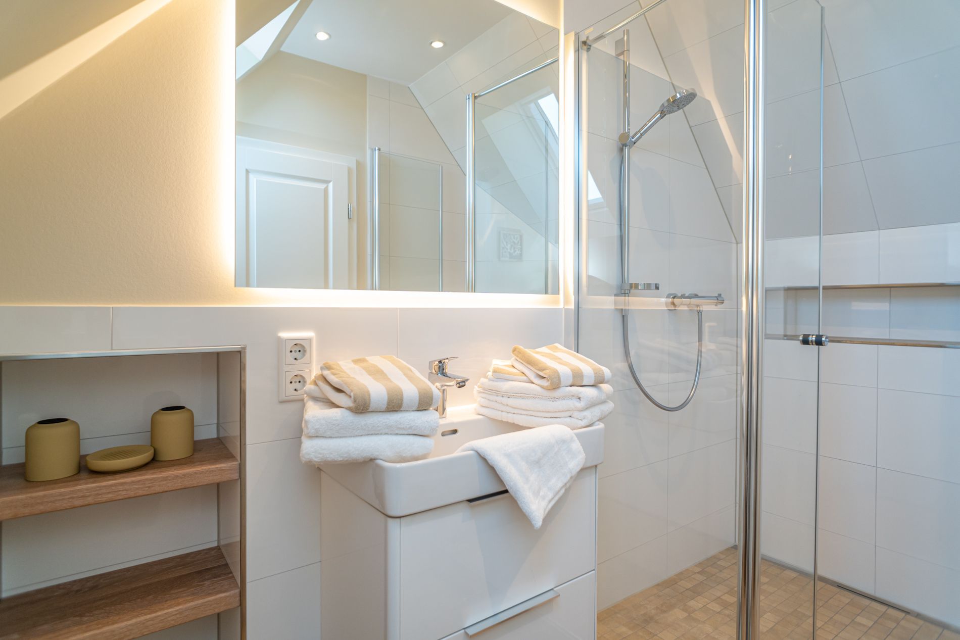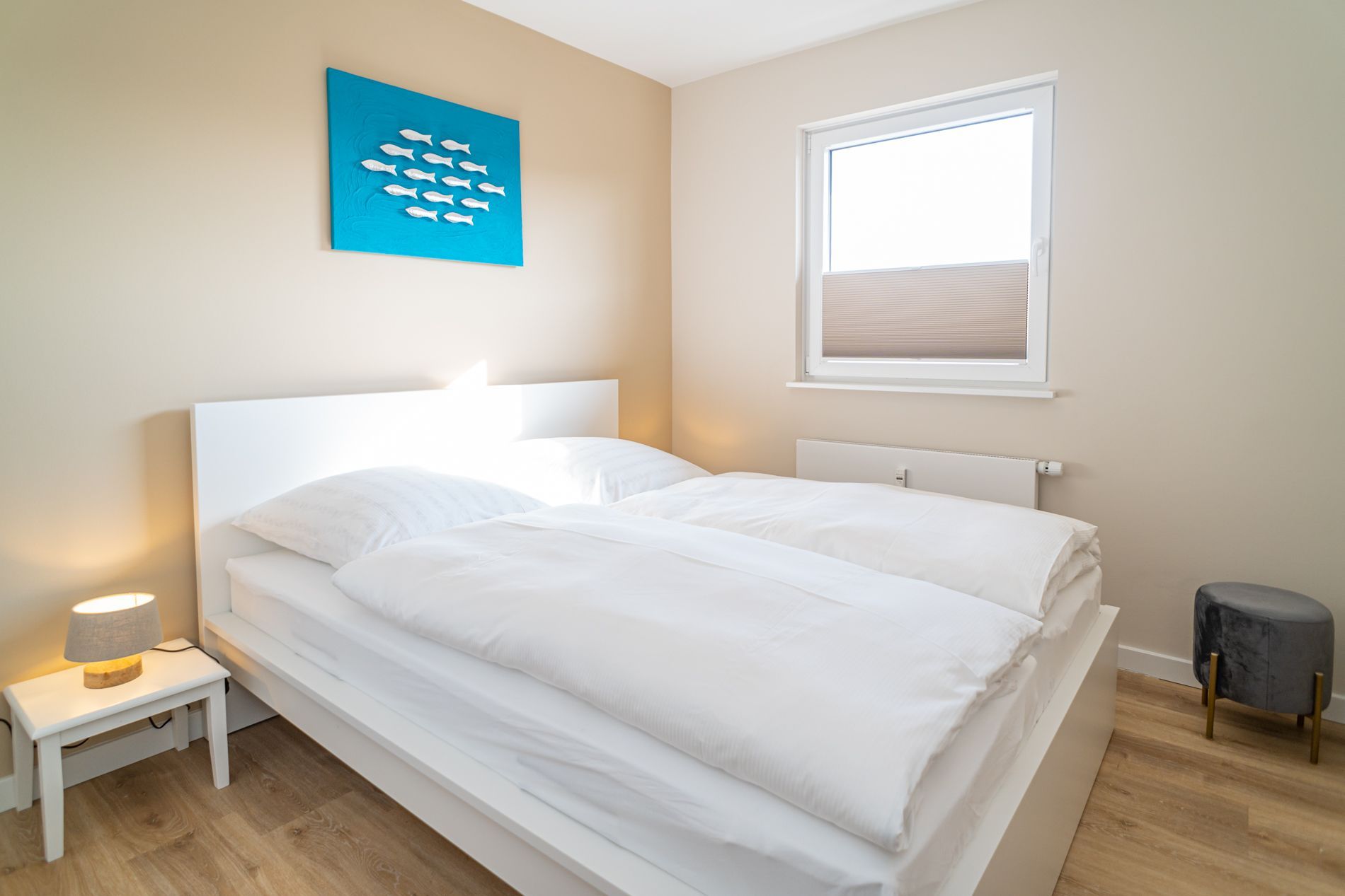 Im Schlafzimmer erwartet Sie ein Doppelbett (Liegefläche 1,80 x 2,00 m, bestehend aus zwei Einzelmatratzen) für erholsamen Schlaf. Das helle Hauptbadezimmer bietet eine Dusche, ein WC, einen Handtuchtrockner und einen Waschtisch.