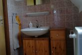 Im Obergeschoss sind zwei Zimmer, eins mit einem Doppelbett, das andere mit zwei einzelnen Betten und das Bad mit Dusche, WC und Waschbecken ist auch dort.
