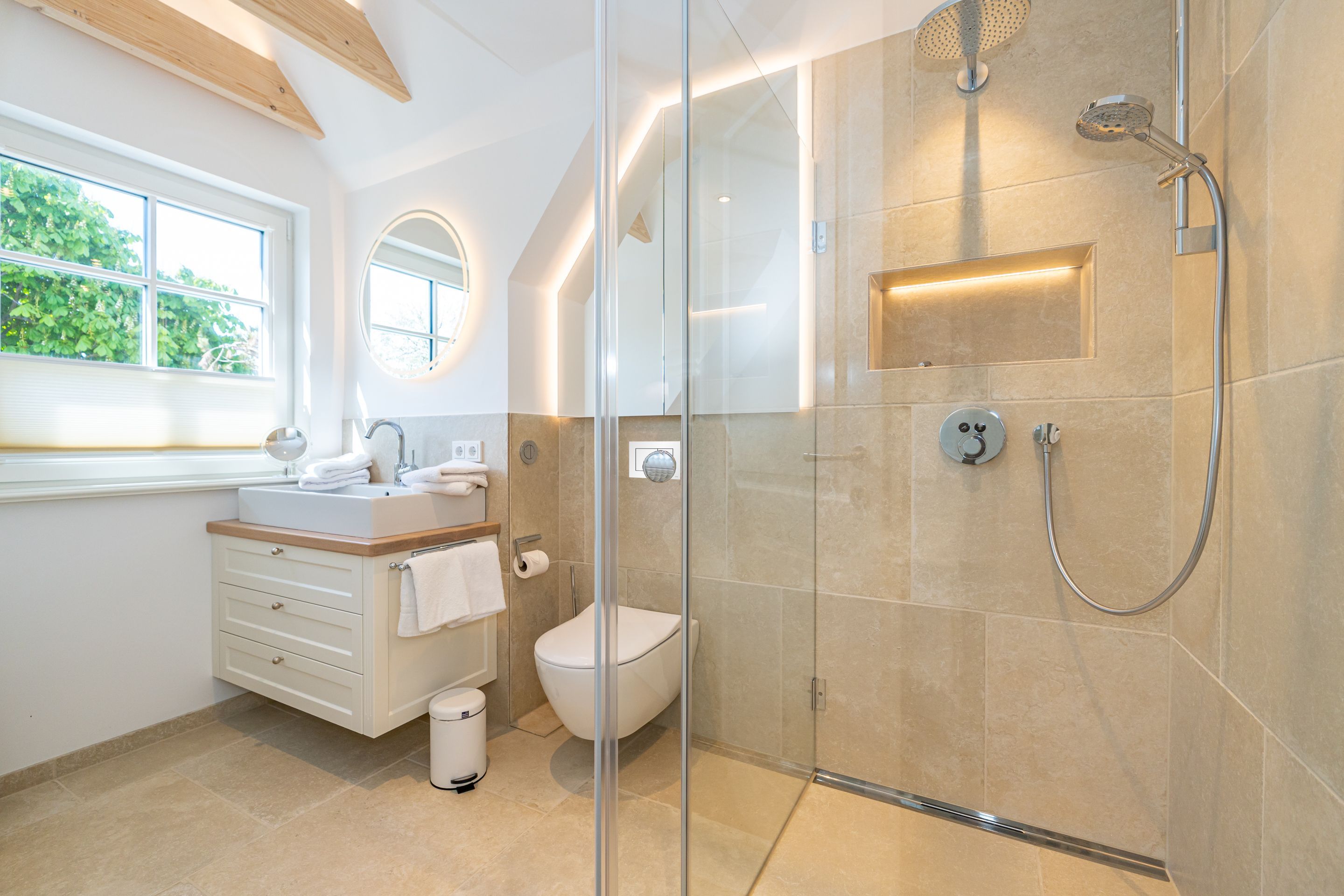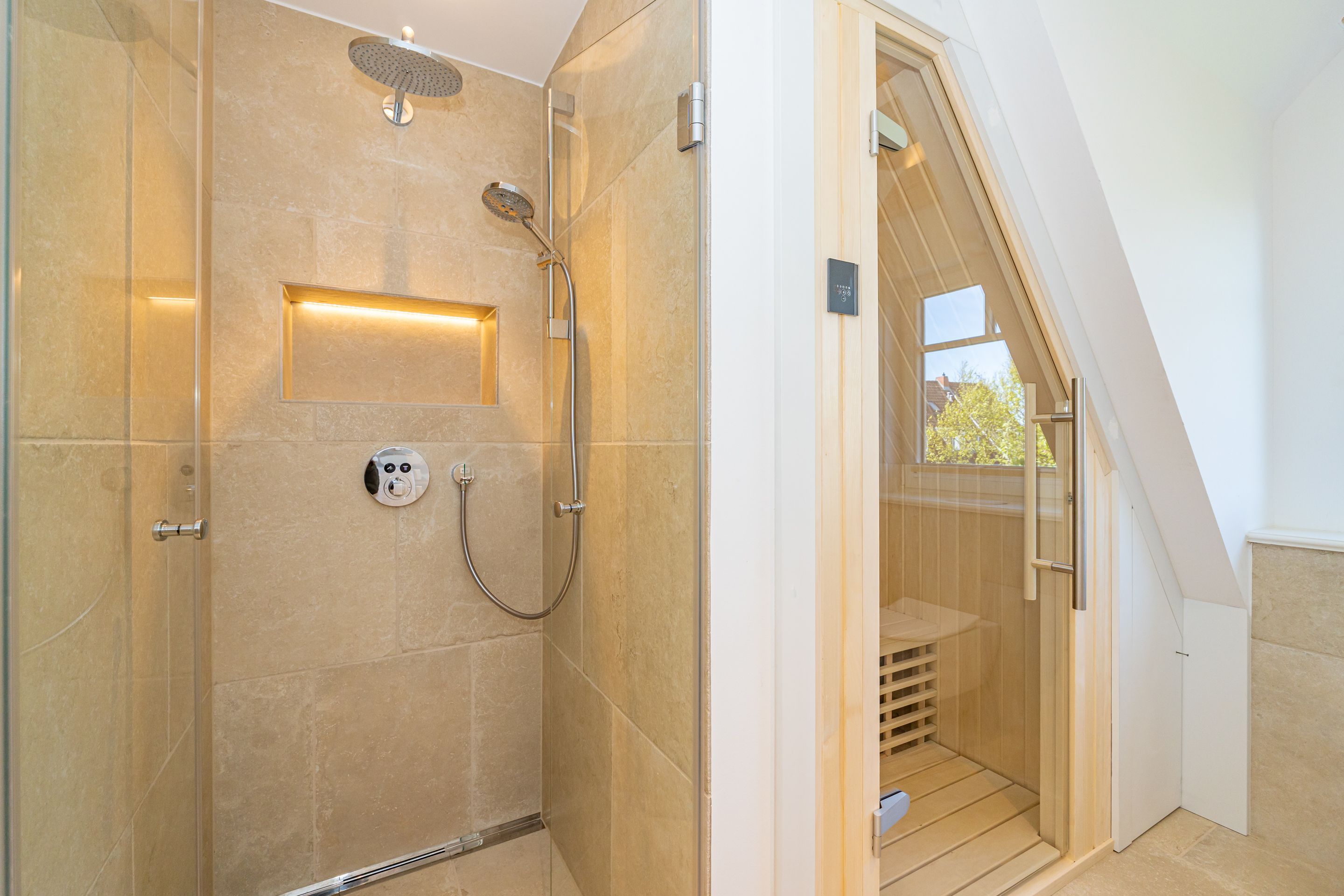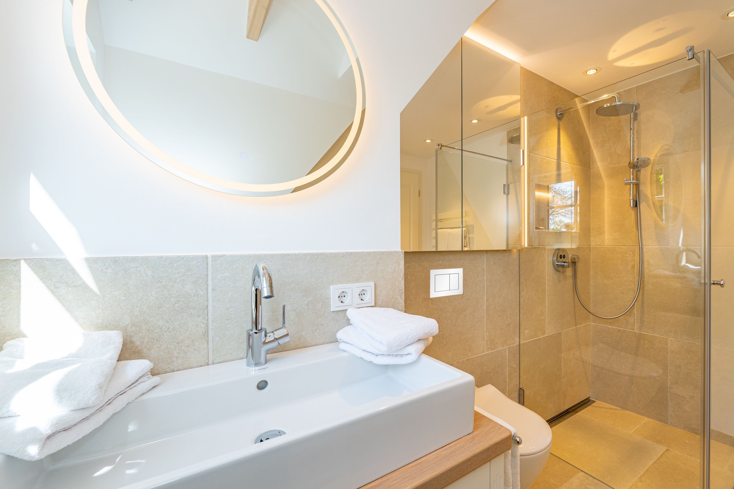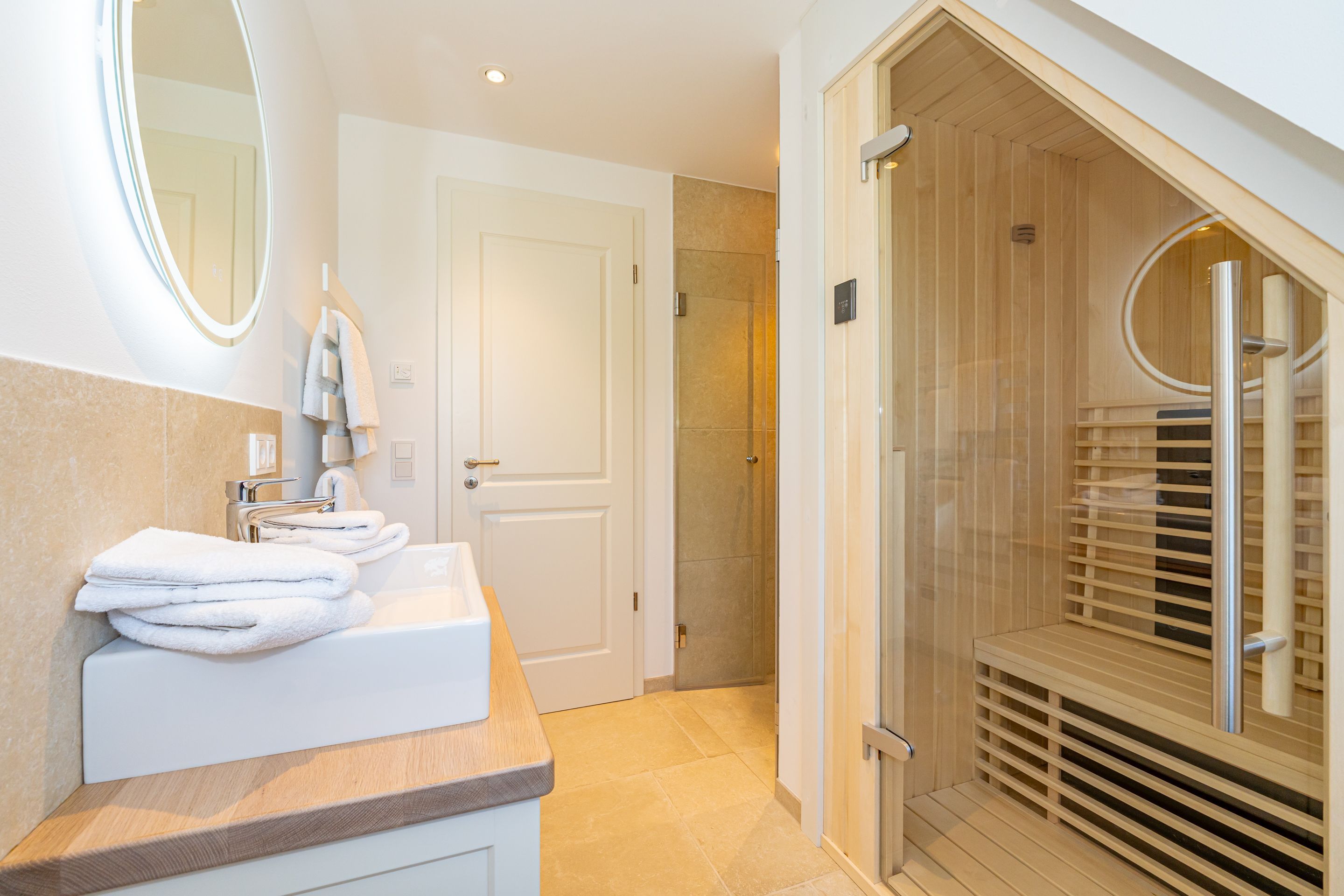 • Extra-Duschbad mit bodengleicher Dusche, Waschtisch, Handtuchwärmer, Haartrockner, Kosmetikspiegel, WC, Außenfenster und Infrarotsauna -für entspannte Momente
