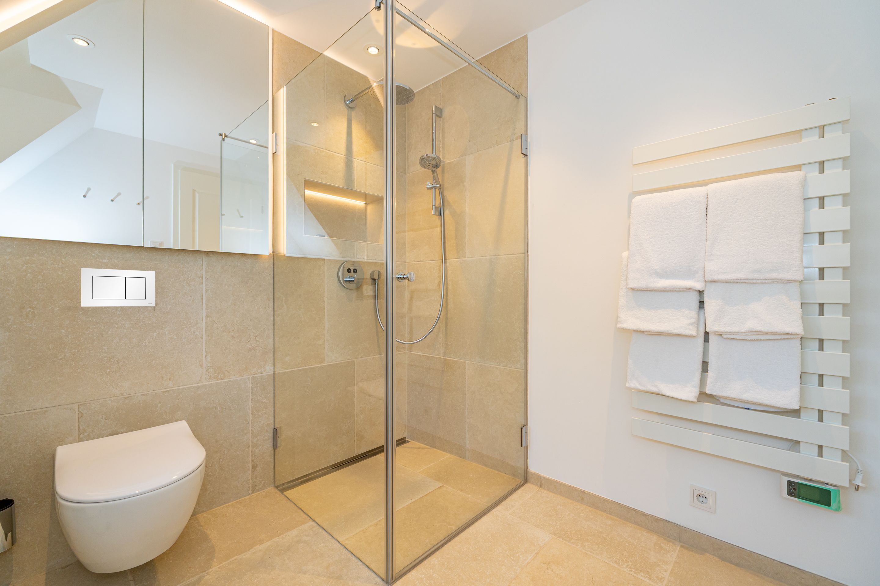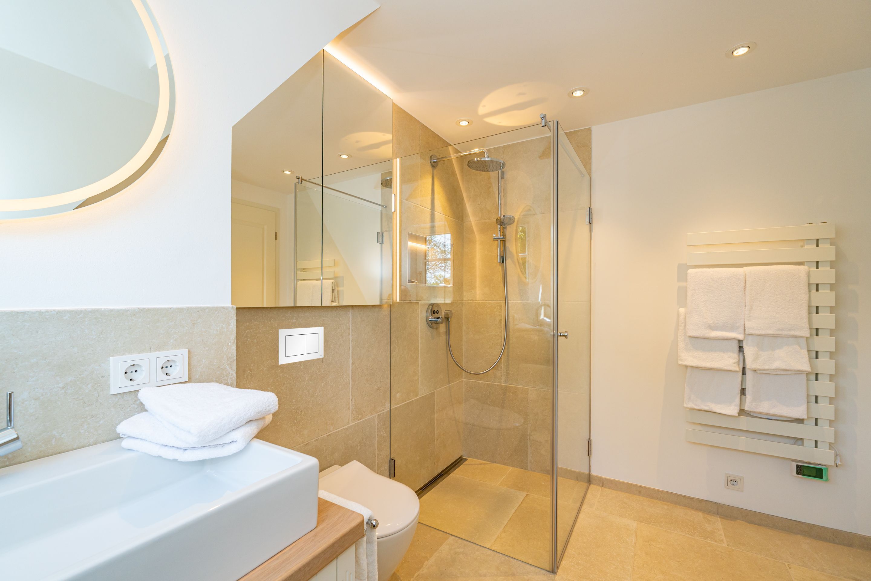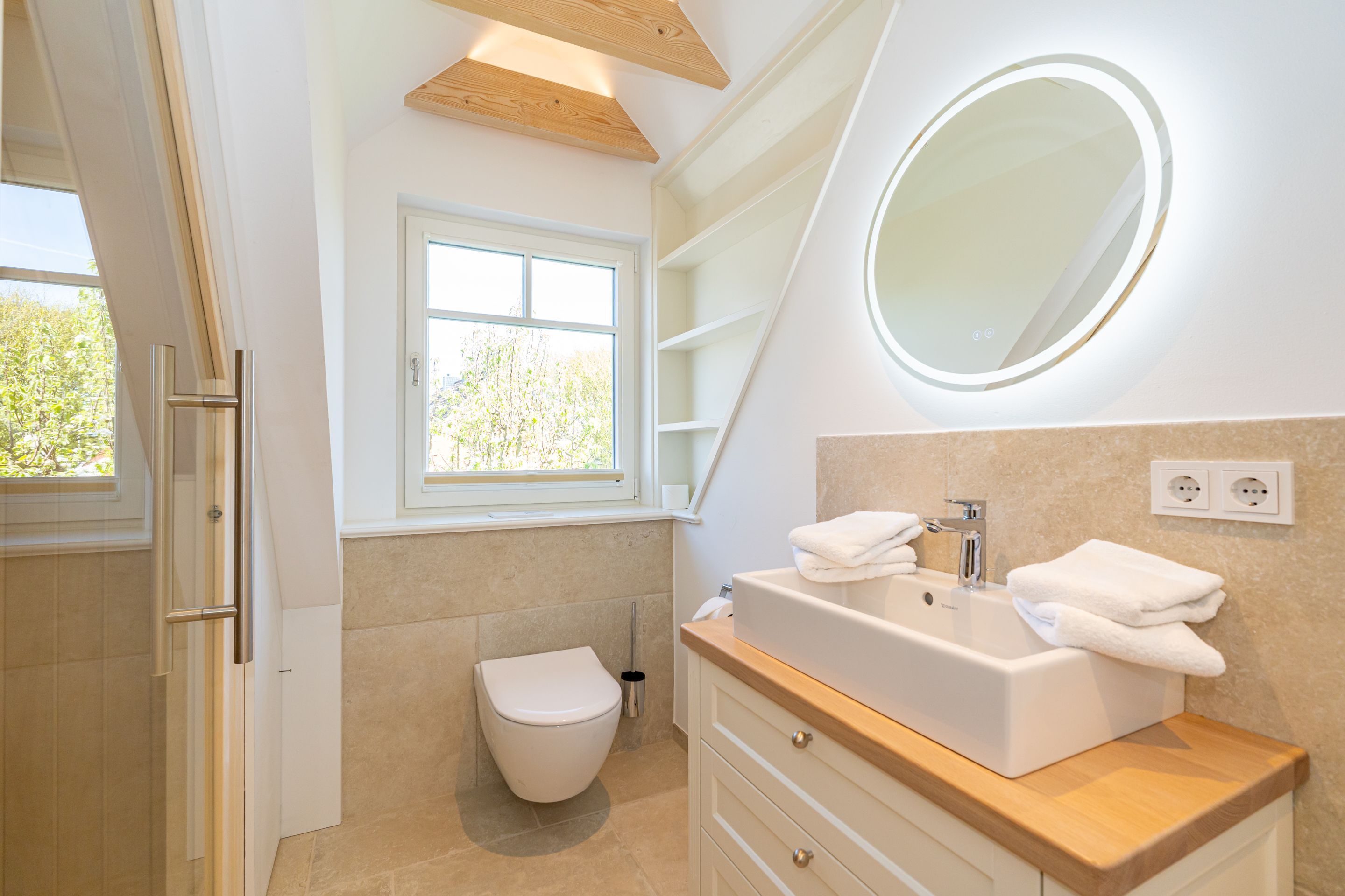 • Extra-Duschbad mit bodengleicher Dusche, Waschtisch, Handtuchwärmer, Haartrockner, Kosmetikspiegel, WC, Außenfenster und Infrarotsauna -für entspannte Momente