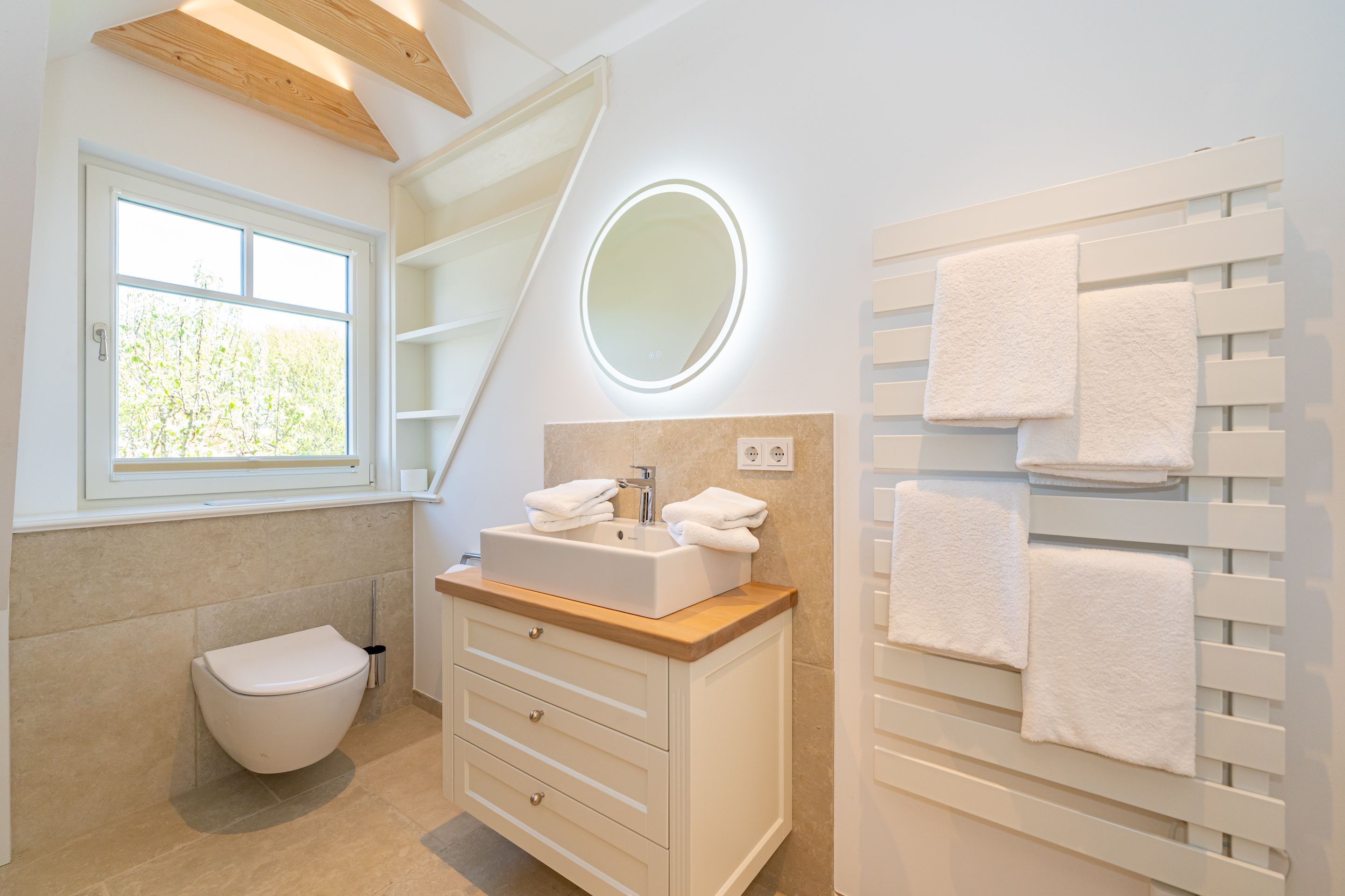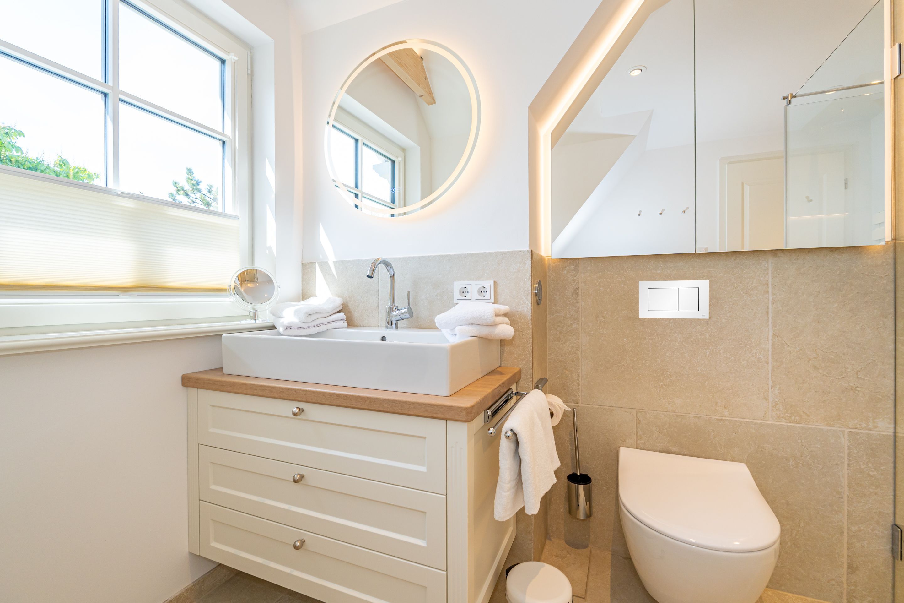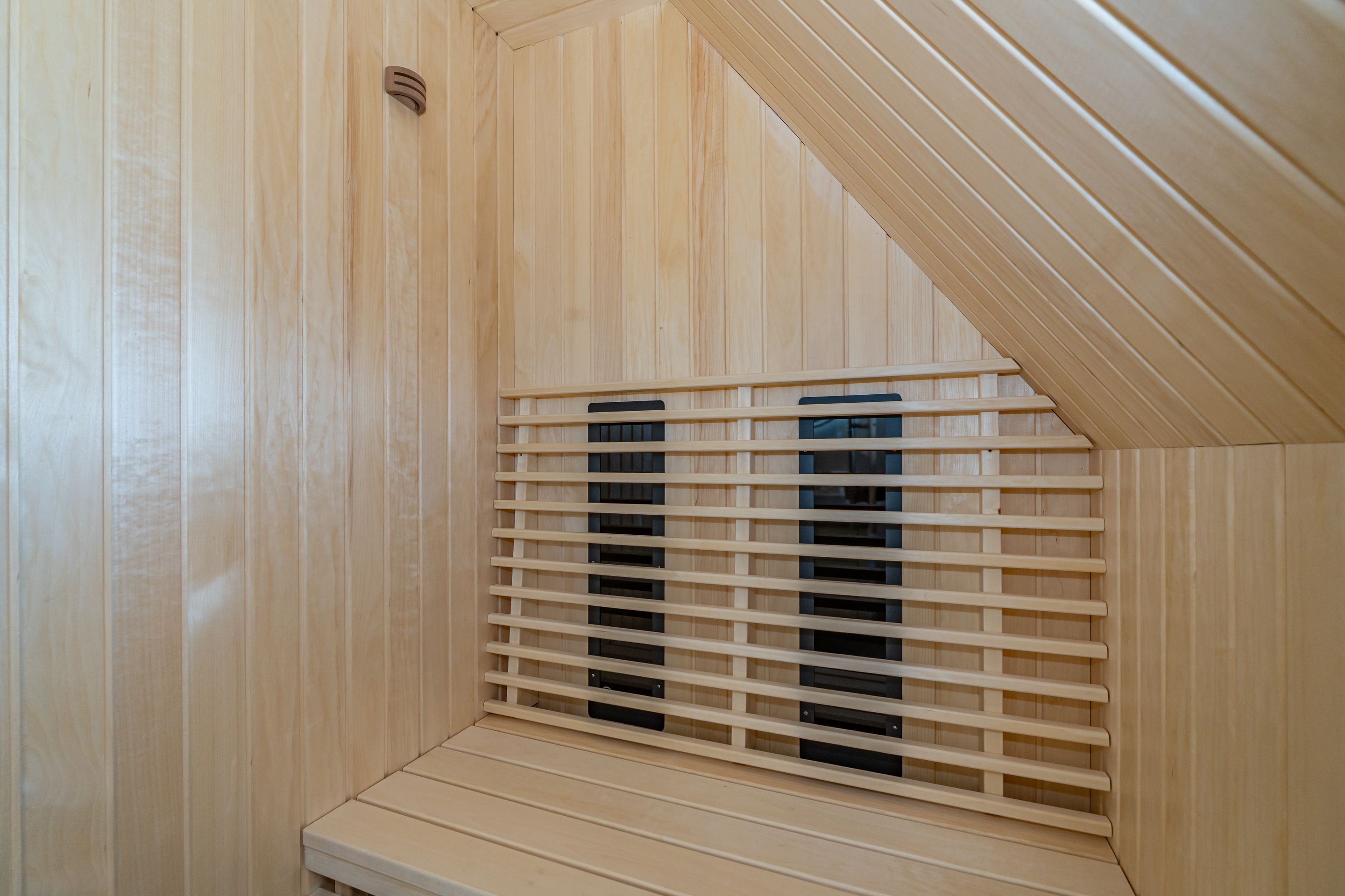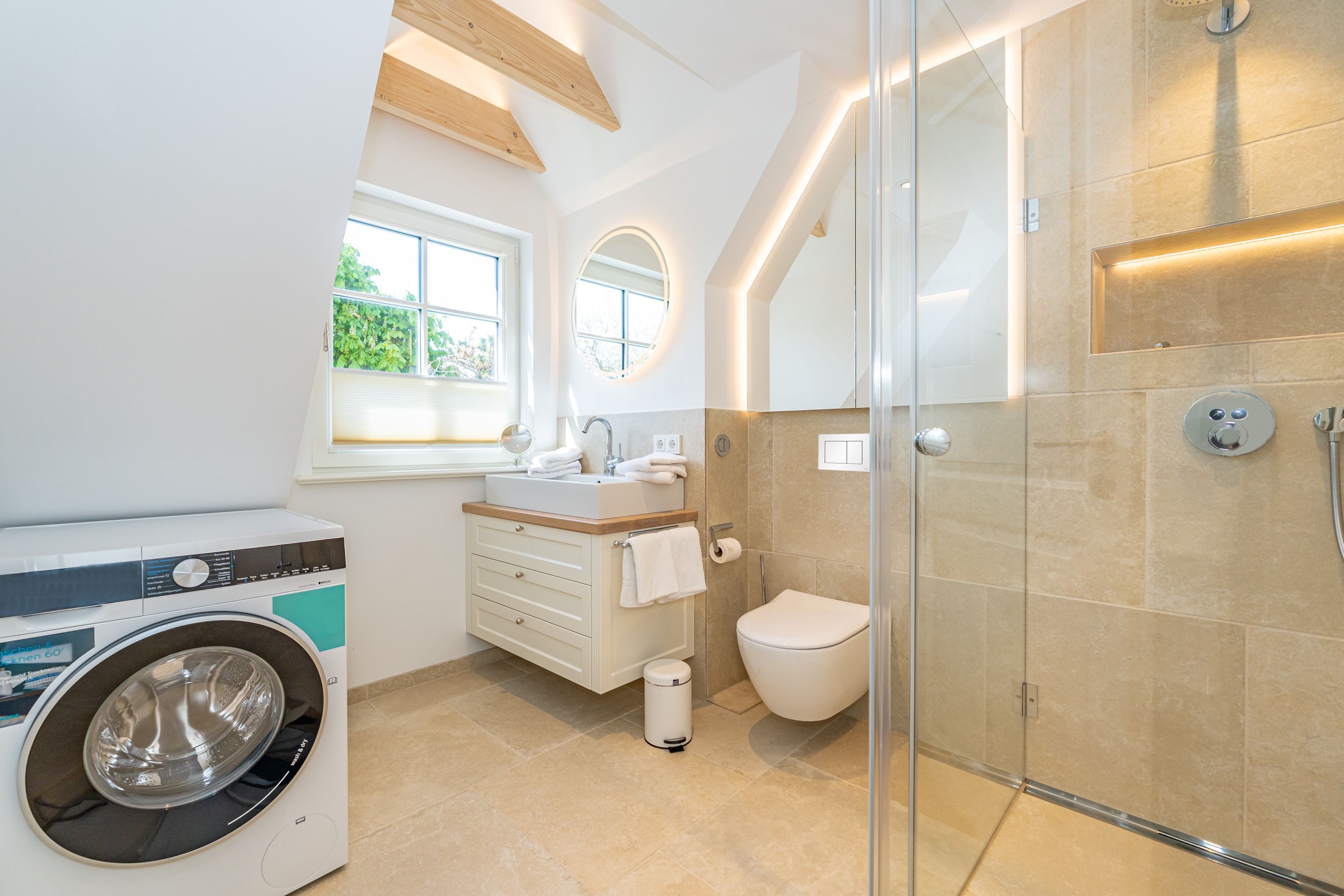 • Extra-Duschbad mit bodengleicher Dusche, Waschtisch, Handtuchwärmer, Haartrockner, Kosmetikspiegel, WC, Außenfenster und Infrarotsauna -für entspannte Momente
