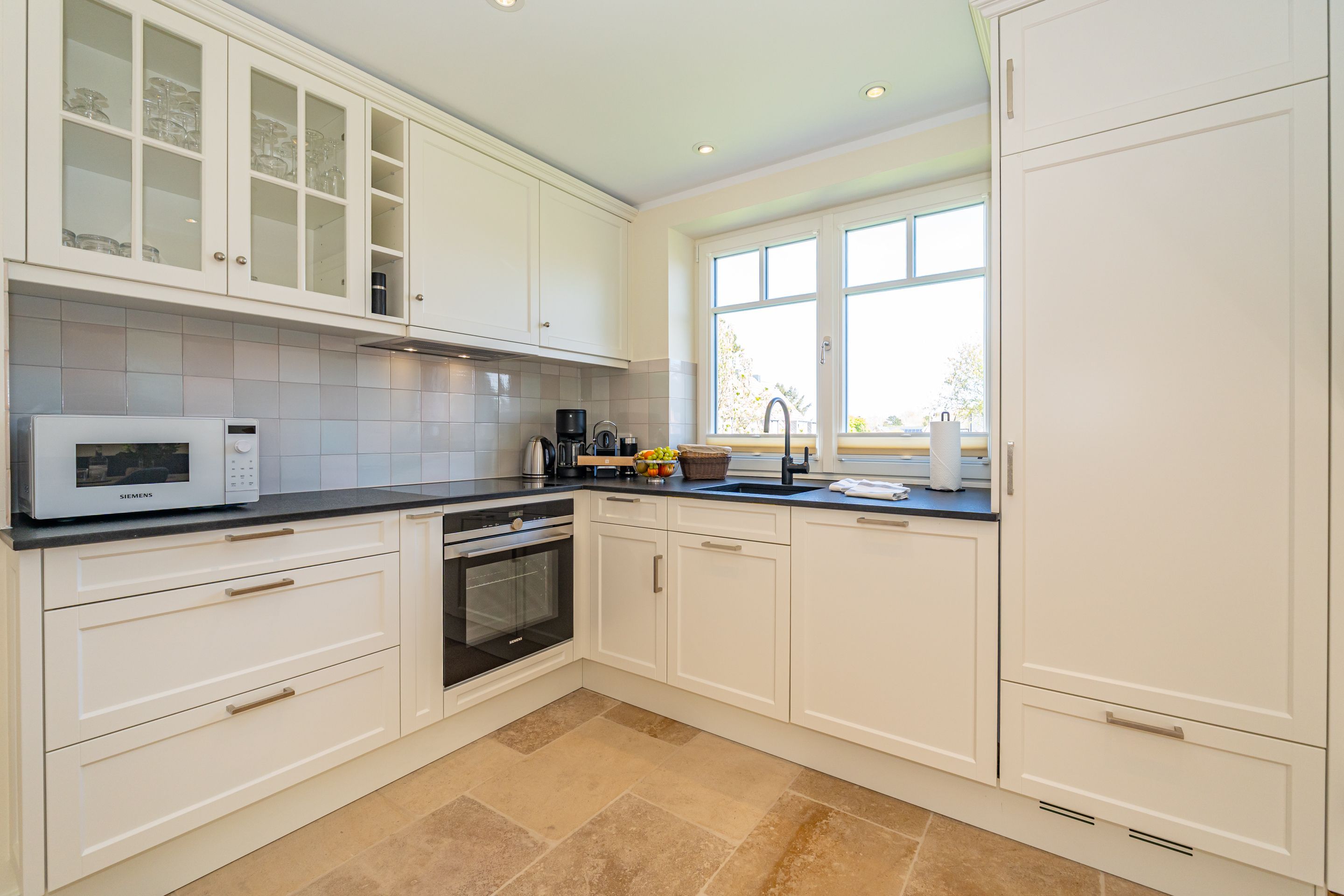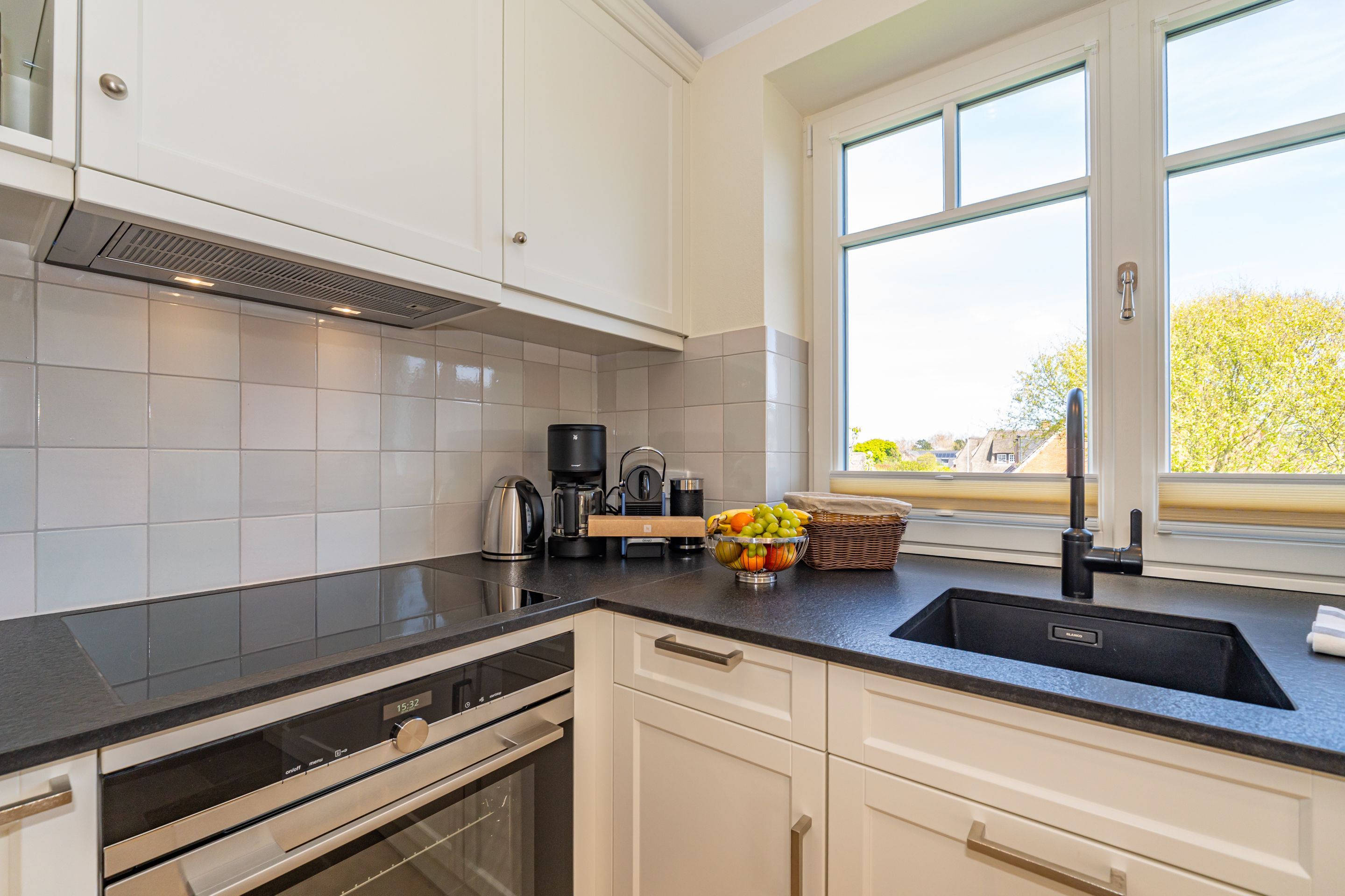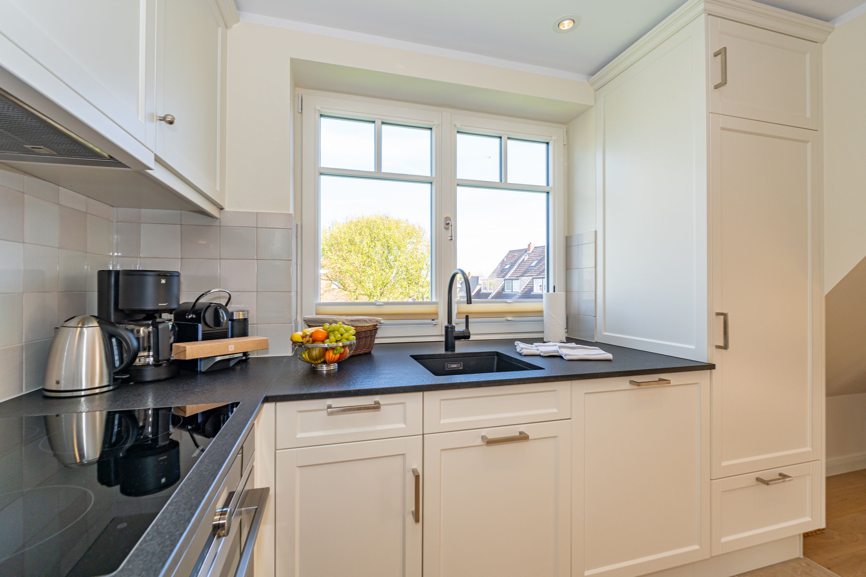 • Einbauküche mit Kücheninsel und Naturstein-Arbeitsplatte mit moderner Vollausstattung (Geschirrspülmaschine, Induktionsherd, Backofen, Mikrowelle, WMF-Kaffeemaschine und Nespresso-maschine, WMF-Wasserkocher, Toaster, Eierkocher, Zauberstab