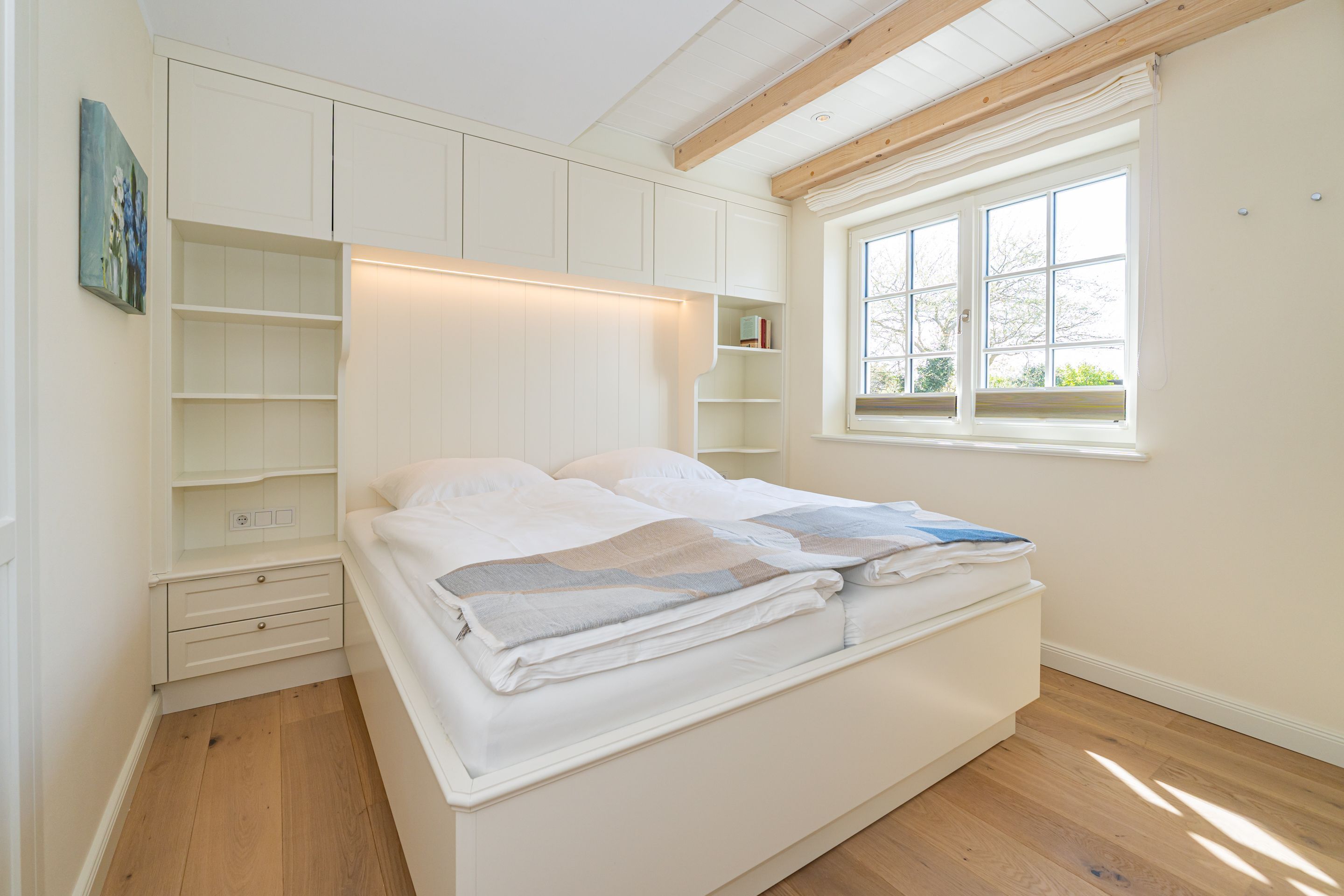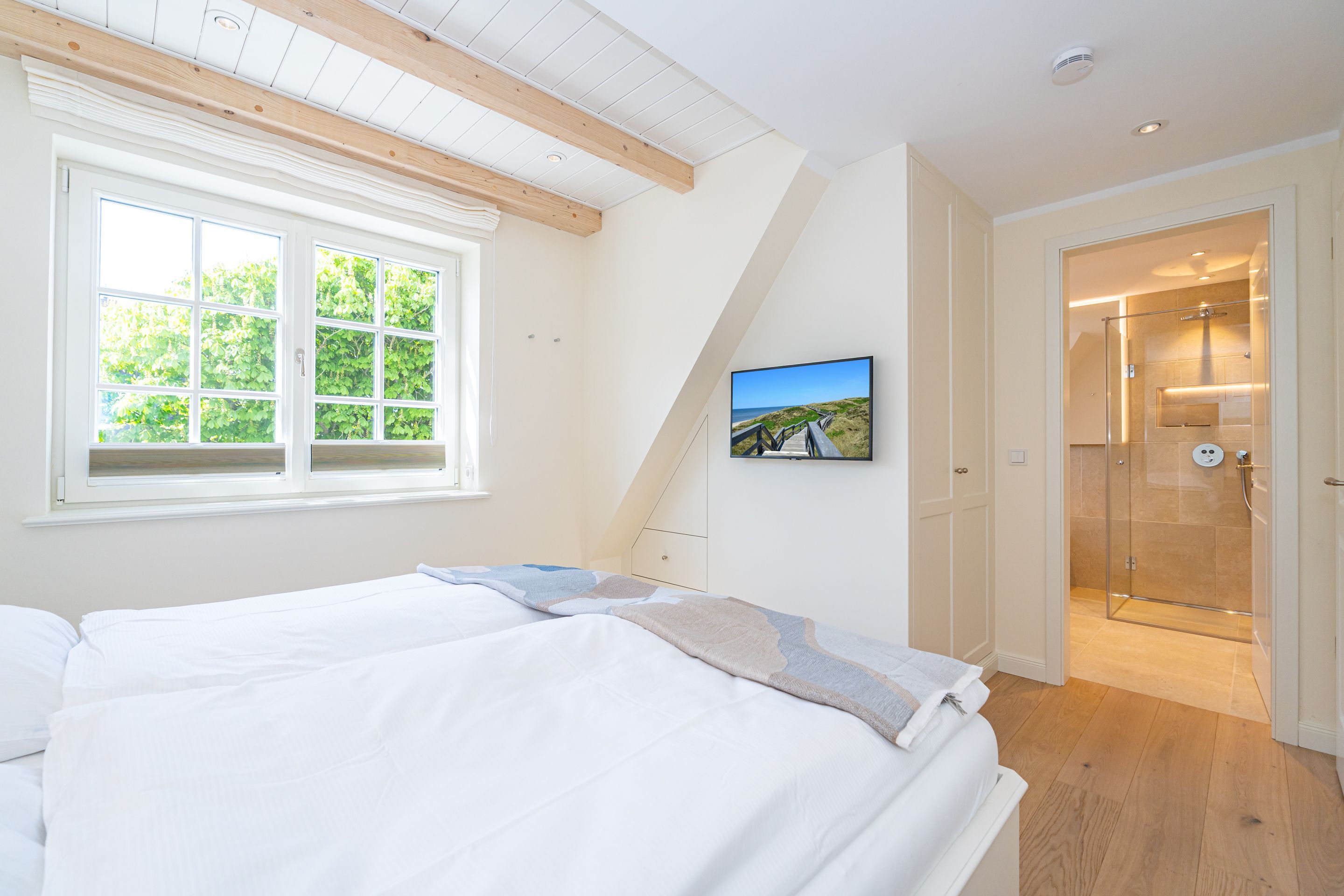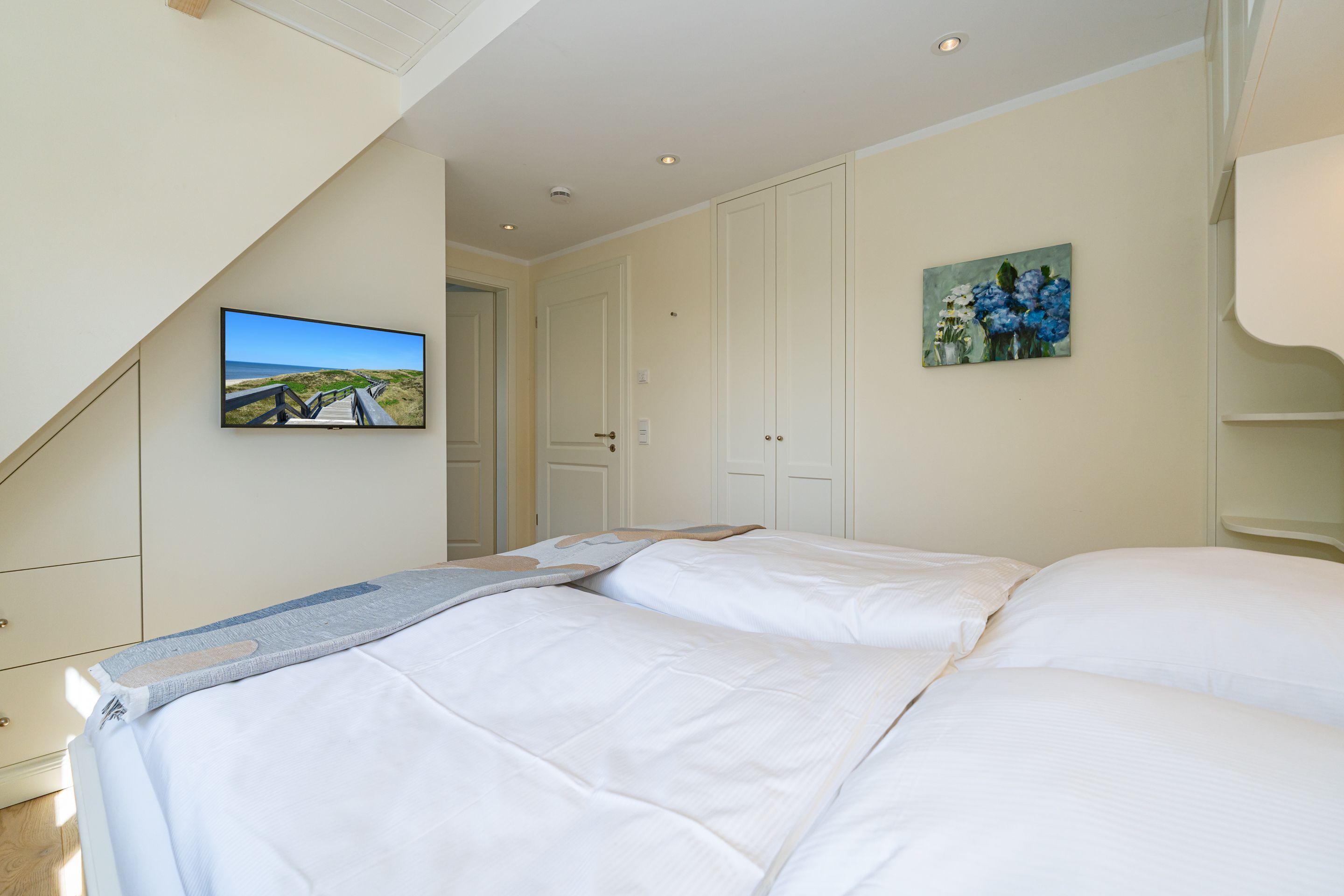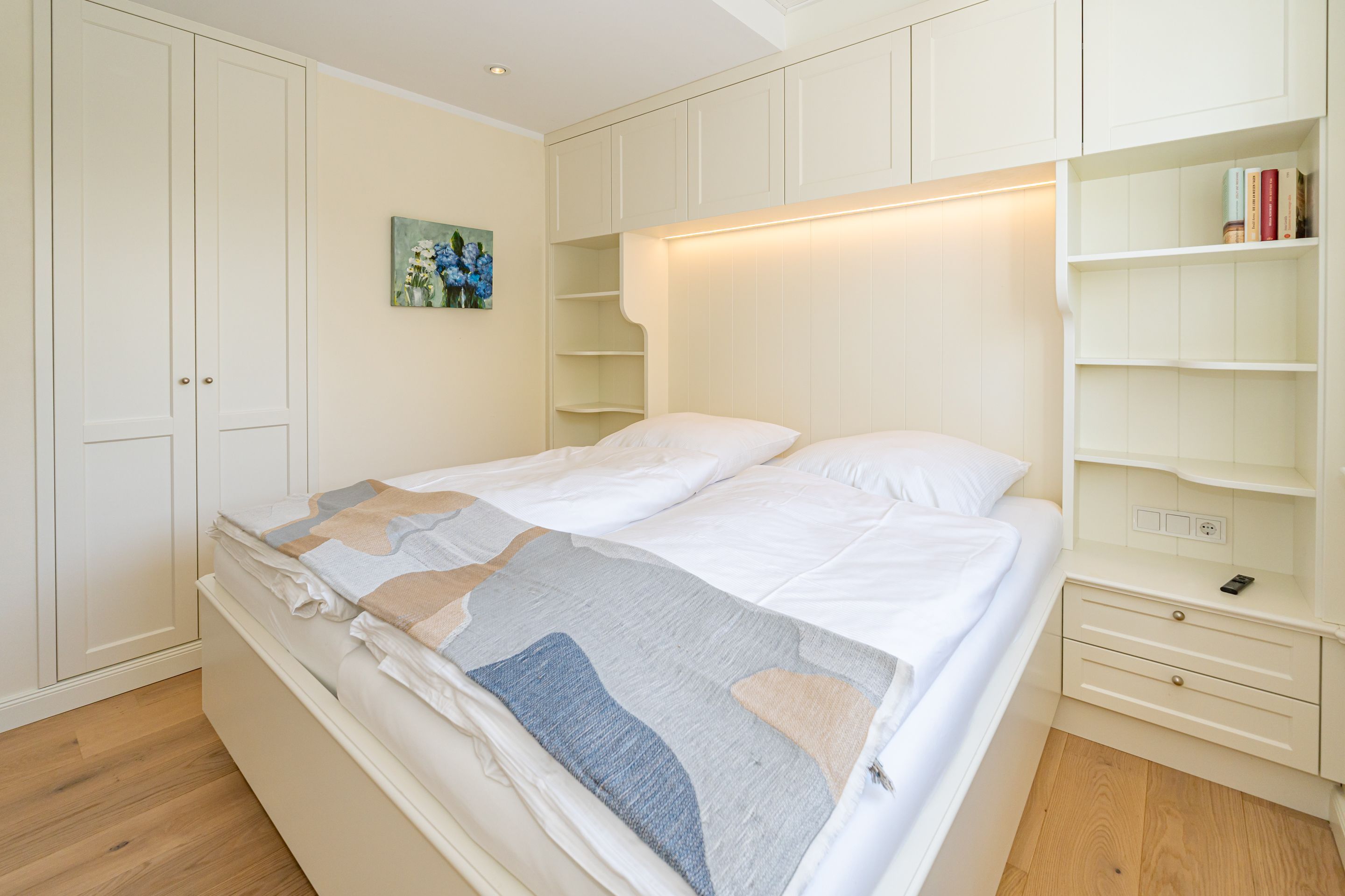 • 1 Master-Schlafzimmer mit Boxspring-Doppelbett (200 x 1,80 cm), Bad en Suite, Flachbild-TV (inkl. Wasch-Trockner), geräumige Einbauschränke