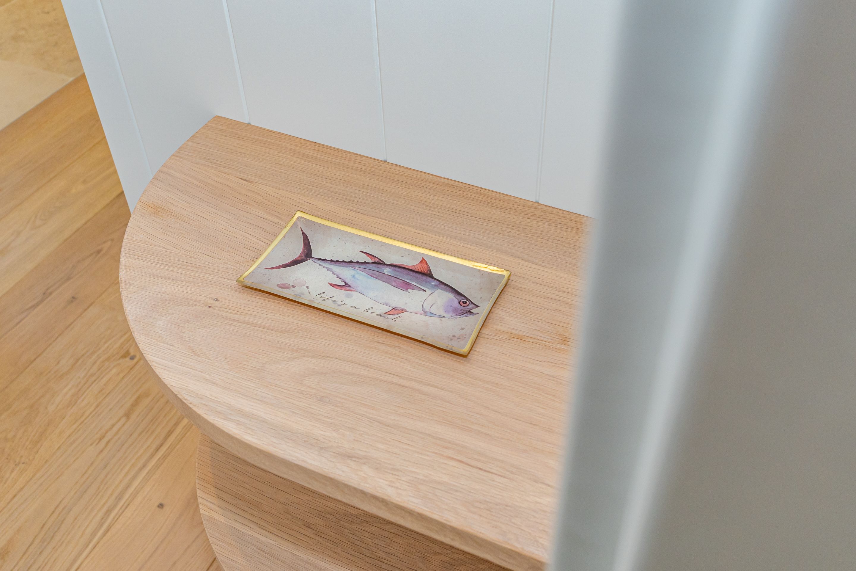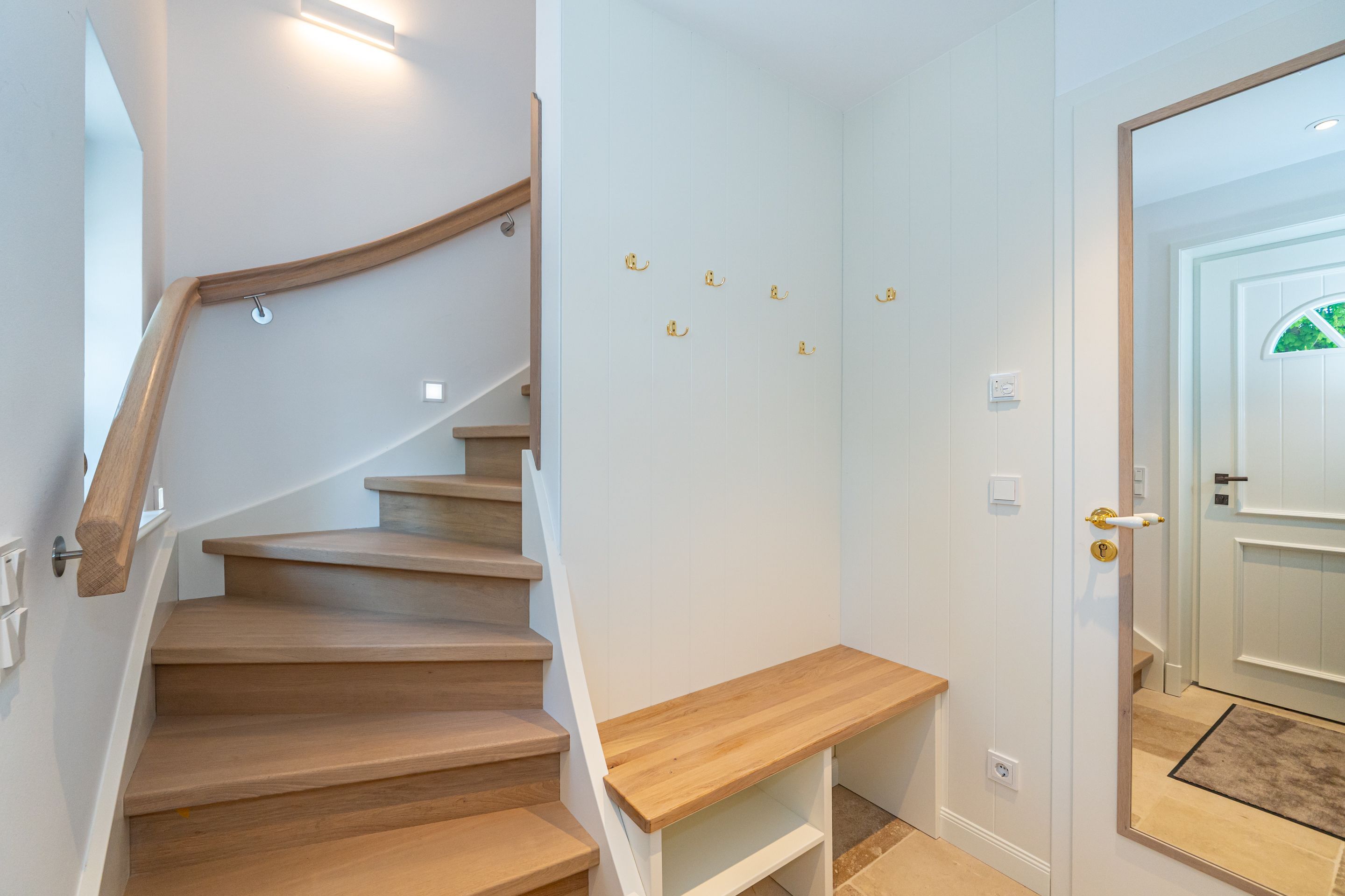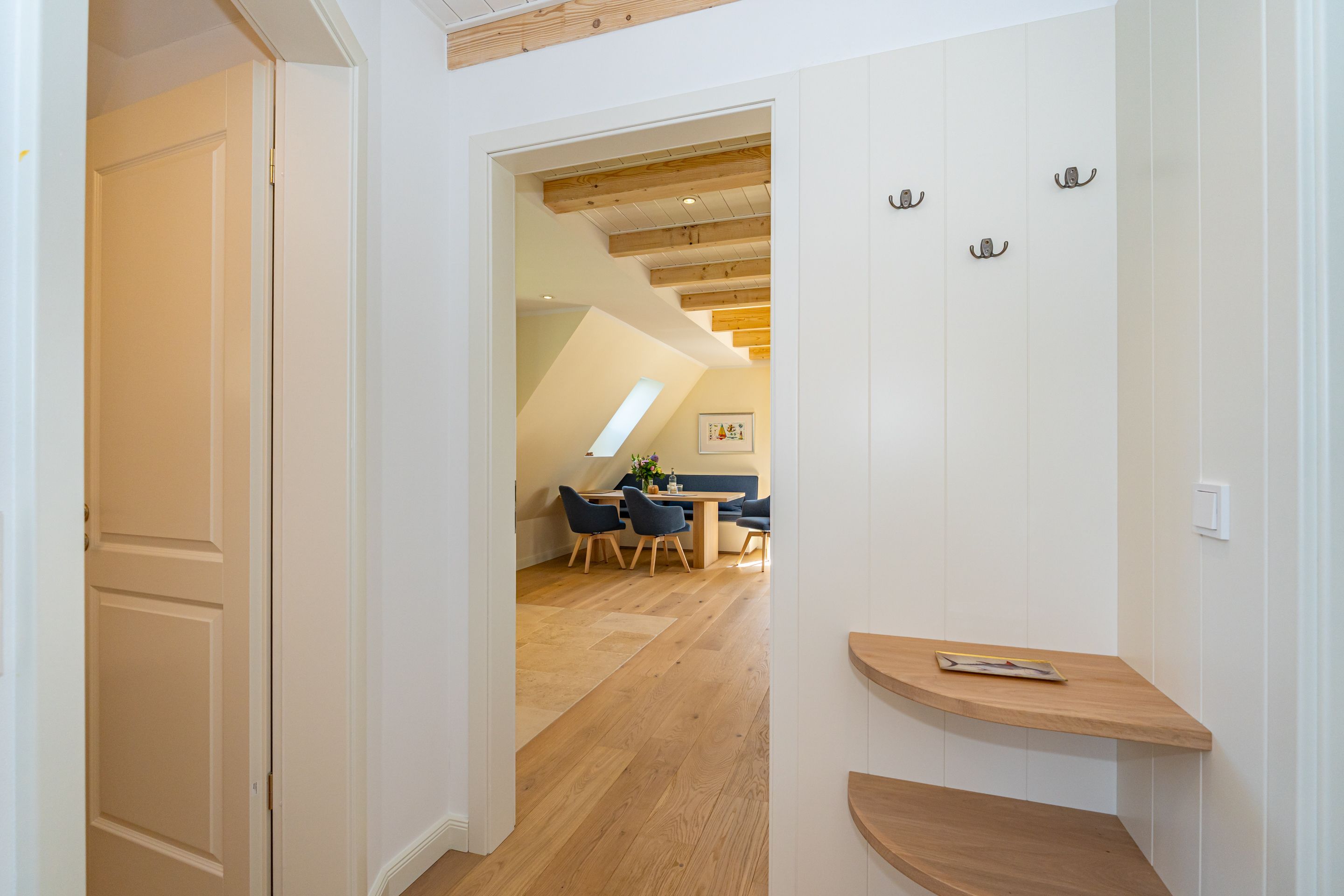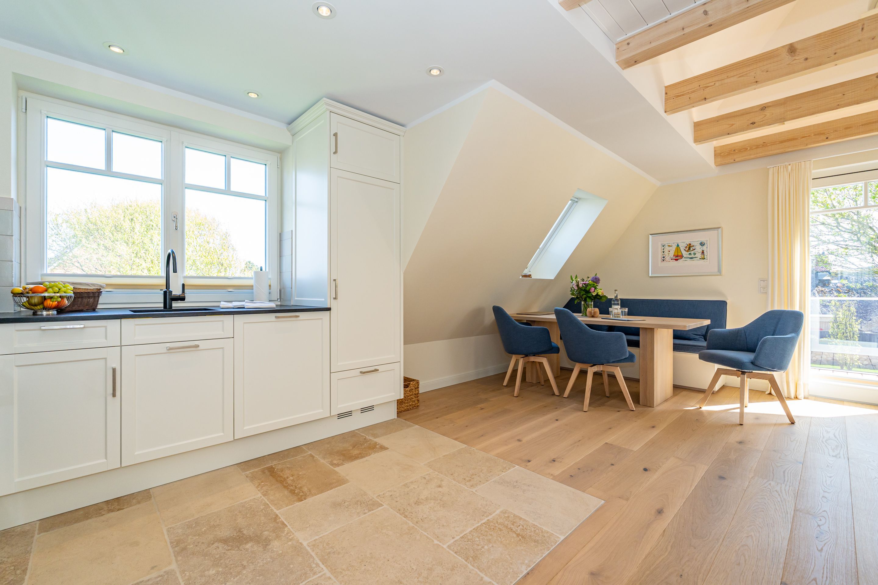 • Edle Materialien wie Holzplankenböden, Natursteinfliesen und -arbeitsplatte in Küchen und Bädern
