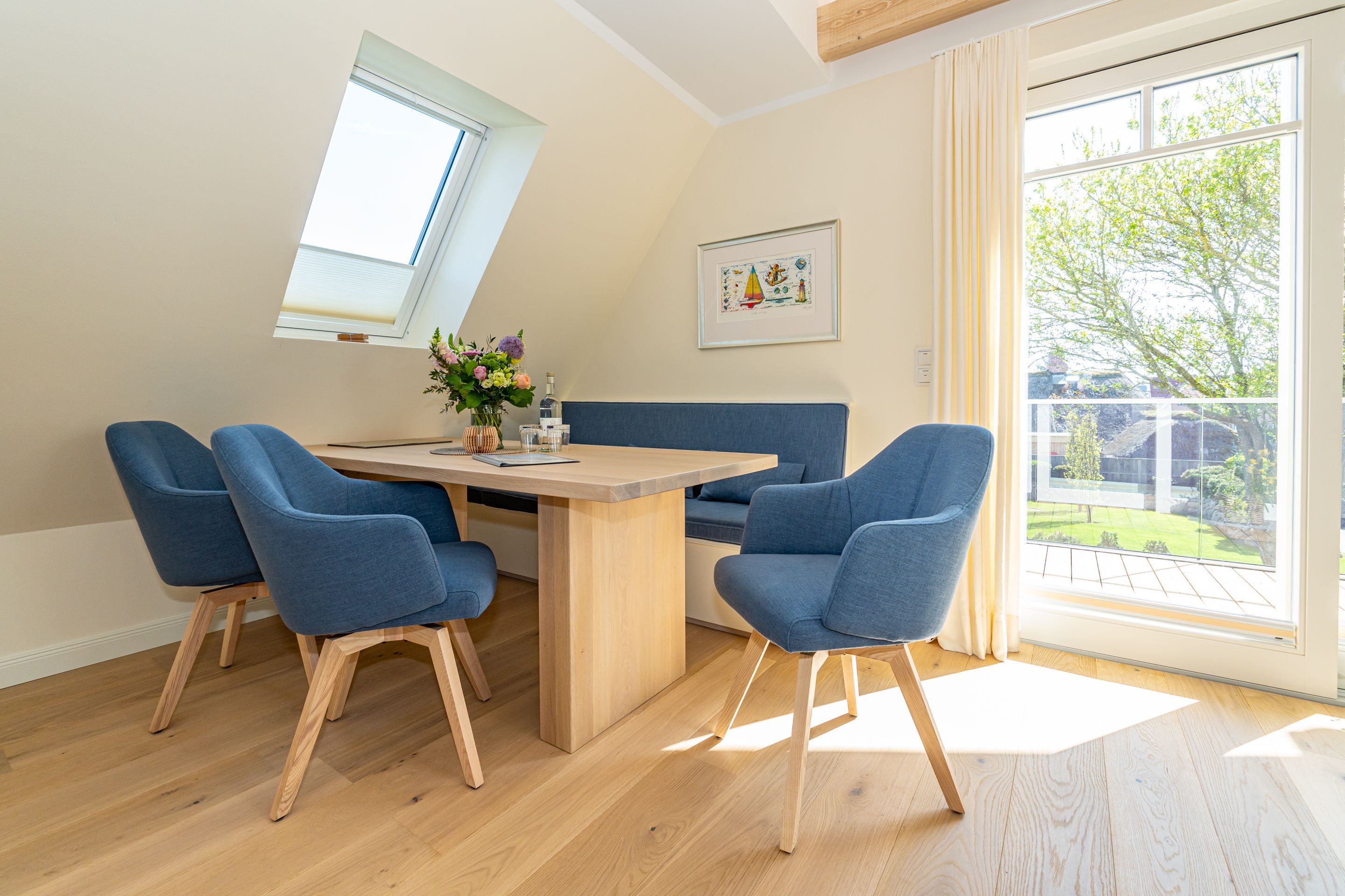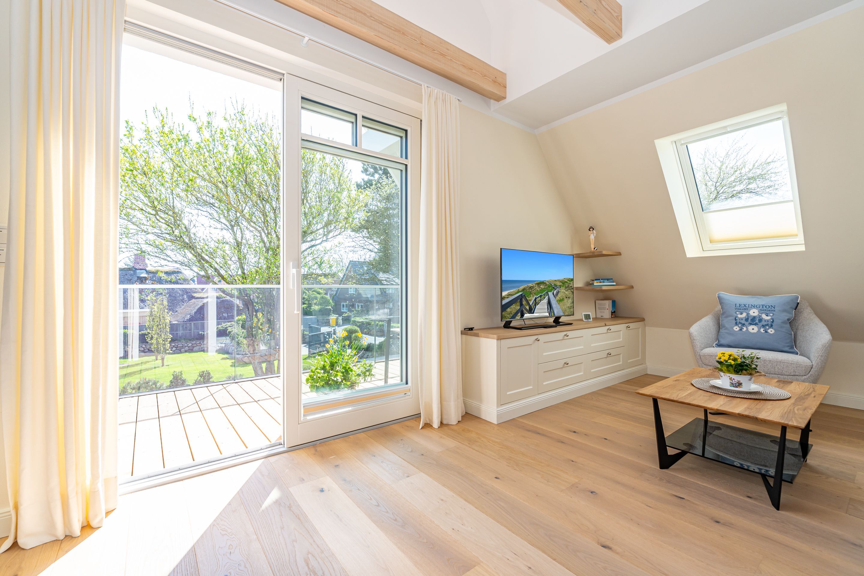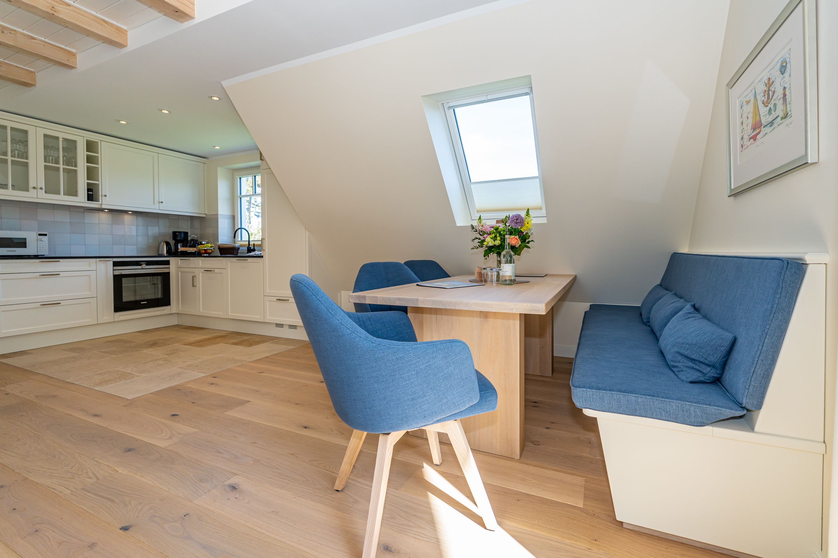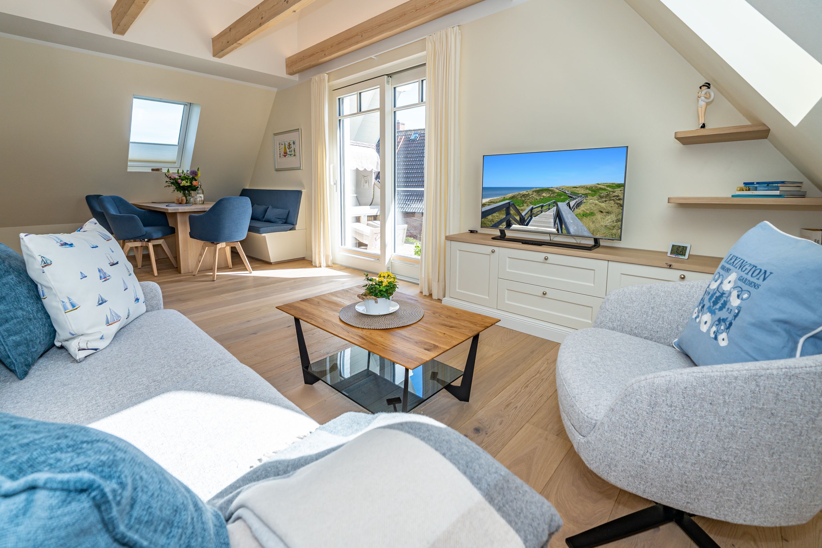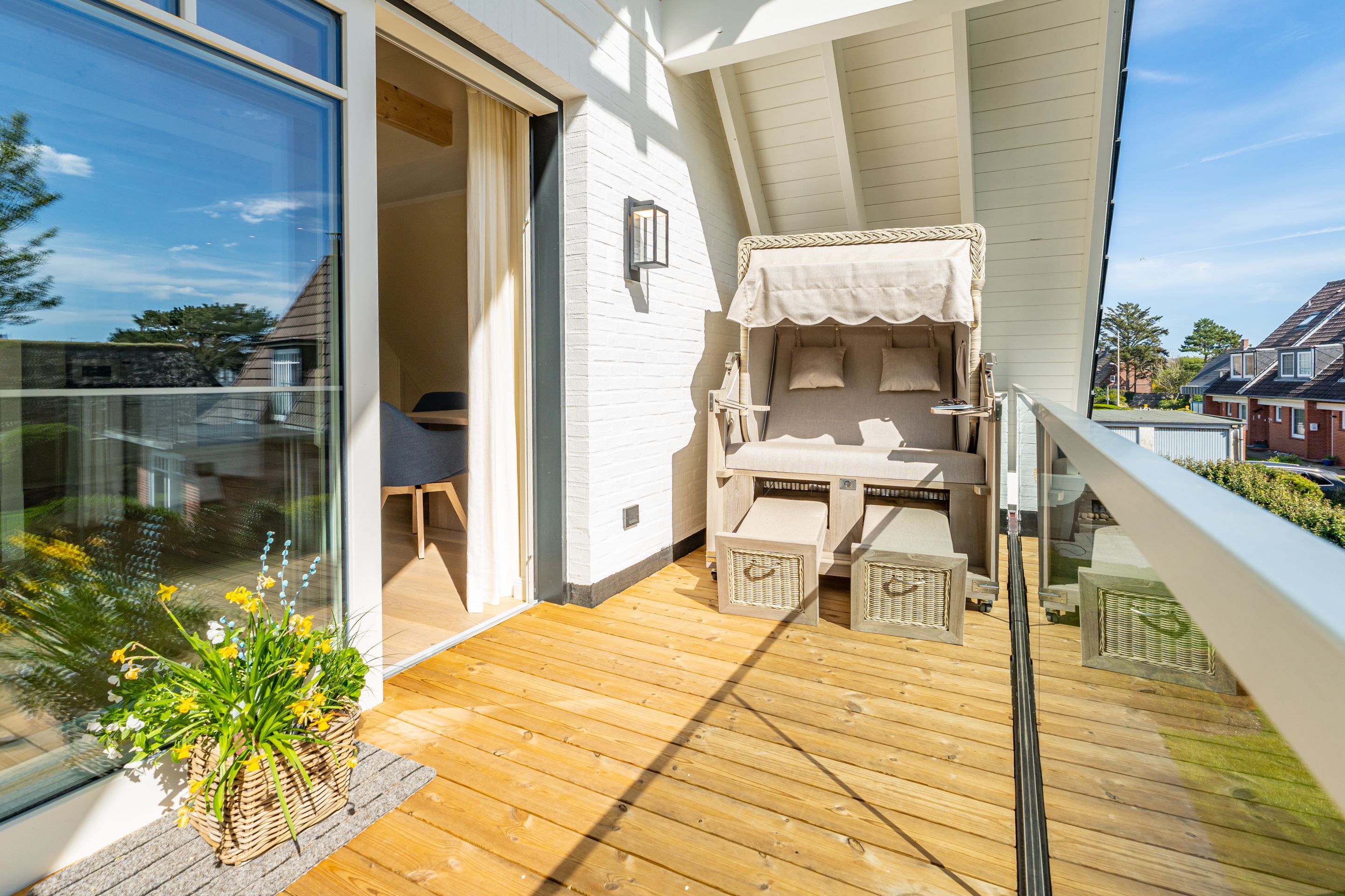 • großzügiger Wohn-/Essbereich mit offener Küche, großzügiger Essplatz für bis zu 6 Personen mit direktem Zugang zur 10 m² großen Süd-Loggia inklusive Strandkorb und Sitzecke - ideal für entspannte Stunden an der frischen Nordseeluft