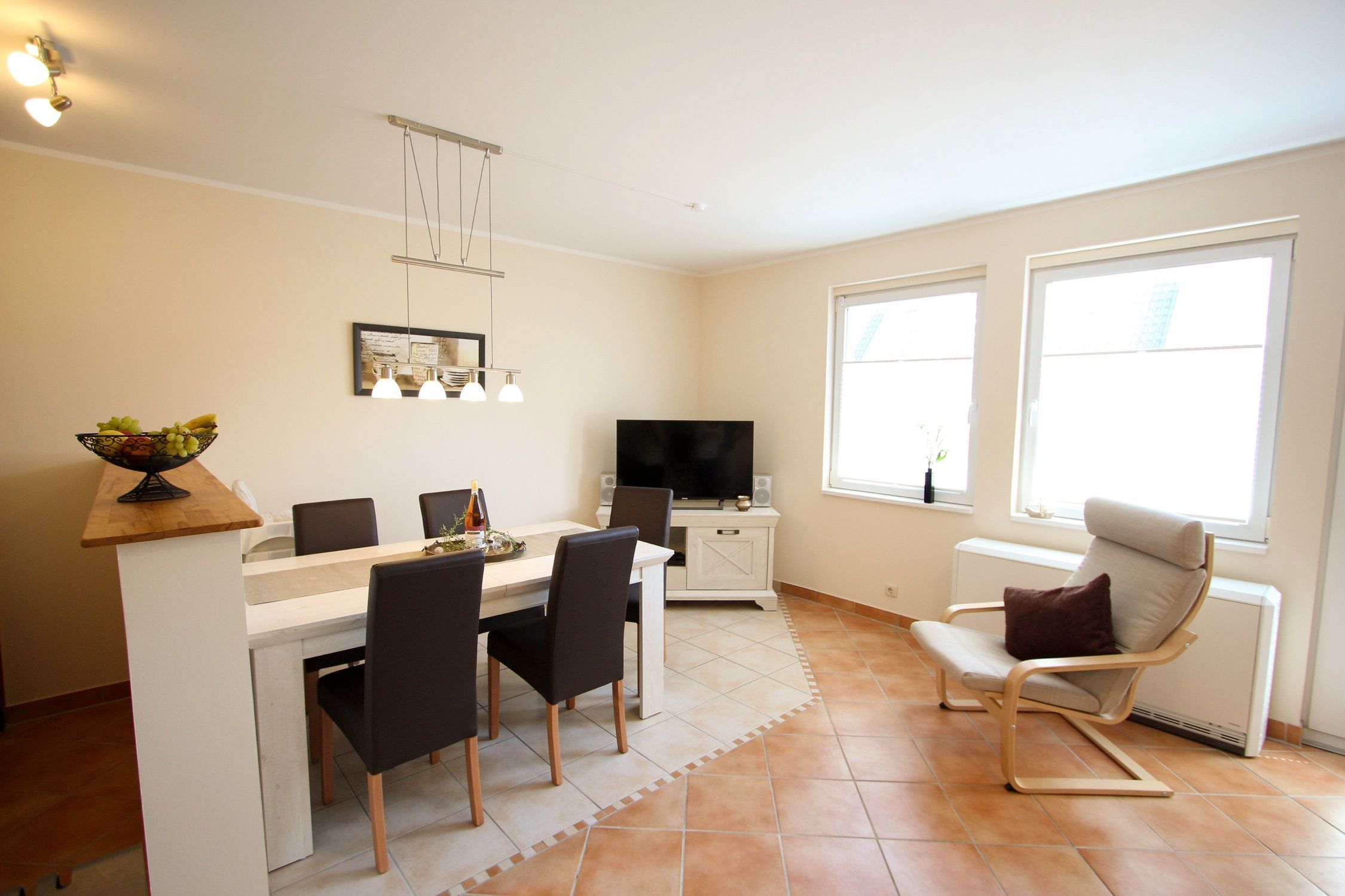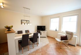 Die Ferienwohnung Steffchen EG ist Teil der idyllischen Ferienanlage Claus Störtebeker in Pruchten. Diese ruhige Siedlung bietet Erholung pur und ist ideal für Naturliebhaber und Ruhesuchende. Das Objekt besticht durch seine durchdachte Ausstattung, die sowohl Komfort als auch Funktionalität vereint. Neben einem Kamin für gemütliche Abende verfügt die Wohnung über eine moderne Küche mit Backofen, Ceran-Kochfeld, Geschirrspüler und weiteren Annehmlichkeiten. Ein besonderes Highlight ist der kleine Garten mit einer möblierten Terrasse, die zu entspannten Stunden im Freien einlädt. Ein Parkplatz ist direkt am Haus vorhanden. Familien mit Kindern, Hundebesitzer und Radfahrer finden hier die perfekte Unterkunft für einen erholsamen Urlaub. Die Nähe zum Bodden und zu zahlreichen Rad- und Wanderwegen ermöglicht abwechslungsreiche Aktivitäten in der Natur.